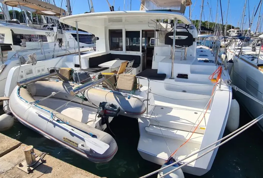 | Outside | 12 V-Anschluss, 220 V Landstromkabel mit Ladegerät, Badeleiter, Biminitop, Bootshaken, Cockpitdusche, Cockpitlautsprecher, Cockpitpolster, elektr. Ankerwinsch, Fender, Gangway, Wasserschlauch |