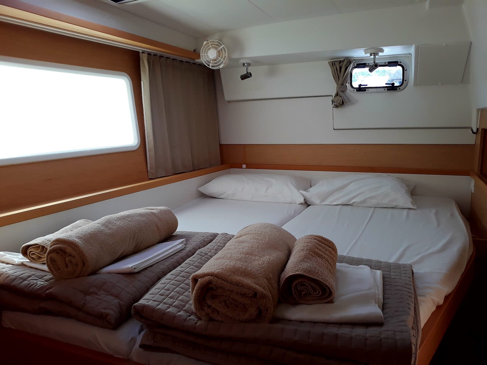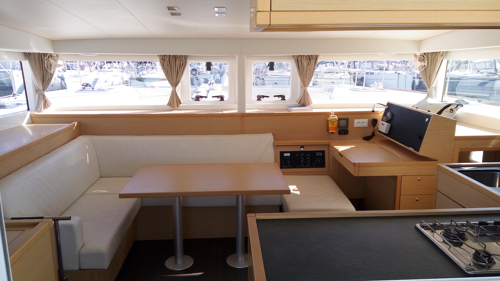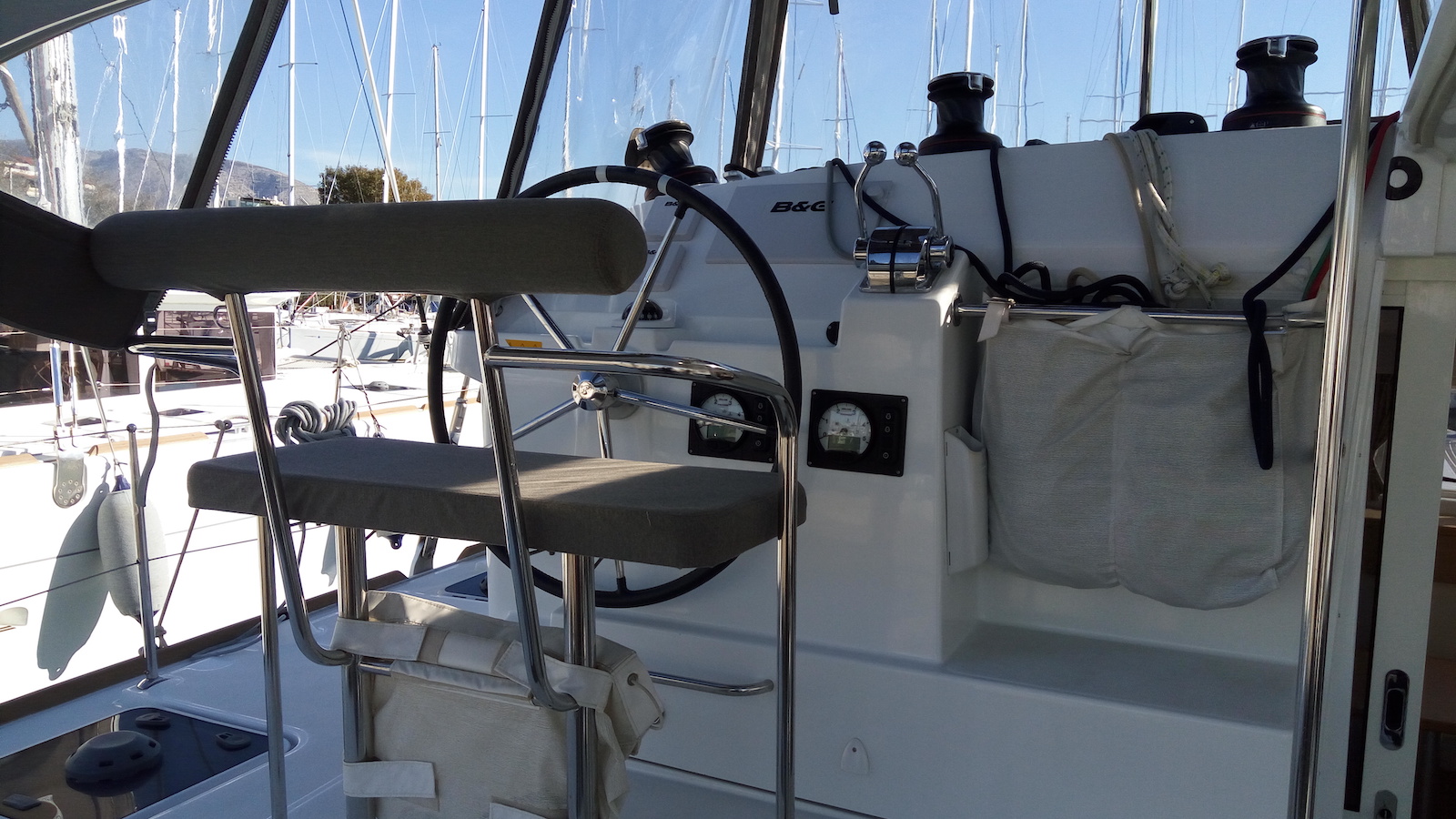 | Outside | 12 V-Anschluss, 220 V-Landanschluss, Anker mit Kette, Biminitop, Cockpitdusche, Cockpitlautsprecher, Cockpittisch, Cockpittisch mit Eisbox, Davits, elektr. Ankerwinsch, elektr. Winsch, Gangway, Schnorchelausrüstung, Solaranlage, Sprayhood, Windex |