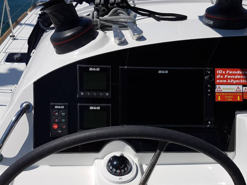 | Outside | Außendusche, Badeleiter, Biminitop, Cockpitlautsprecher, Cockpittisch, elektr. Ankerwinsch, hydraul. Gangway, Solaranlage, Sprayhood, Teak im Cockpit |