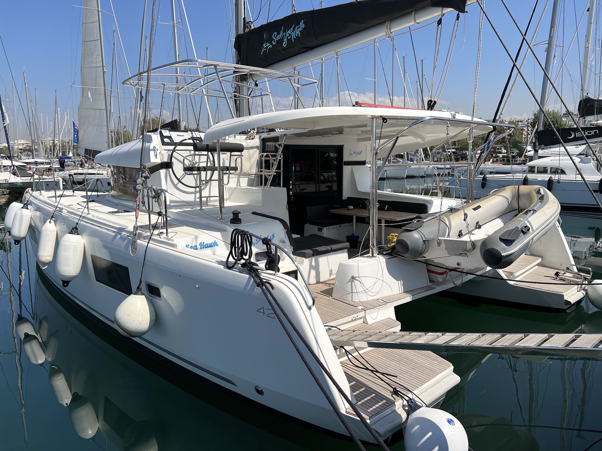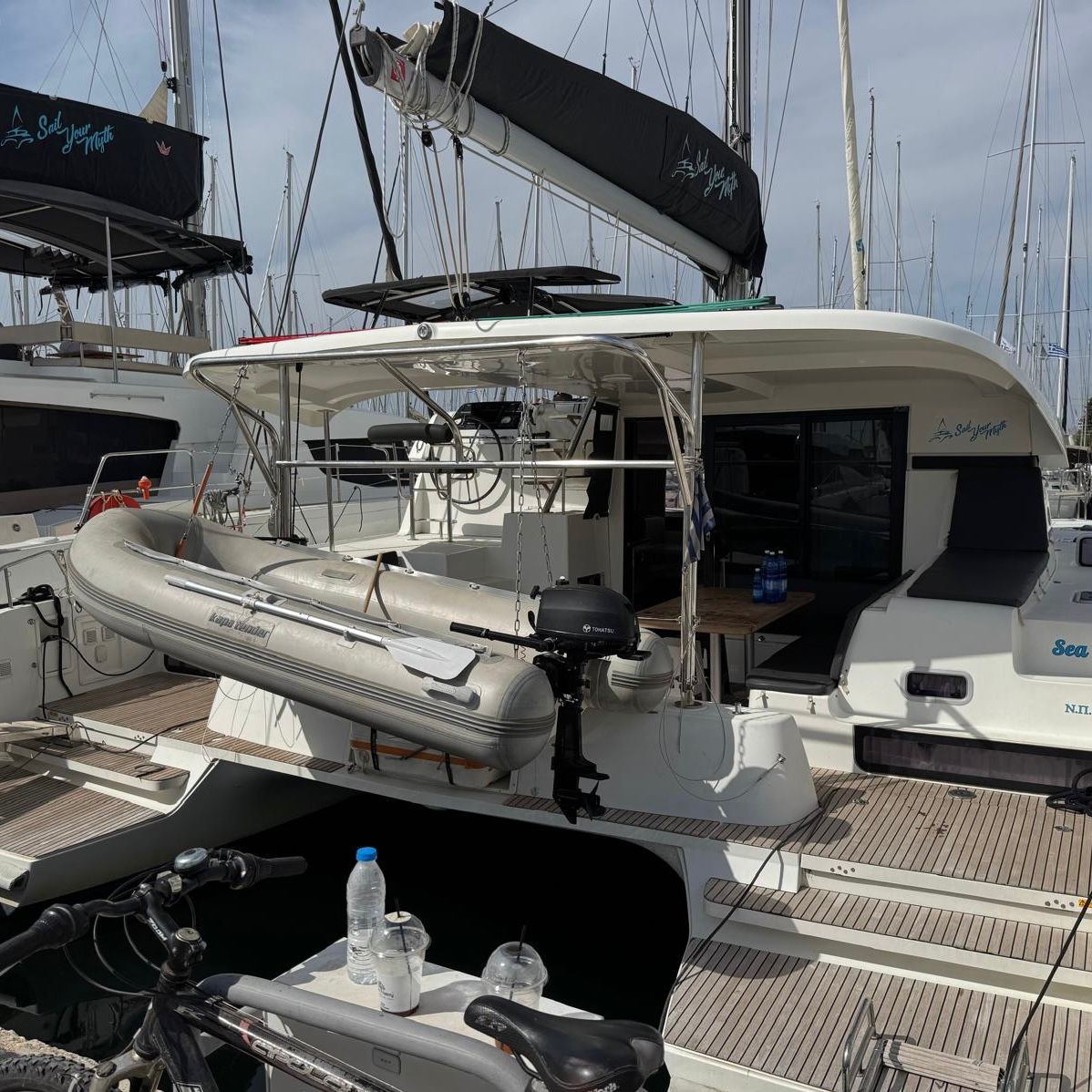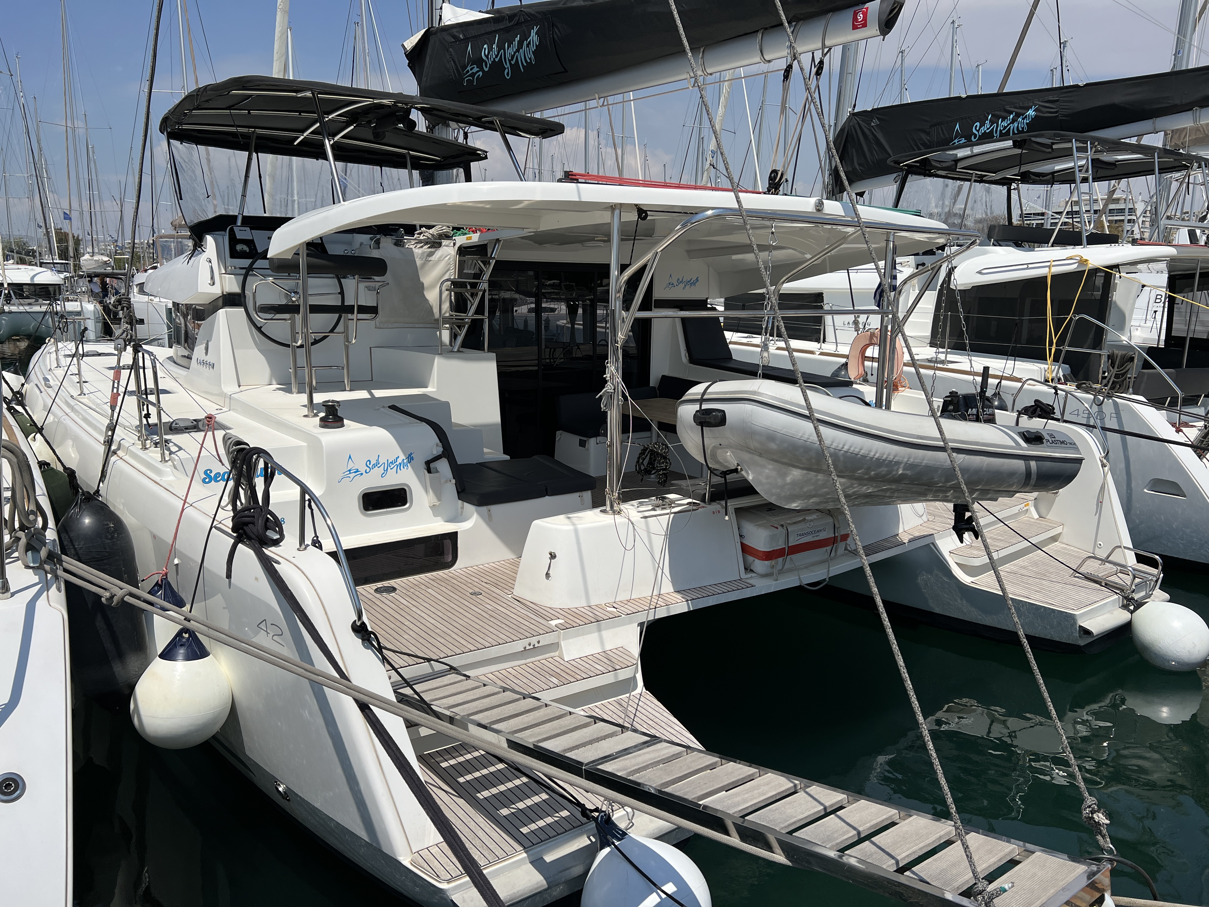 | Outside | 220 V-Landanschluss, Anker mit Kette, Badeleiter, Biminitop, Cockpitdusche, Cockpitlautsprecher, Cockpitpolster, Deckpolster, elektr. Ankerwinsch, elektr. Winsch, Fender, Gangway, Segel-Flickwerkzeug, Solaranlage, Sprayhood, Teak-Achterdeck |