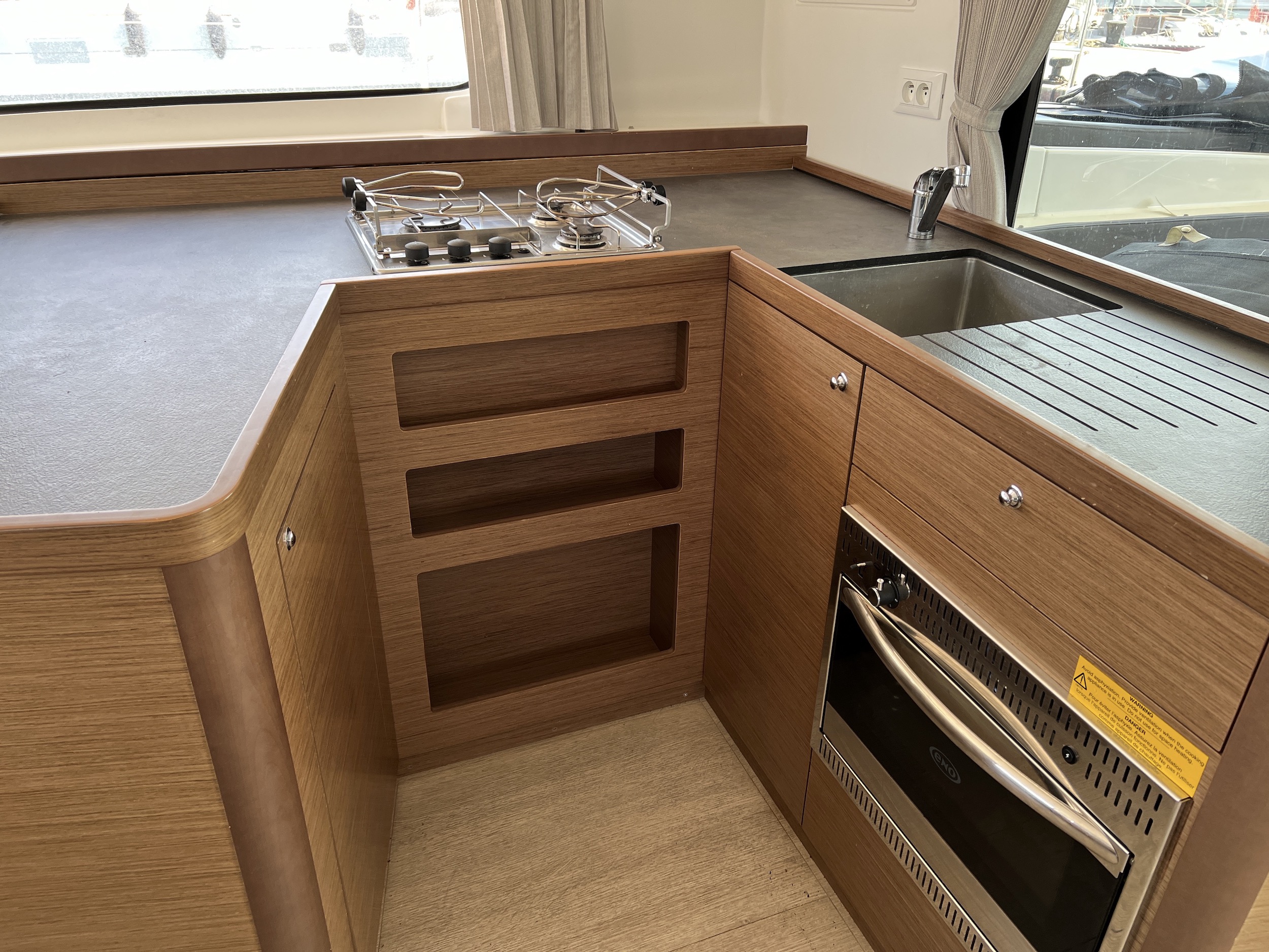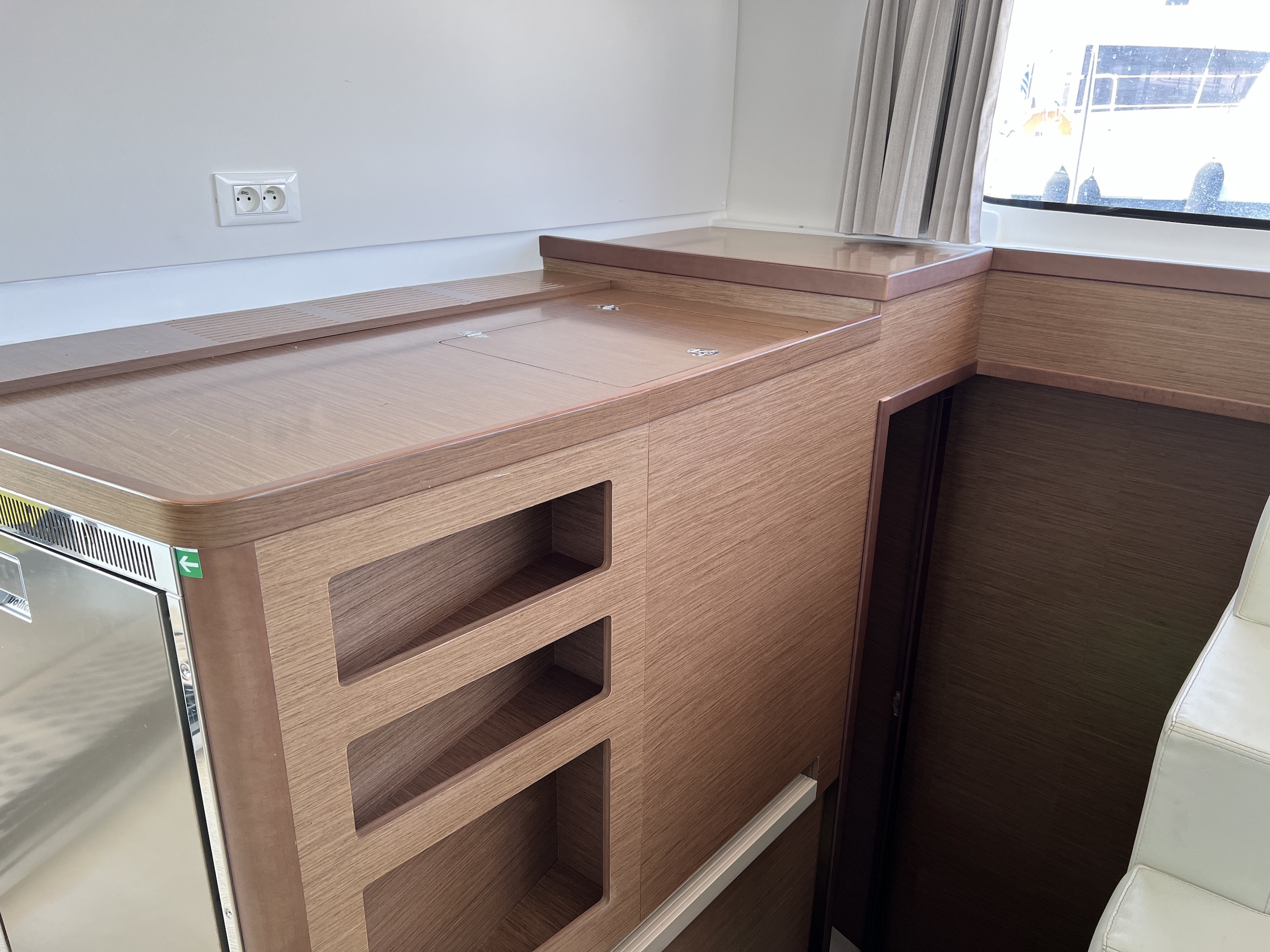 | Inside | FUSION Sound System, Gasherd mit Backofen, Gefrierschrank, Generator, Heizung, Klimaanlage (ohne Landstrombedarf), Kühlschrank, Nespresso-Maschine, Pantryausstattung, Radio mit Bluetooth, Salontisch absenkbar, Spülbecken, Ventilatoren in Kabinen |
