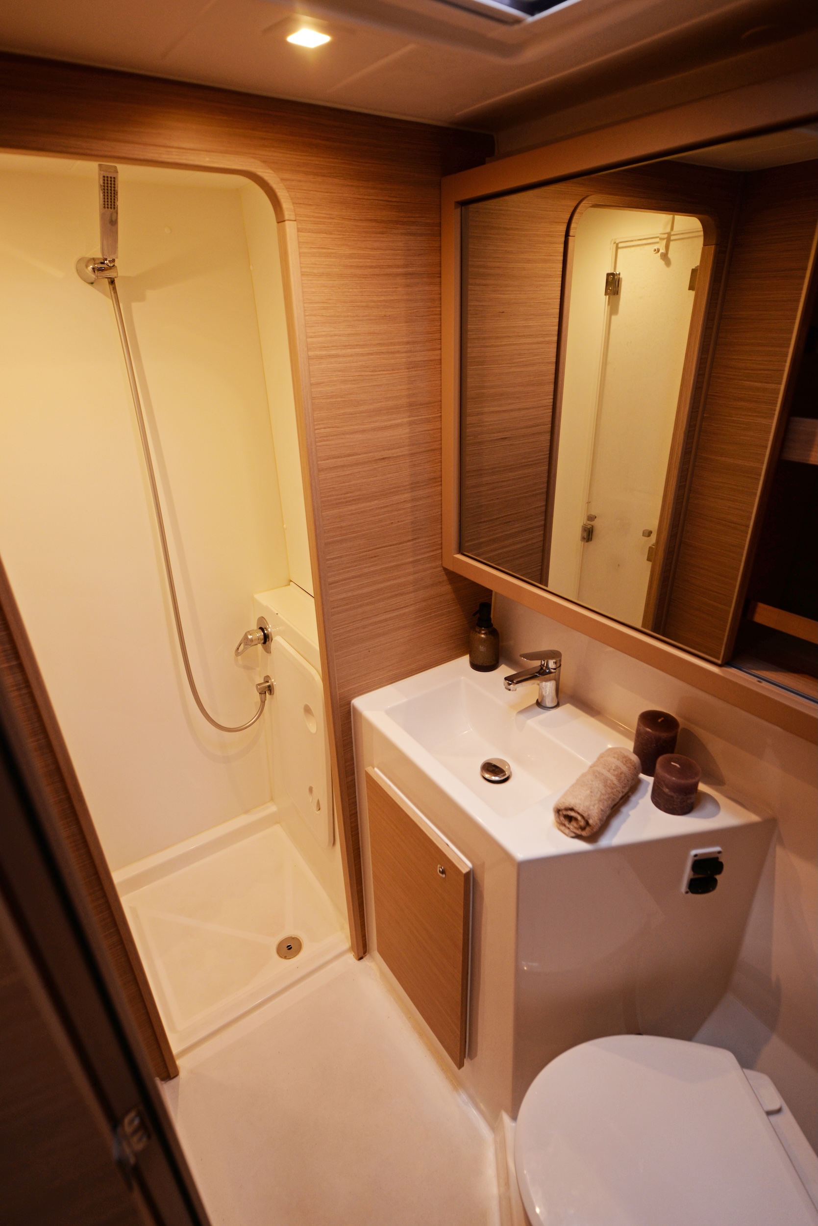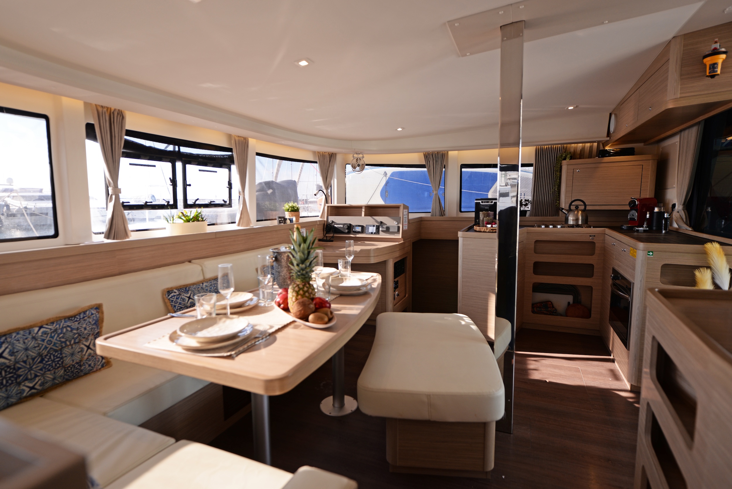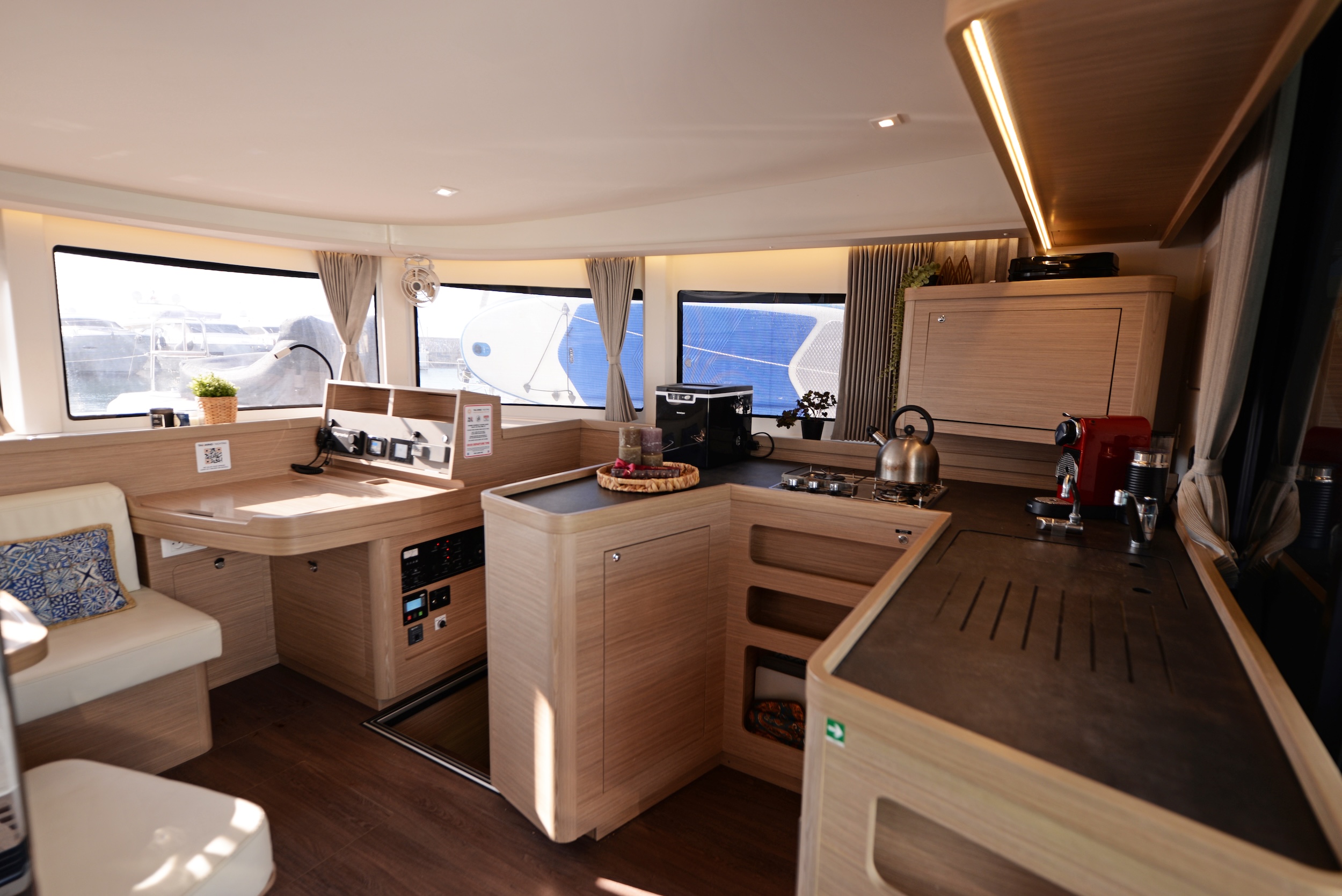 | Inside | Eiswürfelmaschine, Gefrierschrank, Generator, Inverter 12V/220V, Klimaanlage (ohne Landstrombedarf), Nespresso-Maschine, Pantryausstattung, TV, Ventilator, Warmwasser, Watermaker |