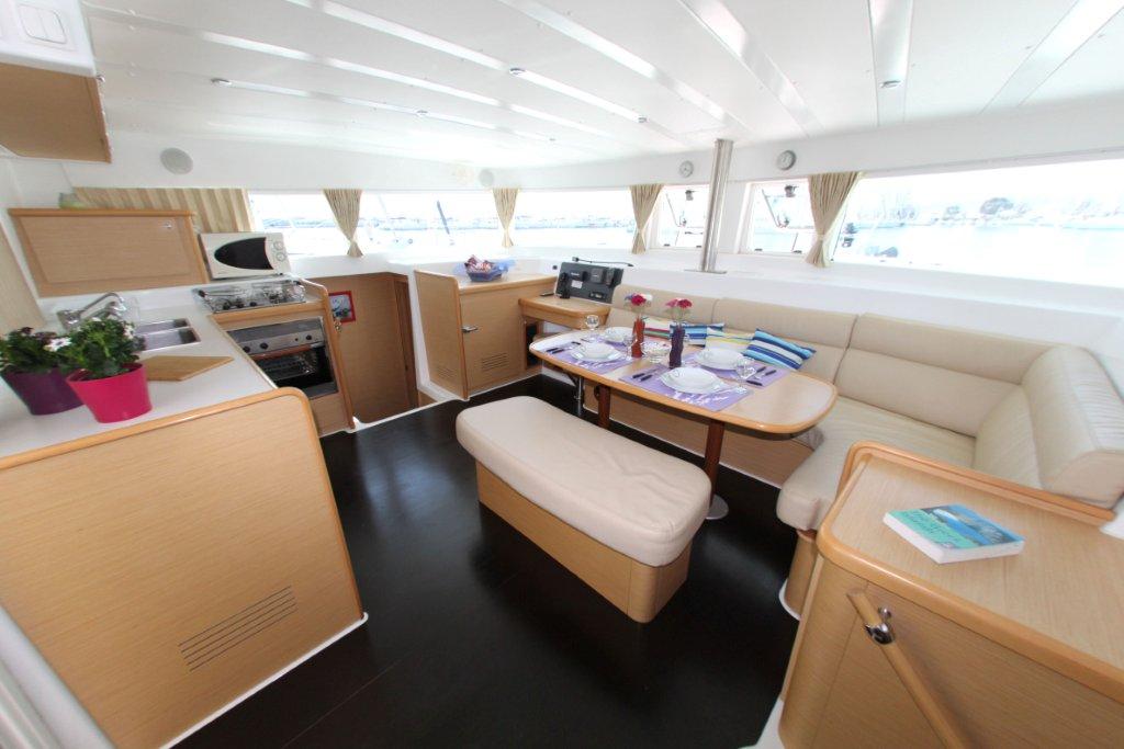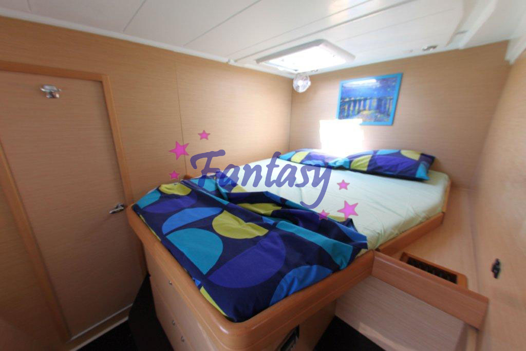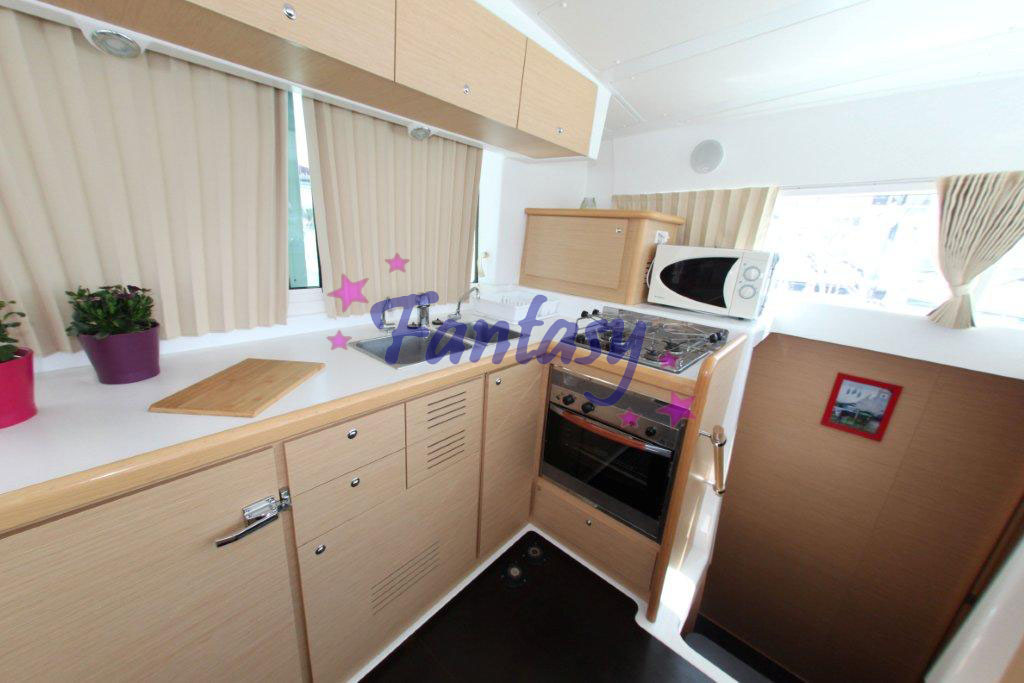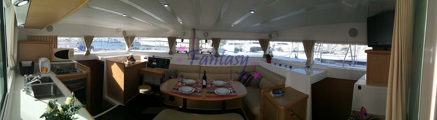 | Inside | Fäkalientank, Gasherd, Gefrierschrank, Generator, Heizung, Inverter 12V/220V, Kaffeemaschine, Klimaanlage (ohne Landstrombedarf), Kühlschrank, LED-Innenleuchten, Moskitonetze, Pantryausstattung, Radio mit CD, MP3, AUX-In, Salontisch absenkbar, TV + DVD, Ventilatoren in Salon und Kabinen, Wasserkocher, WC (elektr.) |