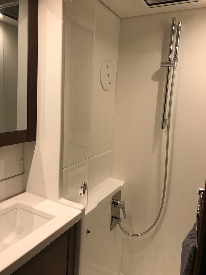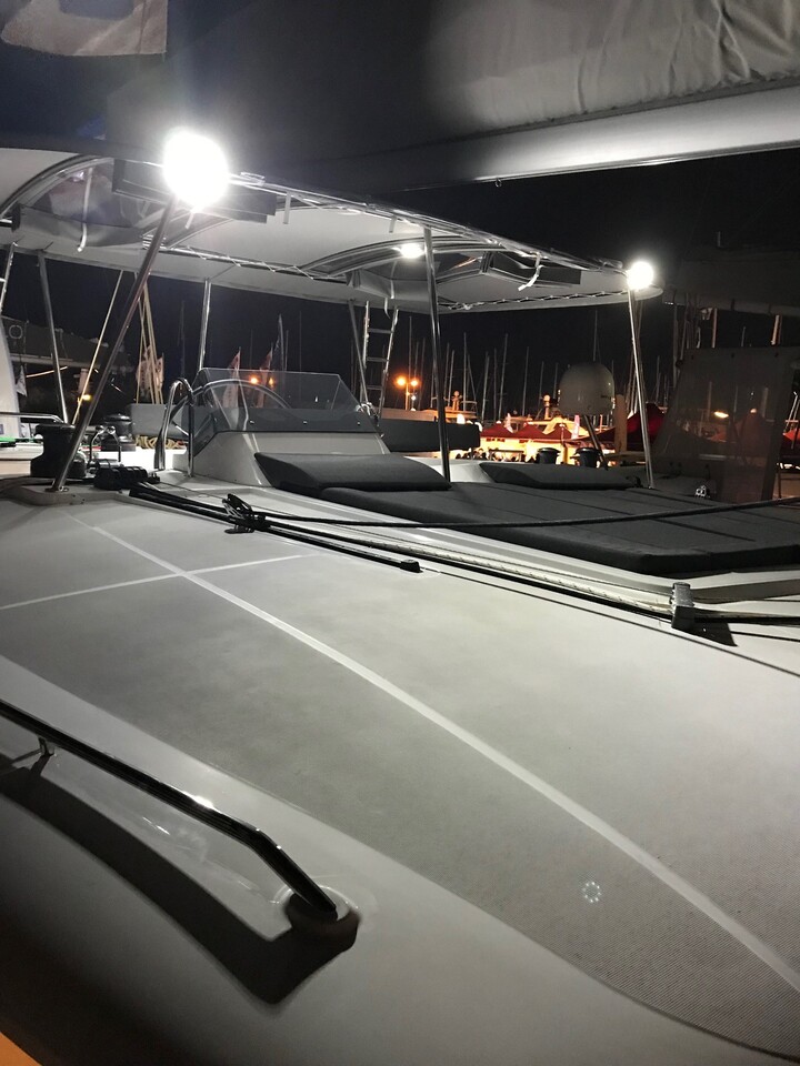 | Outside | Anker mit Kette, Badeleiter, Benzinkanister, Biminitop, Bootshaken, Cockpitpolster, Deckbürste, elektr. Ankerwinsch, Fender, Festmacherleinen, hydraul. Gangway, Kunststoff-Eimer (Pütz), Sprayhood, Wantenschneider, Winschen |