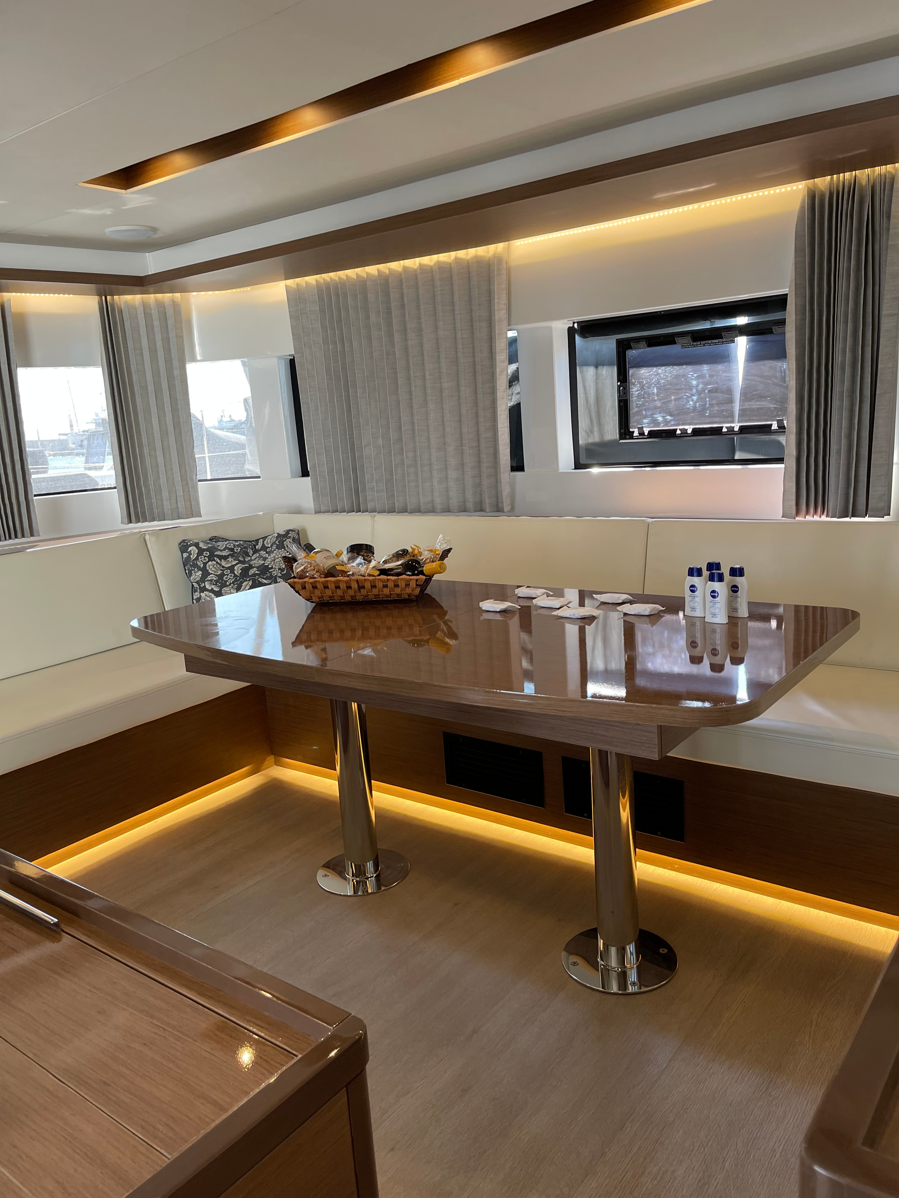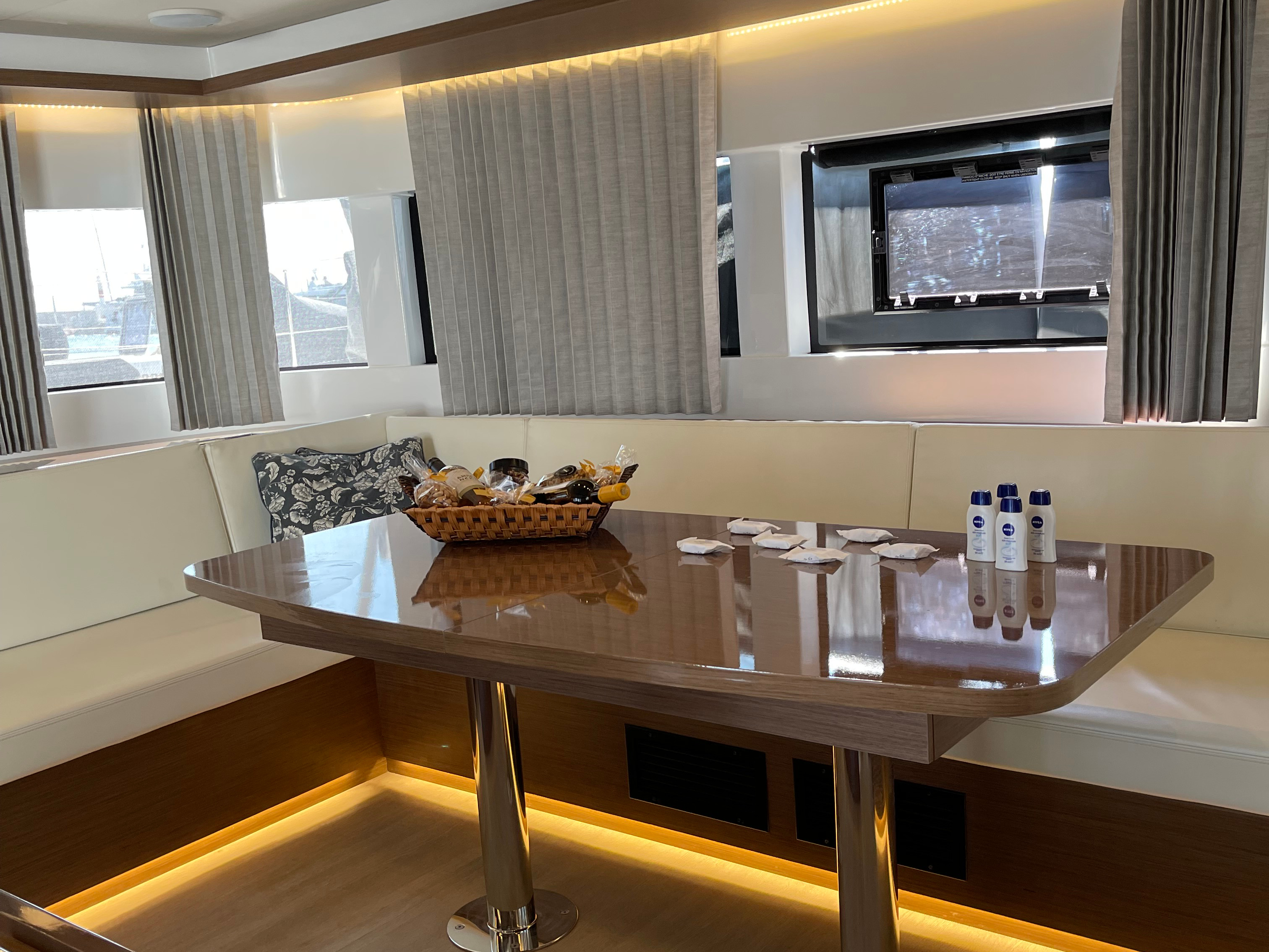 | Inside | Backofen, Fäkalientank, FUSION Sound System, Gasherd, Gefrierschrank, Generator, Geschirrspüler, Inverter 12V/220V, Kaffeemaschine, Klimaanlage (ohne Landstrombedarf), Kühlschrank, Lautsprecher im Salon, Mikrowelle, Toaster, TV, USB Steckdose, Ventilatoren in Kabinen, Wasserkocher, Watermaker, WC (elektr.), Weinkühlschrank |