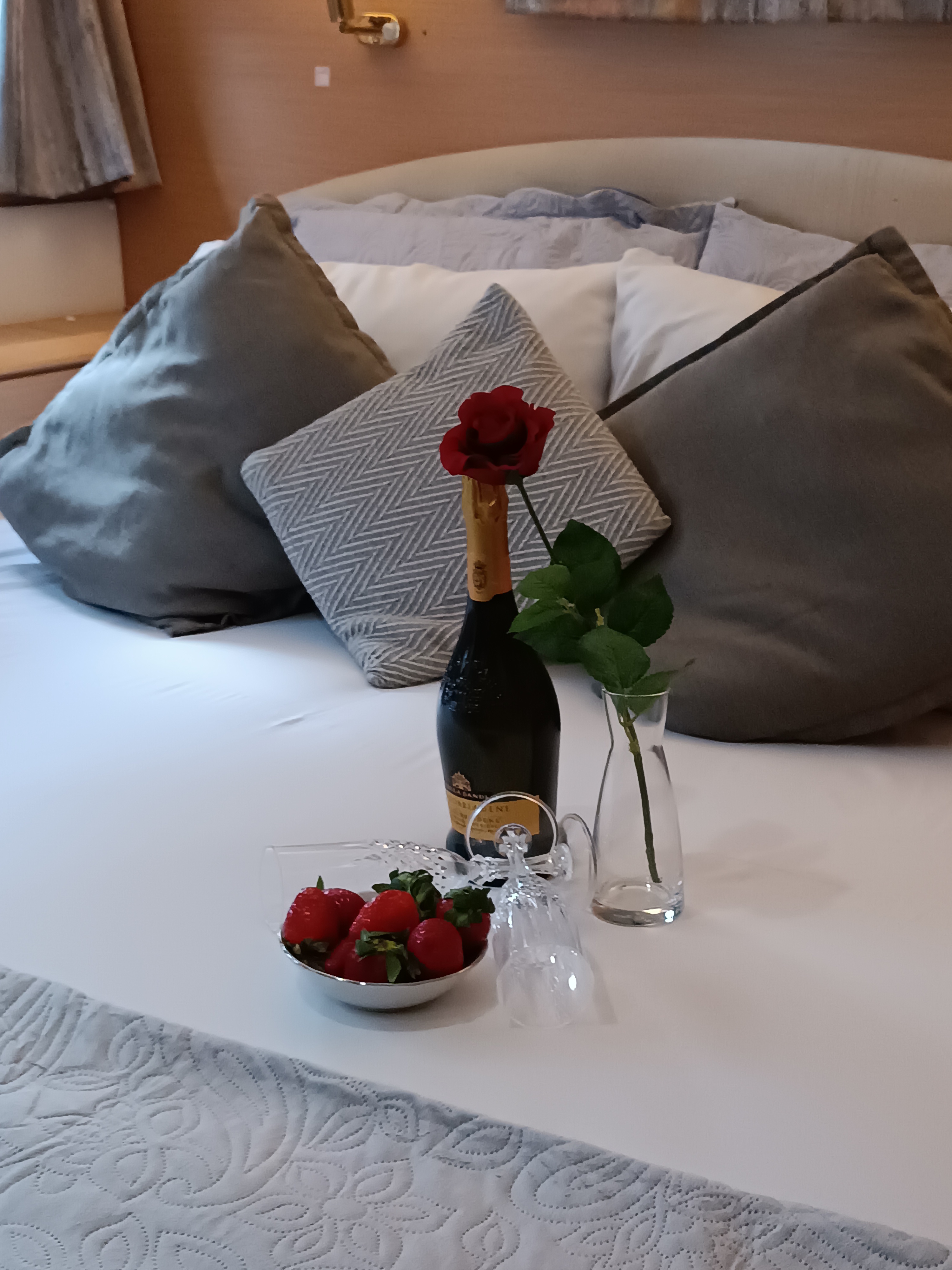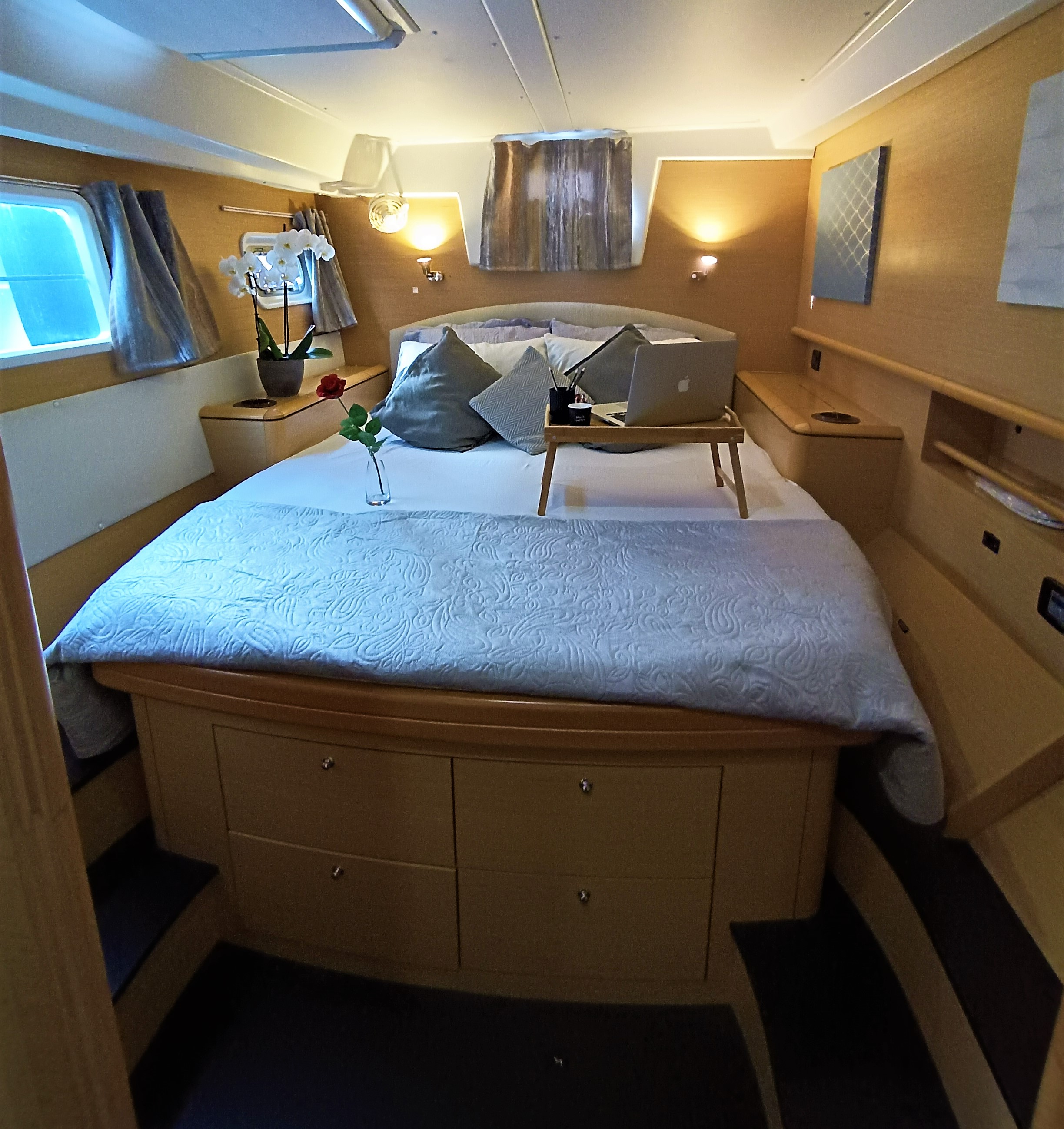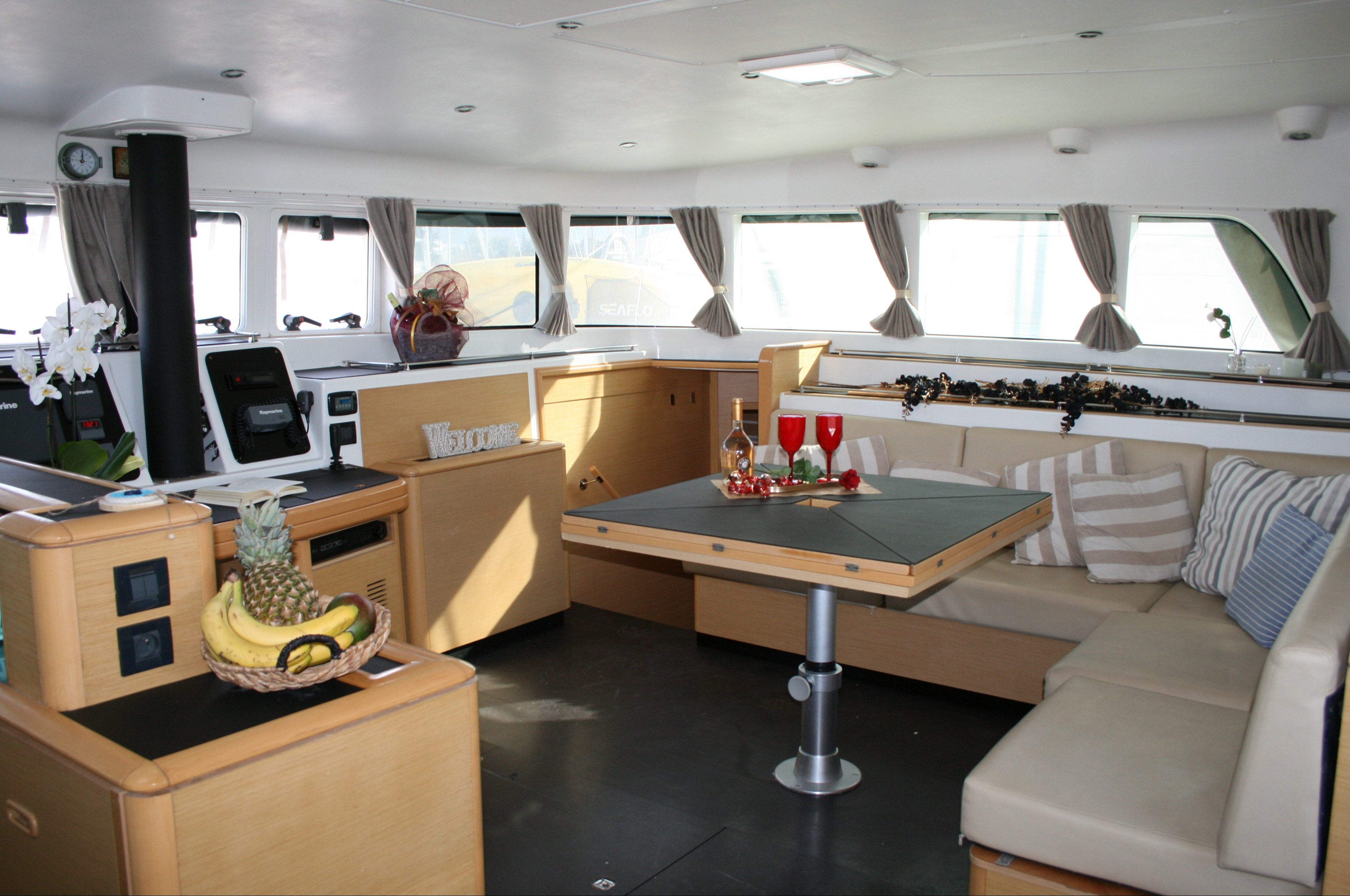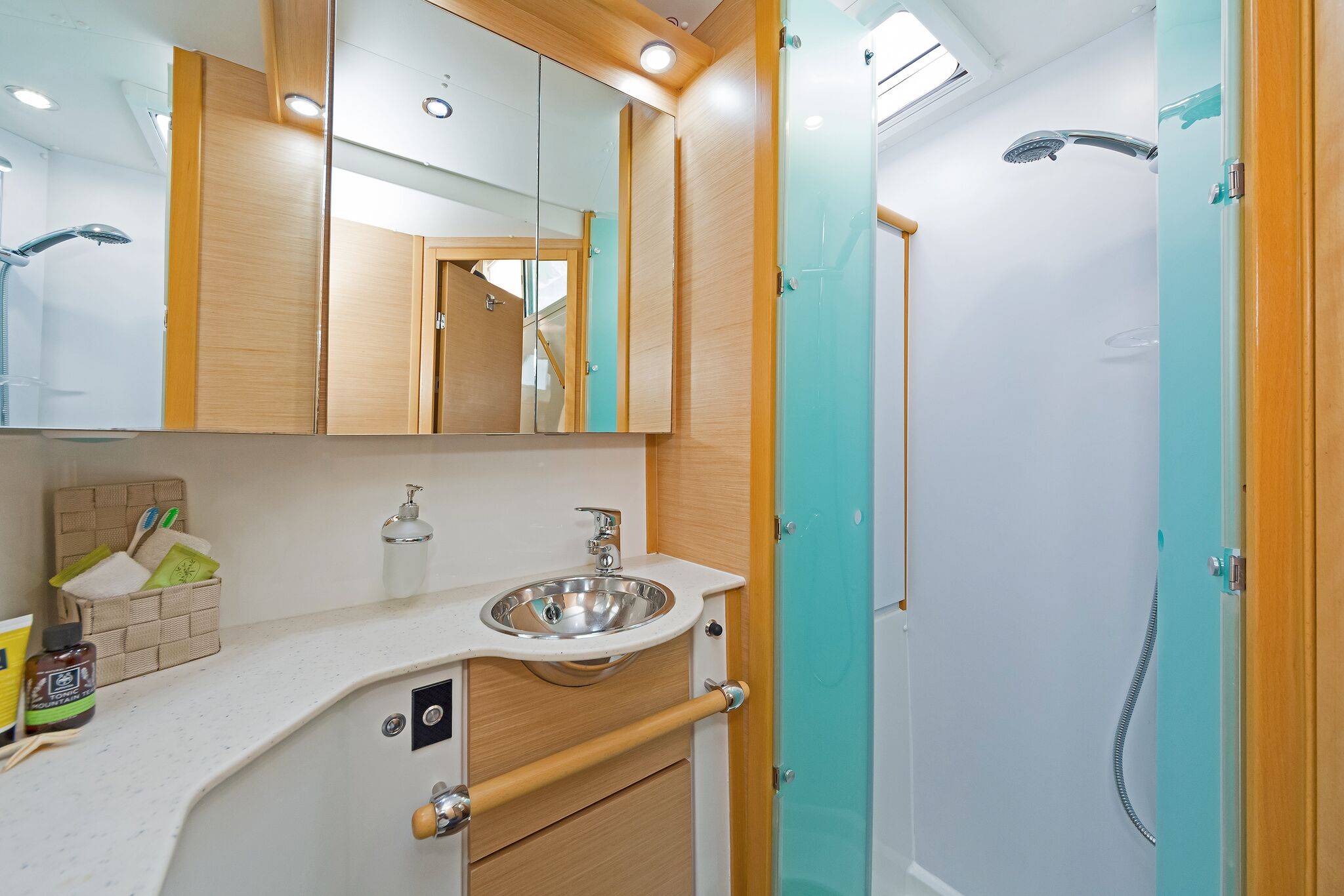 | Inside | Gasherd mit Backofen, Gefrierschrank, Generator, Heizung, Inverter 12V/220V, Klimaanlage (ohne Landstrombedarf), Kühlbox, Kühlschrank, Pantryausstattung, Radio mit CD, TV + DVD, Warmwasser, Watermaker |