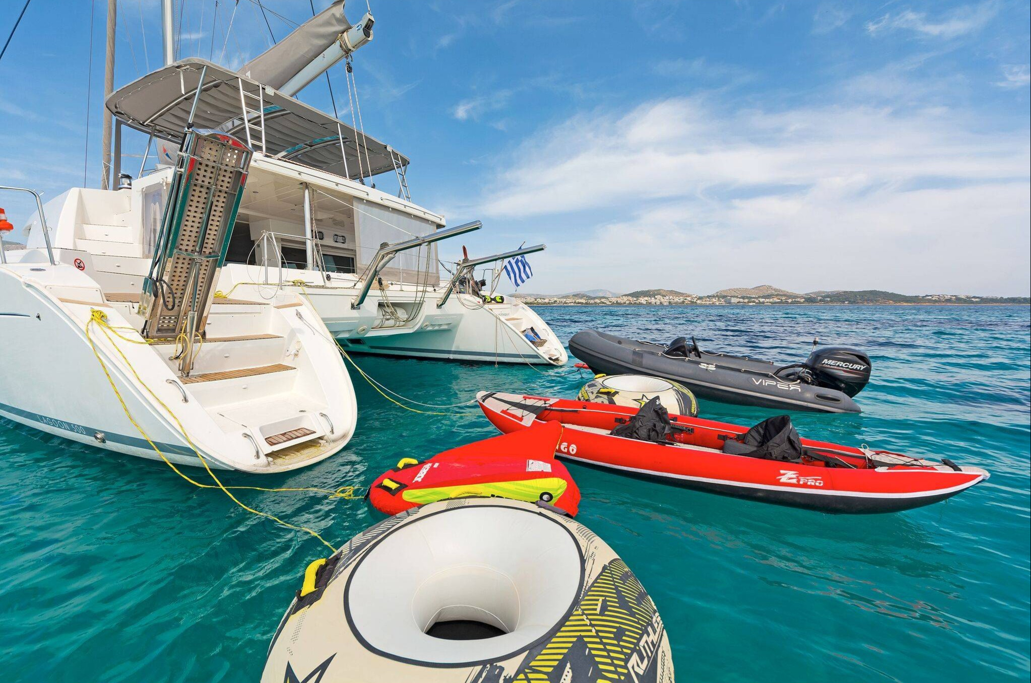 | Outside | 220 V-Landanschluss, Anker mit Kette, Badeplattform, Biminitop, Cockpitdusche, Cockpitlautsprecher, Cockpitpolster, elektr. Ankerwinsch, Schnorchelausrüstung, Sprayhood, Teak im Cockpit |