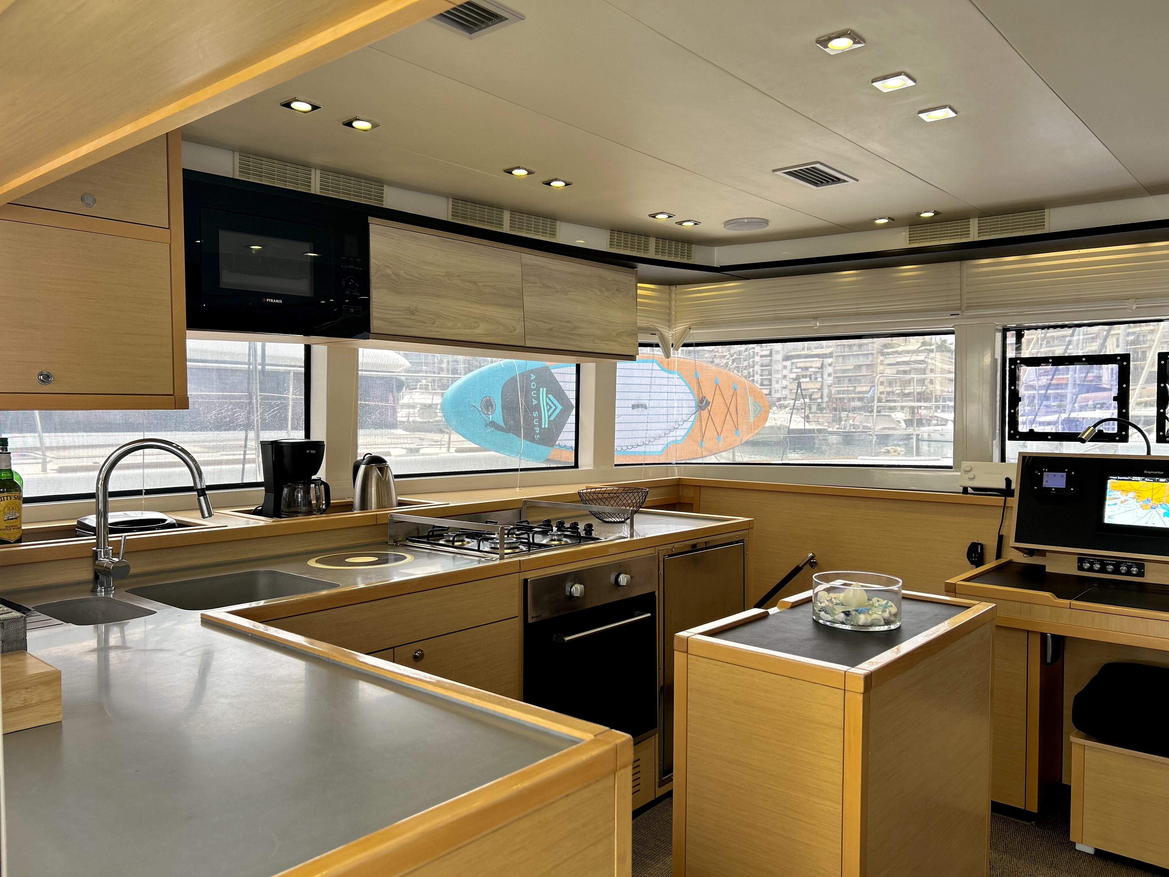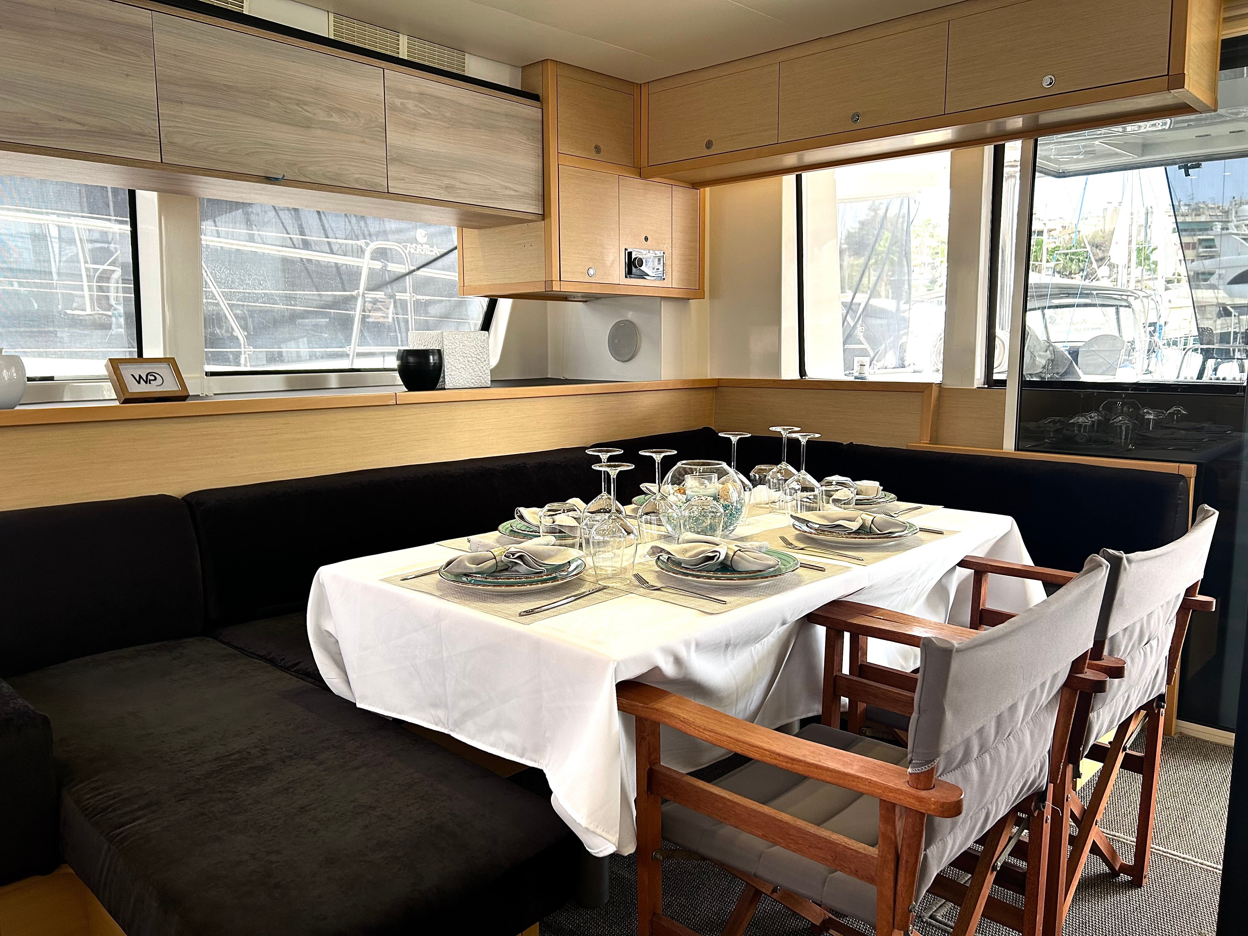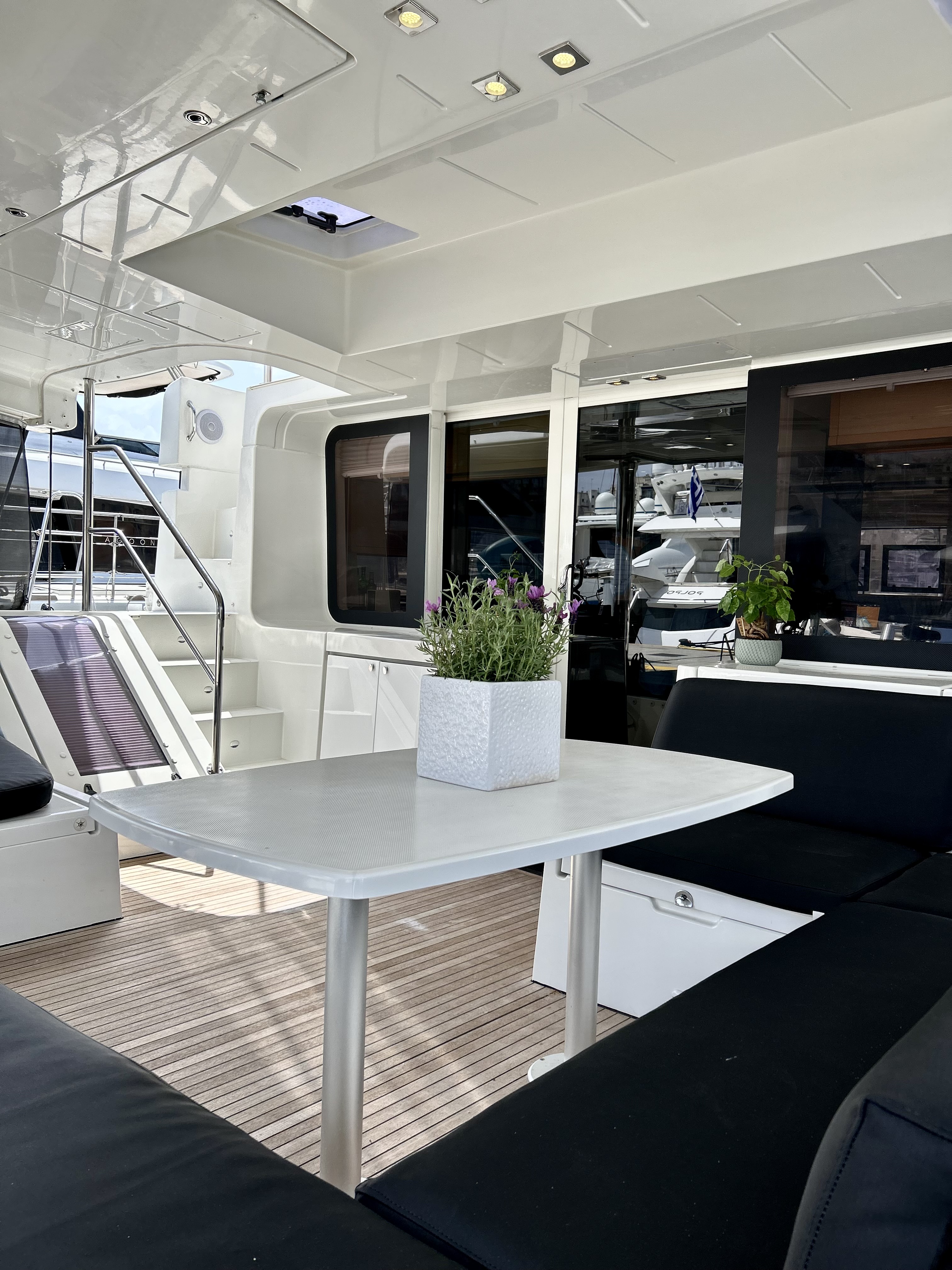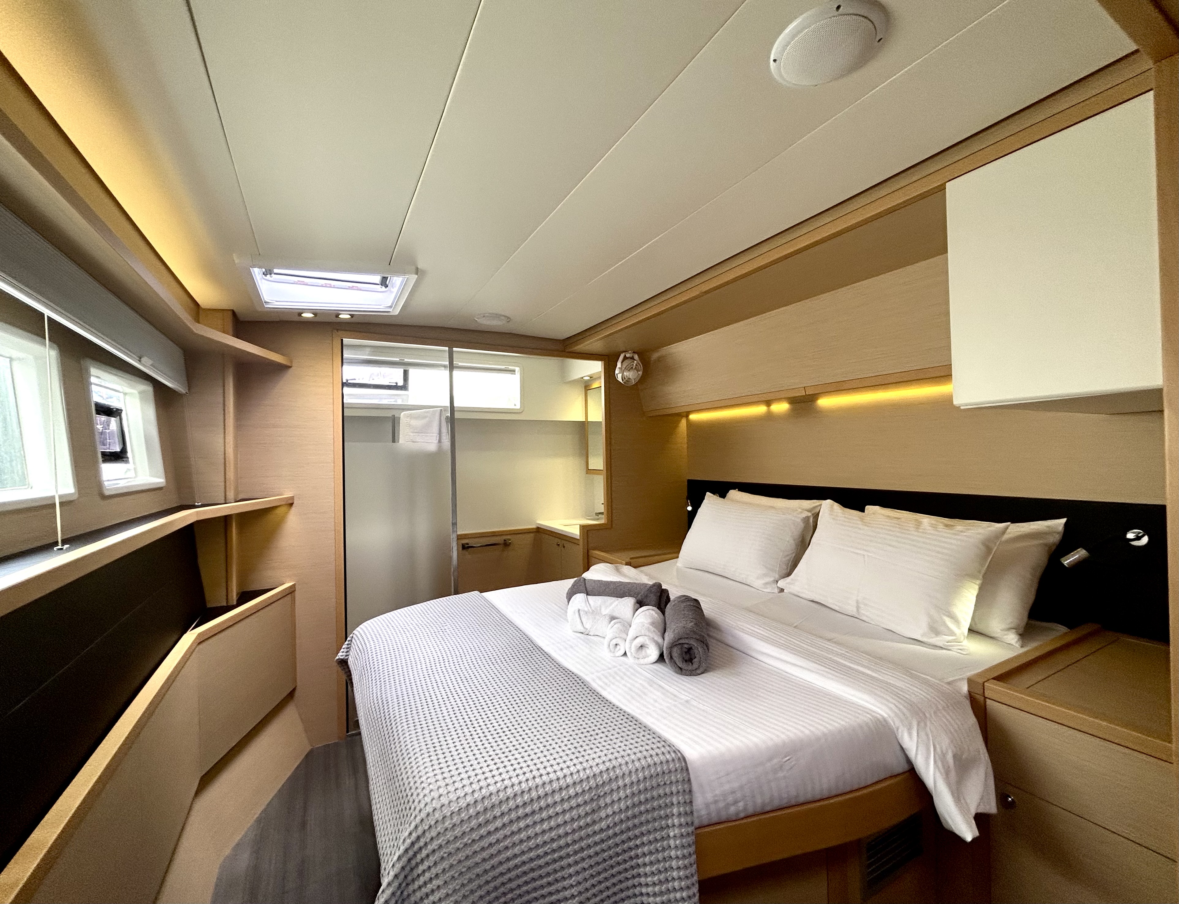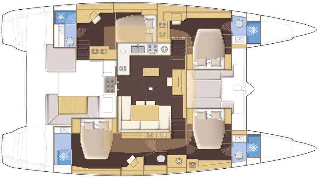 | Inside | Gefrierschrank, Generator, Inverter 12V/220V, Klimaanlage (ohne Landstrombedarf), Kühlschrank, Nespresso-Maschine, TV, USB Steckdosen in den Kabinen, Warmwasser, Watermaker |