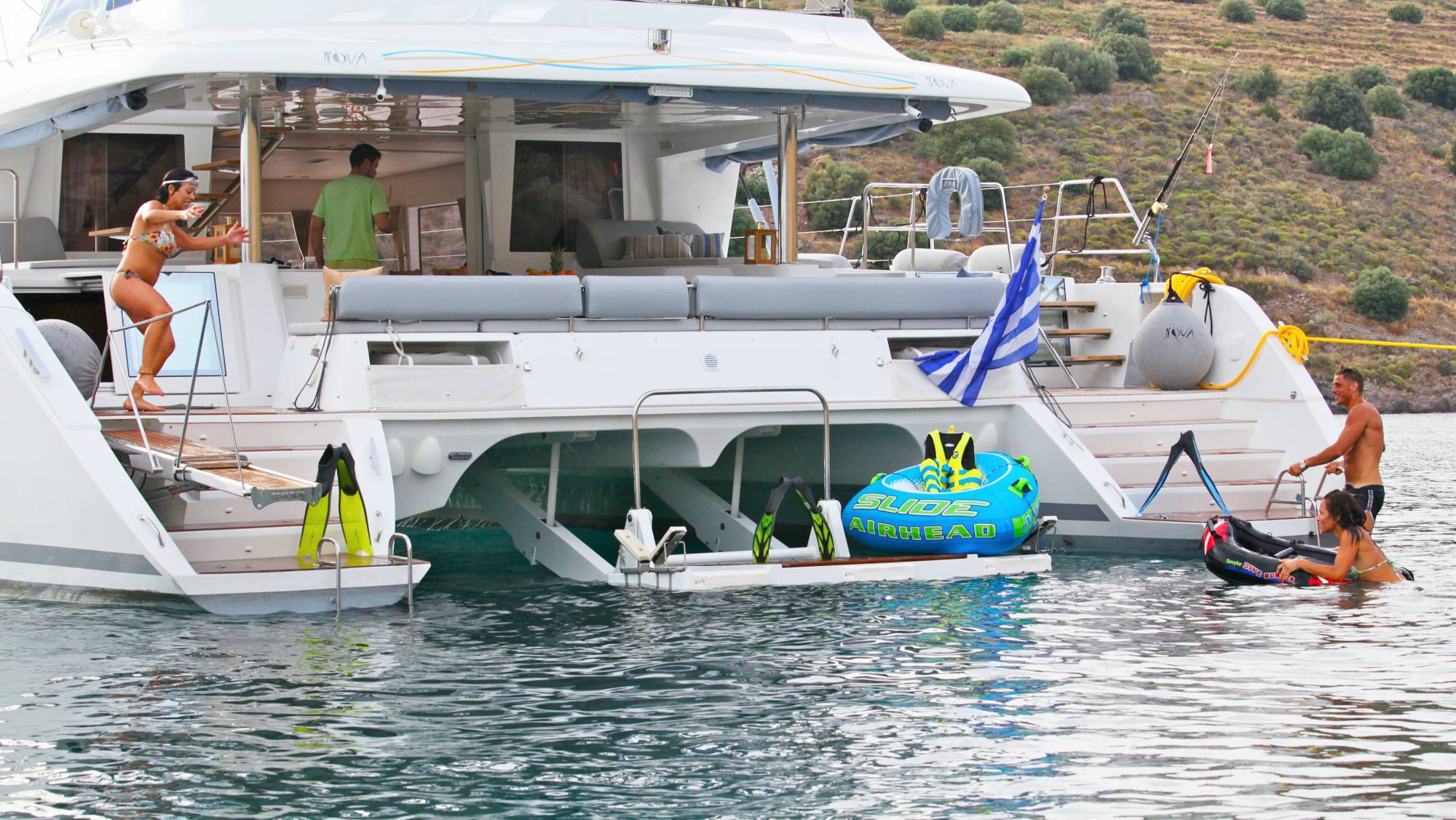 | Outside | Angelausrüstung, Badeleiter, Badeplattform (hydr.), Biminitop, Bootshaken, Cockpitpolster, Cockpittisch, Deckbürste, elektr. Ankerwinsch, elektr. Winsch, Fender, Festmacherleinen, Flybridge mit Bimini und Kühlschrank, Schnorchelausrüstung, Sonnensegel, Teakdeck, Winschen |