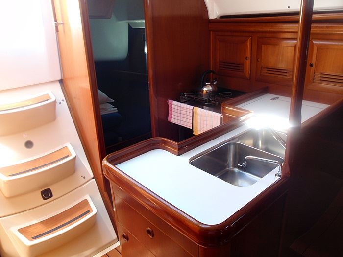 | Safety | Bootsmannstuhl, Bordapotheke, Bordwerkzeug, elektr. Bilgepumpe, Feststoffschwimmwesten, Feuerlöscher, Flaggen, Navigationslichter, Nebelhorn, Notpinne, Notsignale, Radarreflektor, Reparaturset für Beiboot, Rettungsinsel, Sicherheitsgurt, UKW-Funk |