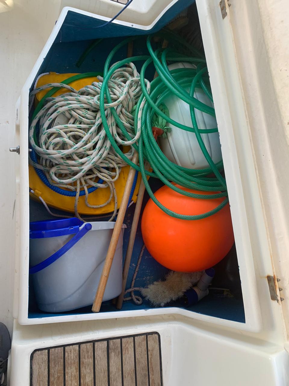 | Outside | Biminitop, Cockpitdusche, Cockpitlautsprecher, elektr. Ankerwinsch, Gangway, Solaranlage, Sprayhood |