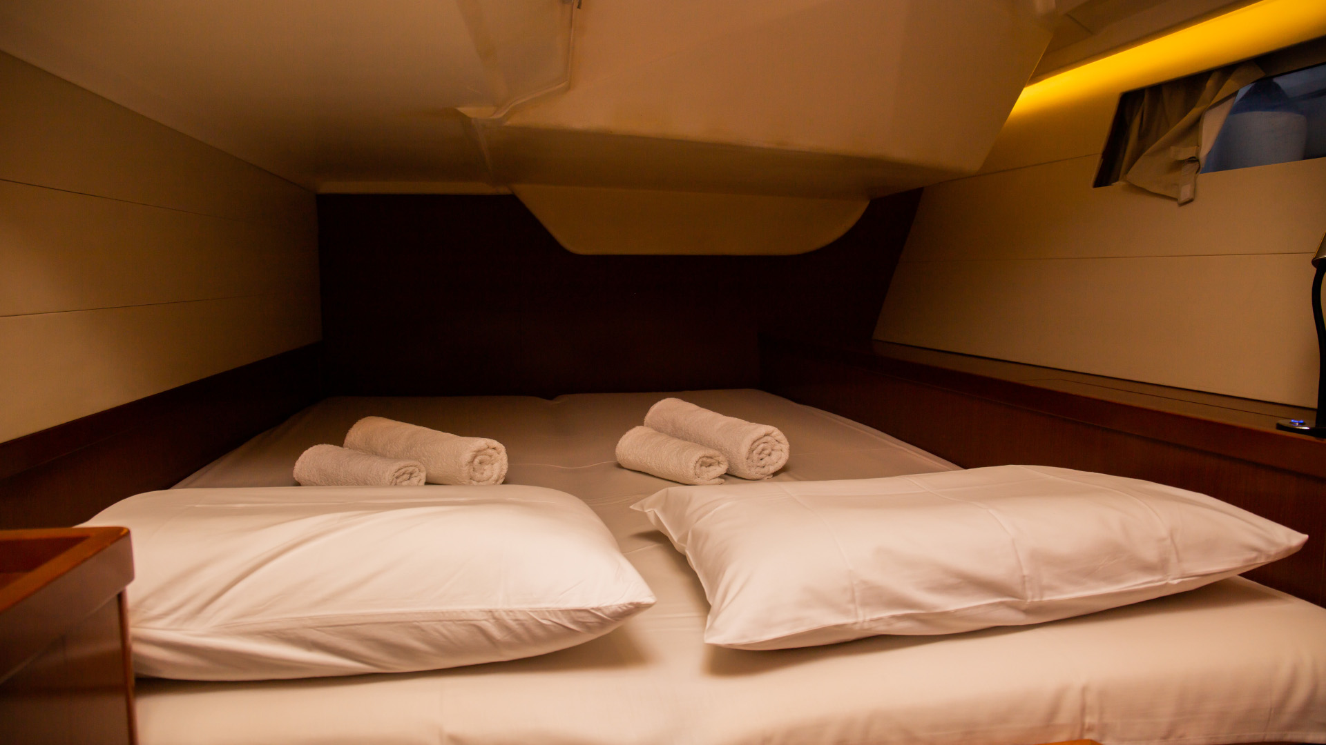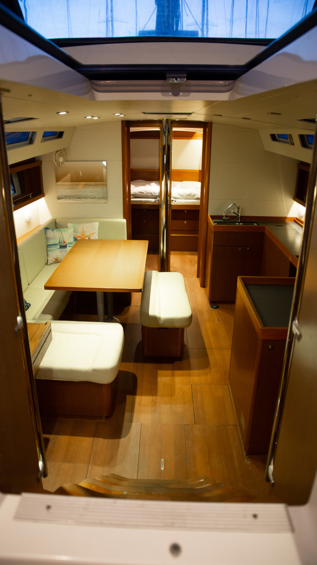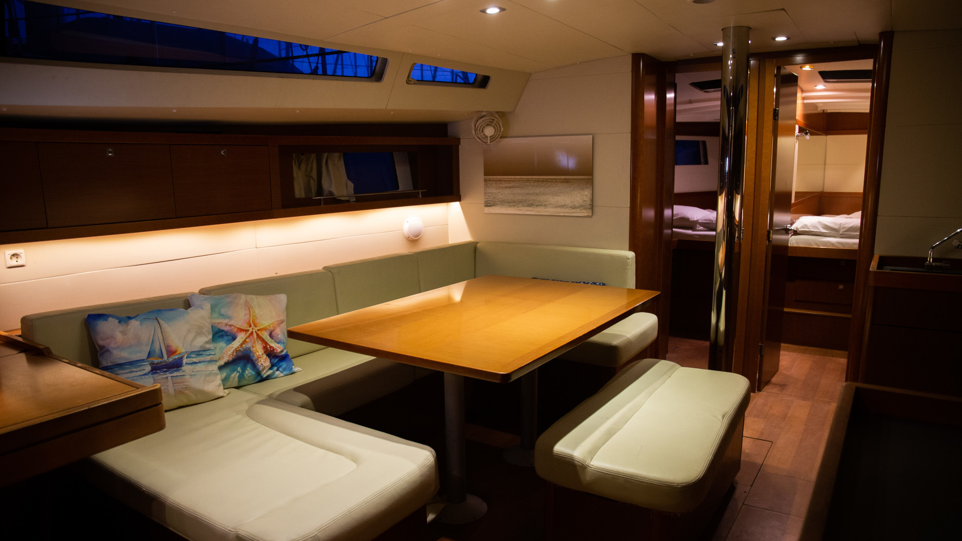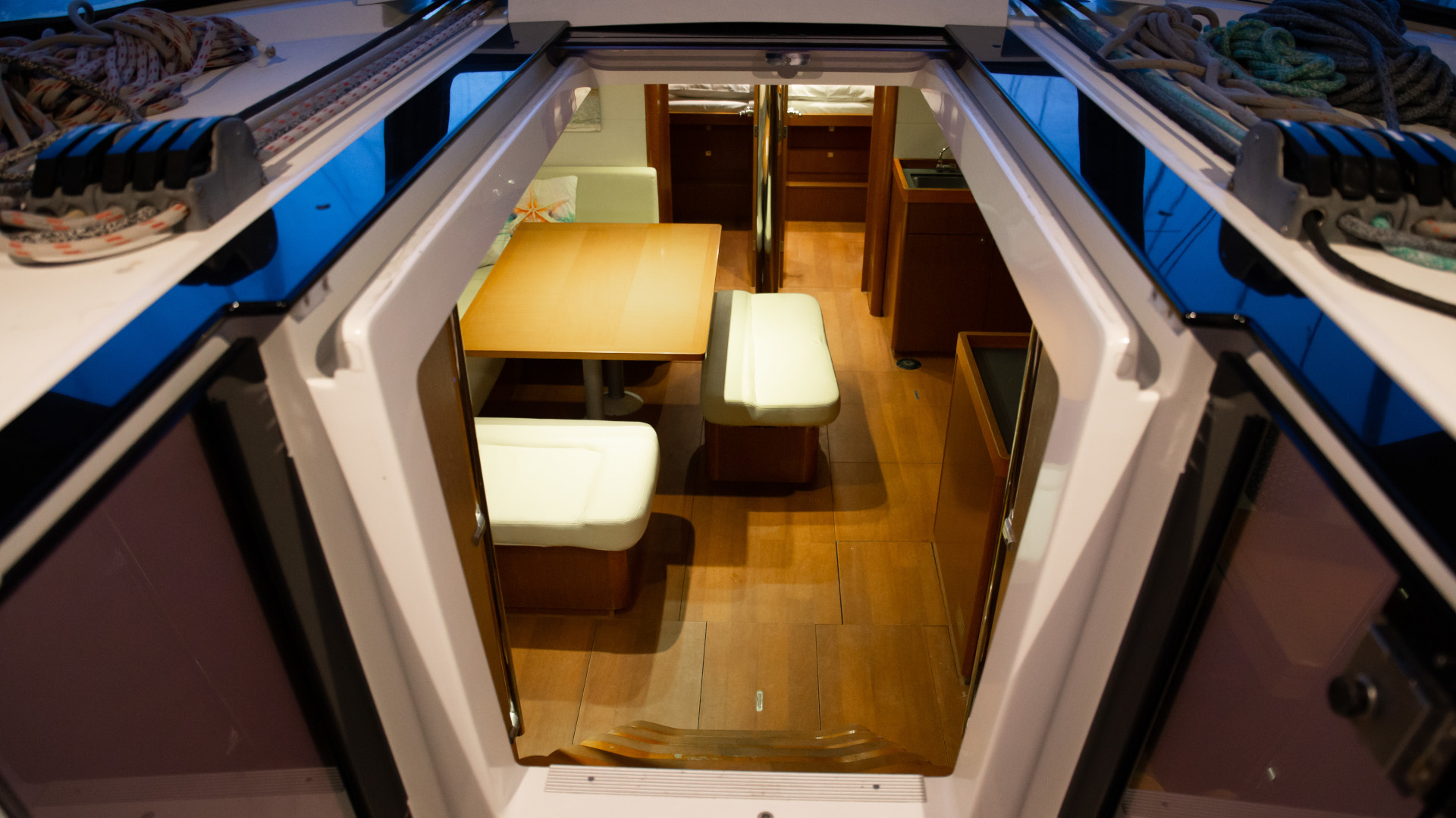 Outside 220 V-Landanschluss, Badeplattform, Biminitop, Cockpitdusche, Cockpitlautsprecher, Cockpitpolster, Cockpittisch, elektr. Ankerwinsch, Festmacherleinen, Gangway, Schnorchelausrüstung, Solaranlage, Sprayhood, Teak im Cockpit