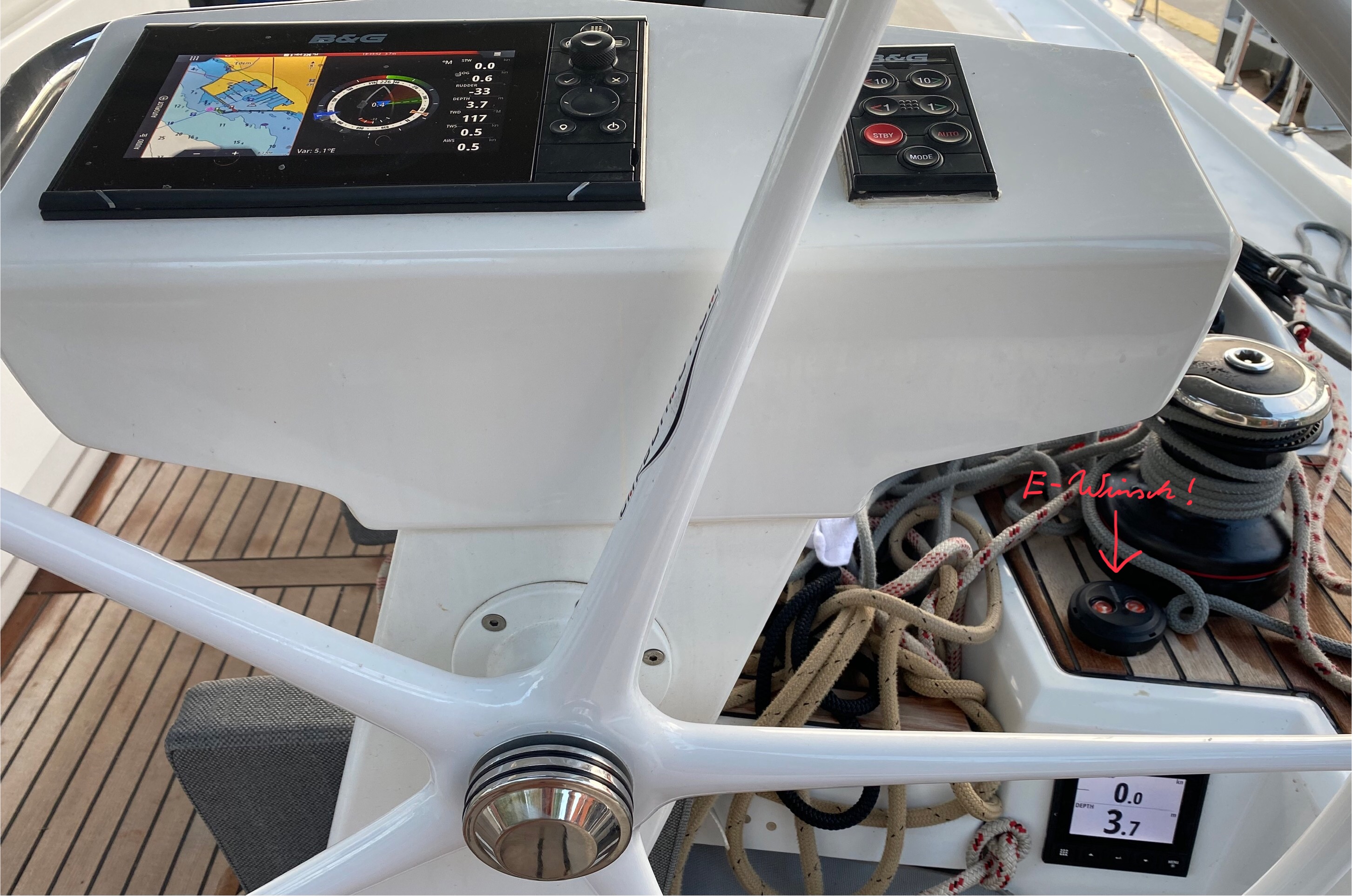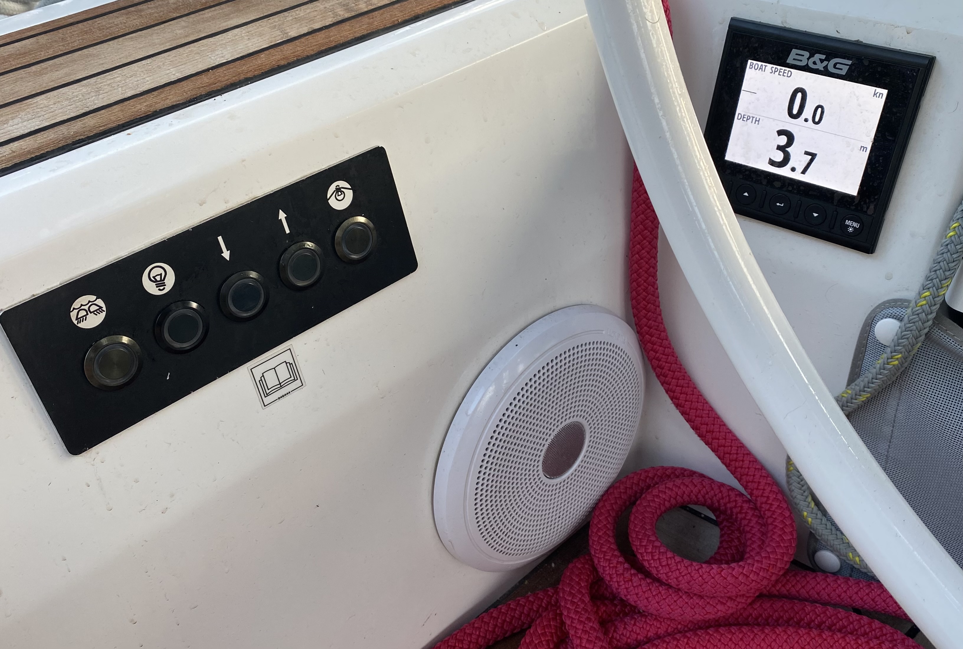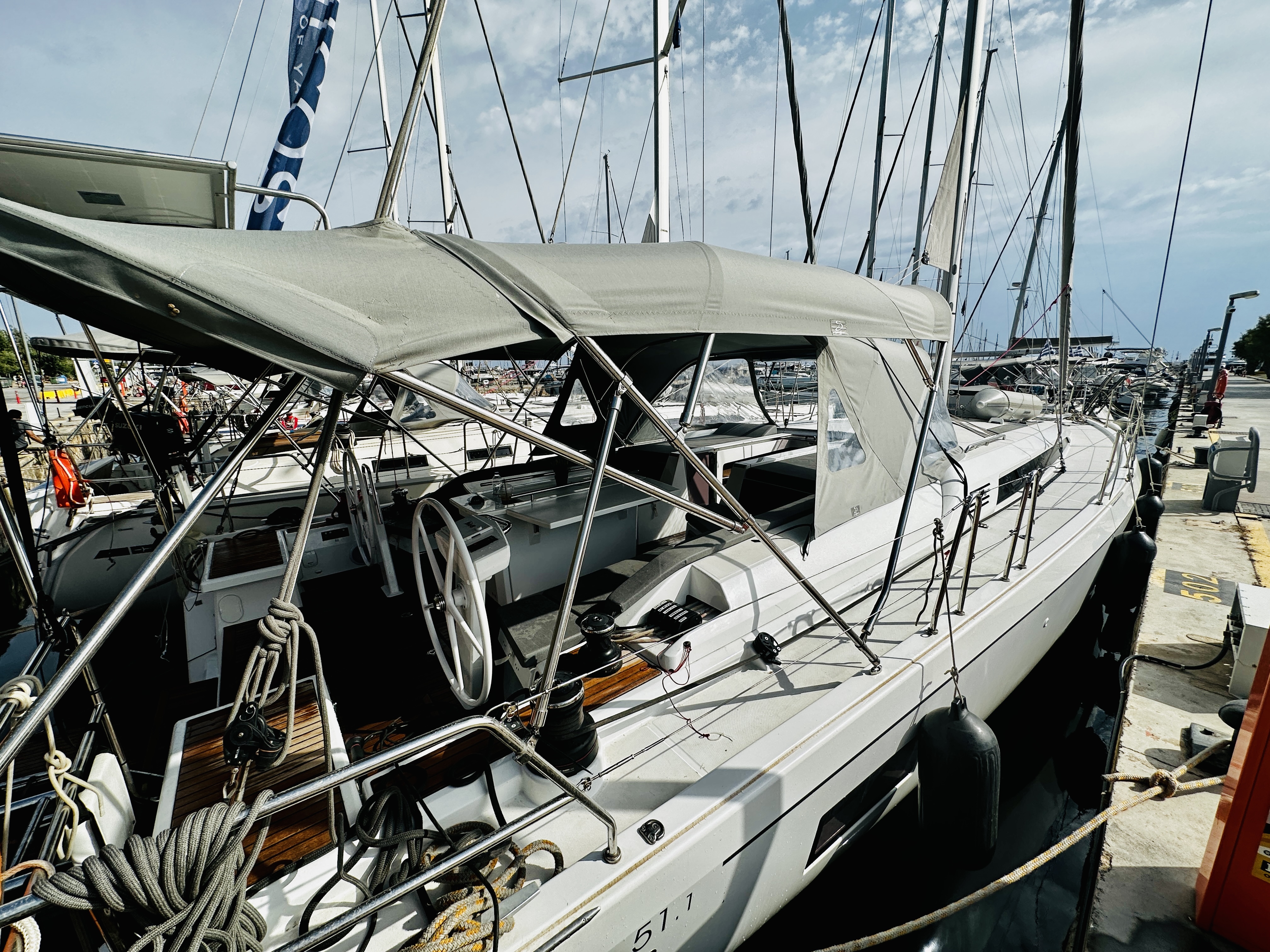 | Outside | 220 V-Landanschluss, Anker mit Kette, Badeleiter, Badeplattform, Biminitop, Bootshaken, Cockpitlautsprecher, Cockpitleuchte, Cockpitpolster, Deckbürste, elektr. Ankerwinsch, Fender, Festmacherleinen, Gangway, Kunststoff-Eimer (Pütz), Segel-Flickwerkzeug, Solaranlage, Sprayhood, Treibanker, Wantenschneider, Wasserschlauch, Winschen |