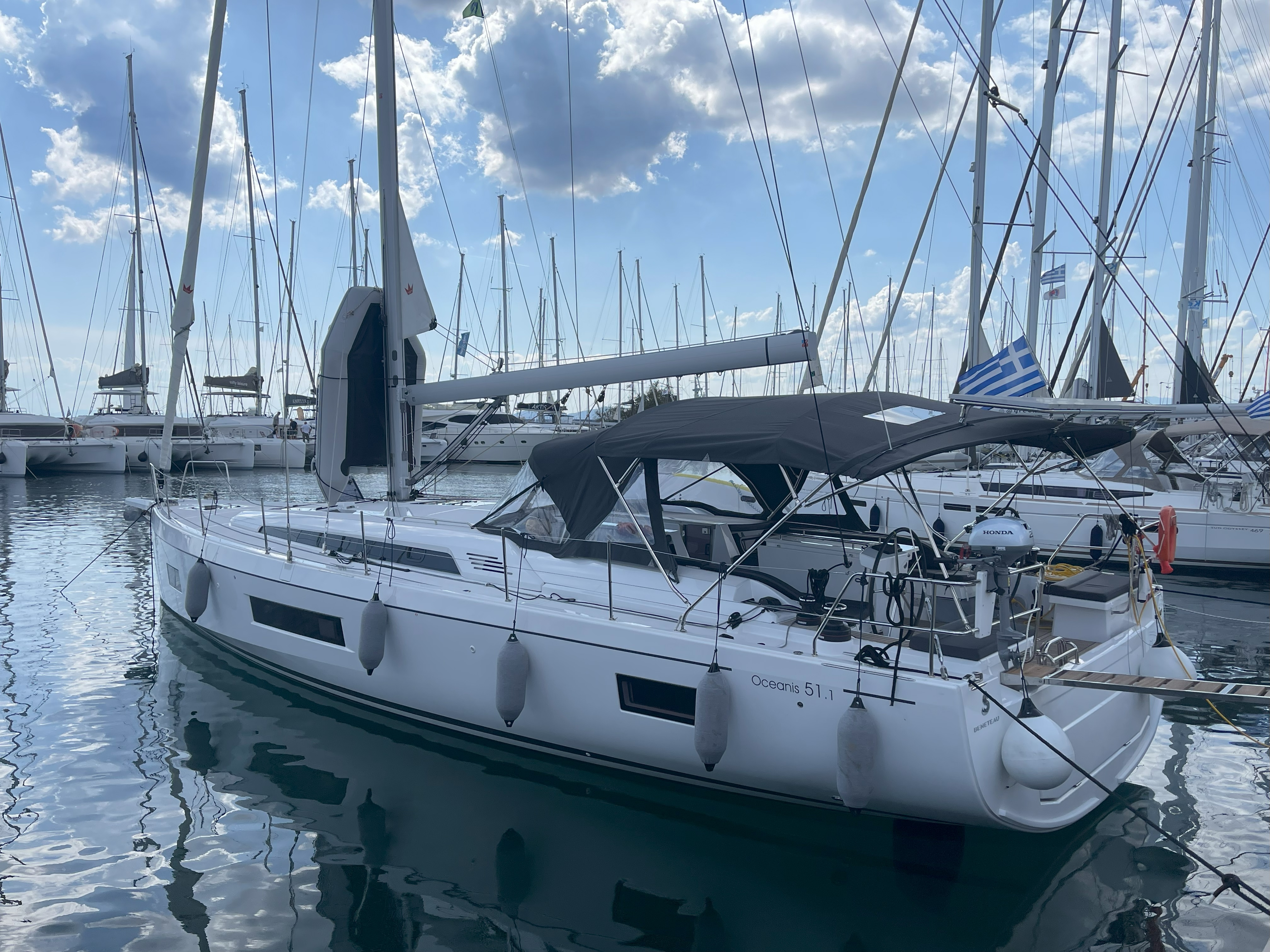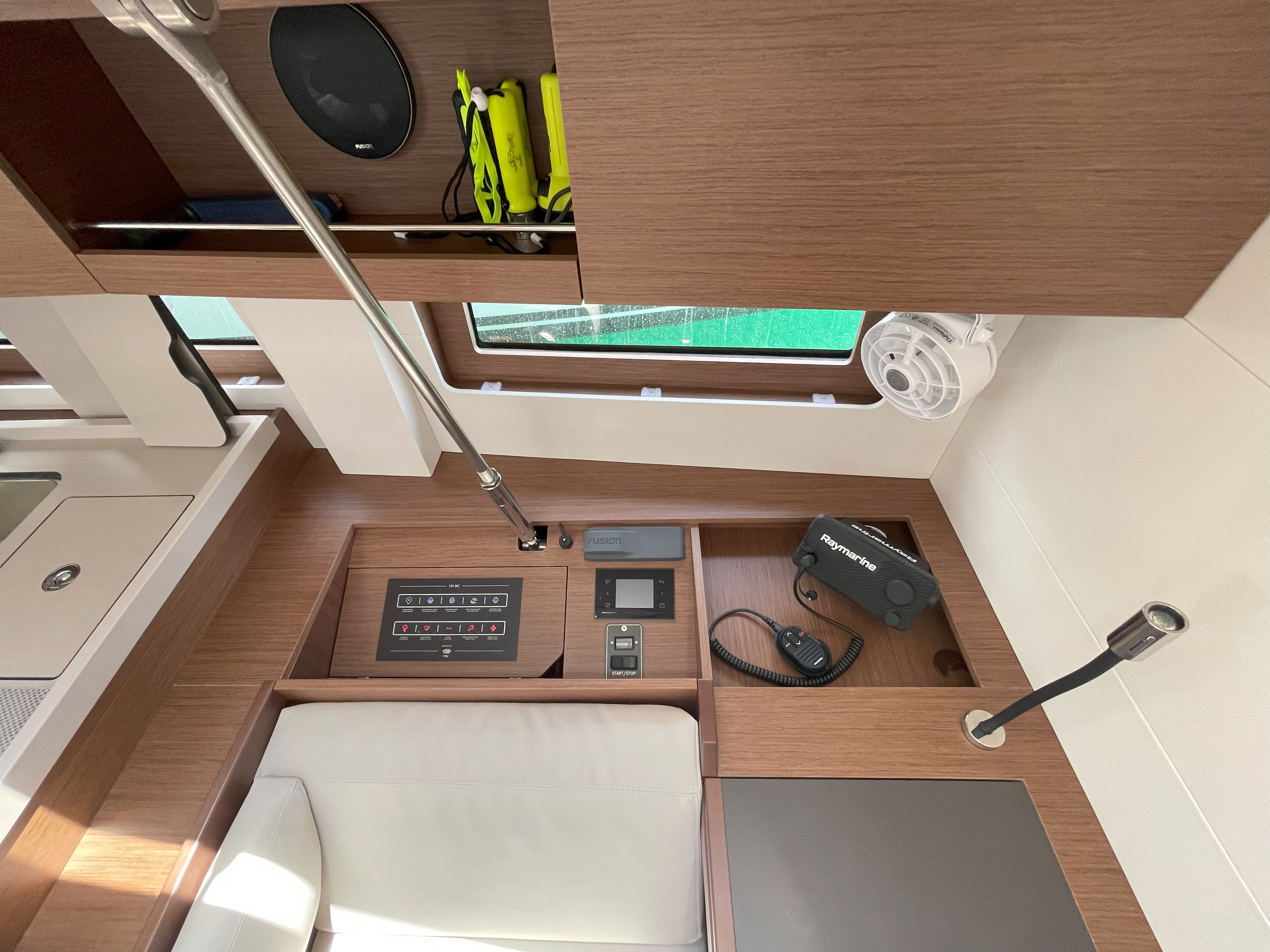 | Outside | Anker mit Kette, Badeleiter, Biminitop, Bootshaken, Cockpitpolster, Cockpittisch, Dieselkanister , elektr. Ankerwinsch, Fender, Festmacherleinen, Gangway, Kunststoff-Eimer (Pütz), Schnorchelausrüstung, Segel-Flickwerkzeug, Solaranlage, Sprayhood, Wasserkanister , Winschen |