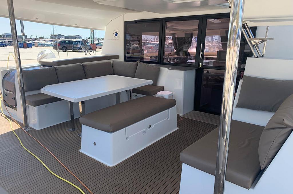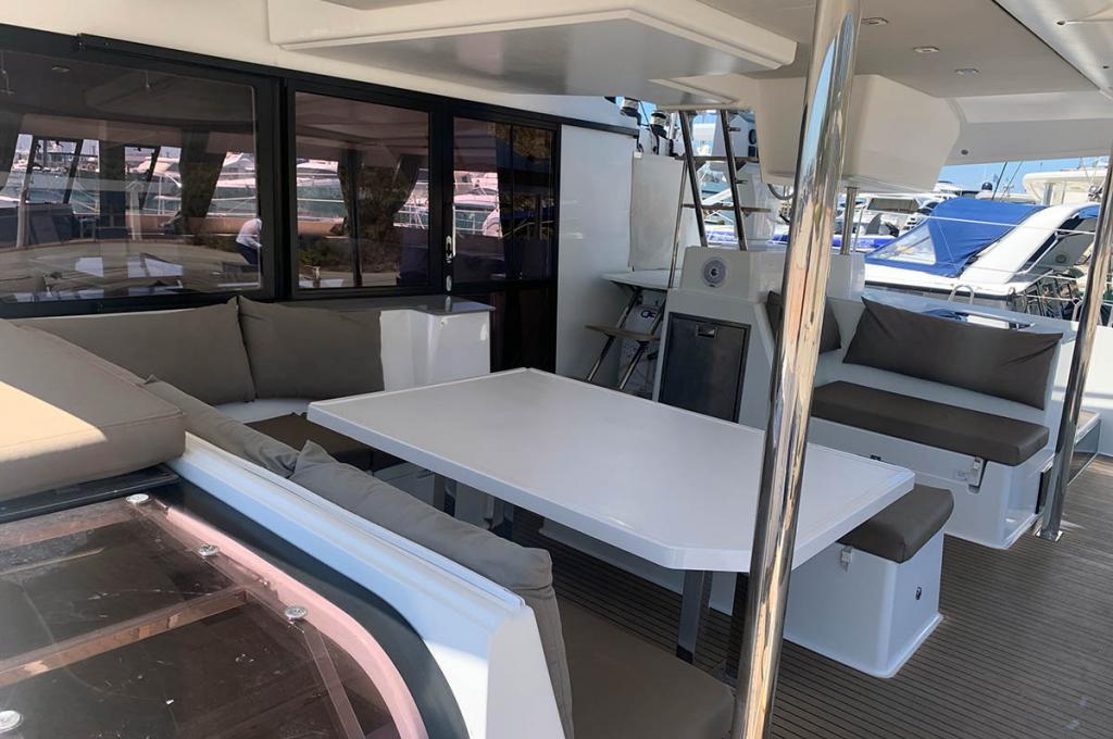 | Outside | Anker mit Kette, Badeleiter, Badeplattform, Biminitop, Cockpitdusche, Cockpitkühlschrank, Cockpitlautsprecher, Cockpitpolster, Cockpittisch, Deckbeleuchtung, Delta-Anker, elektr. Ankerwinsch, elektr. Winsch, Flybridge, Gangway, Sonnendeck, Teak im Cockpit, Windex, Winschen |