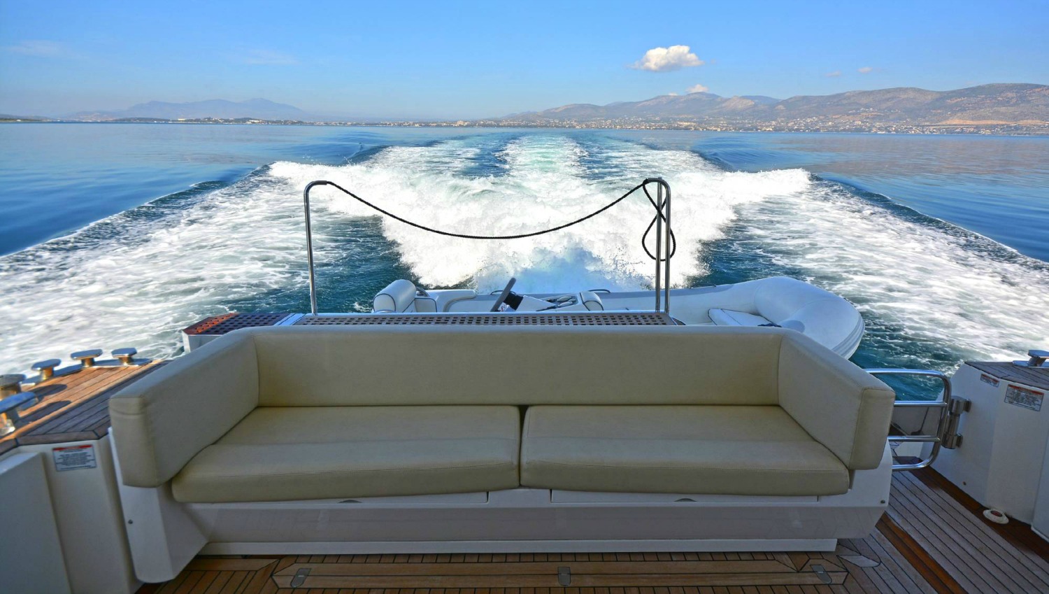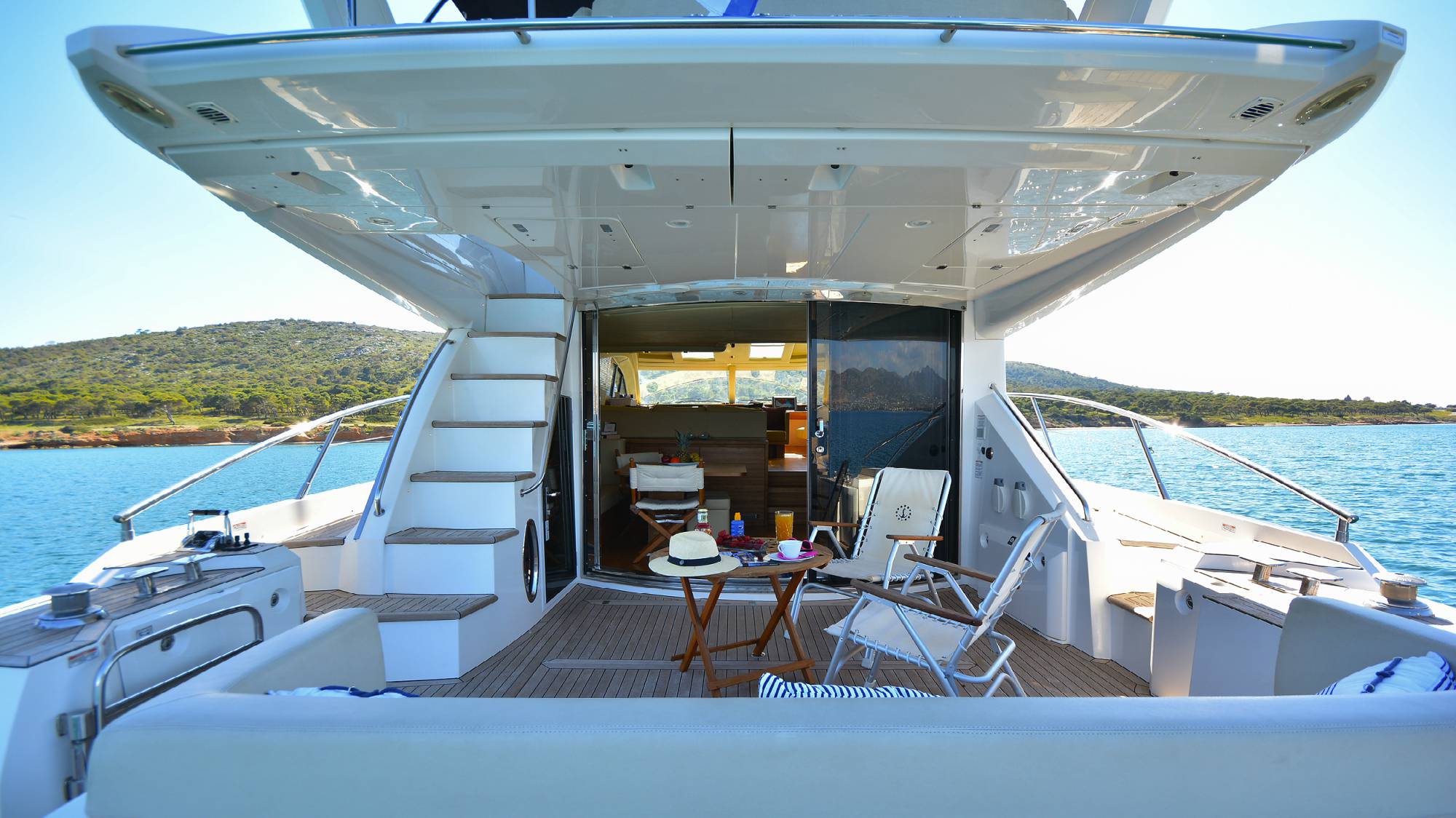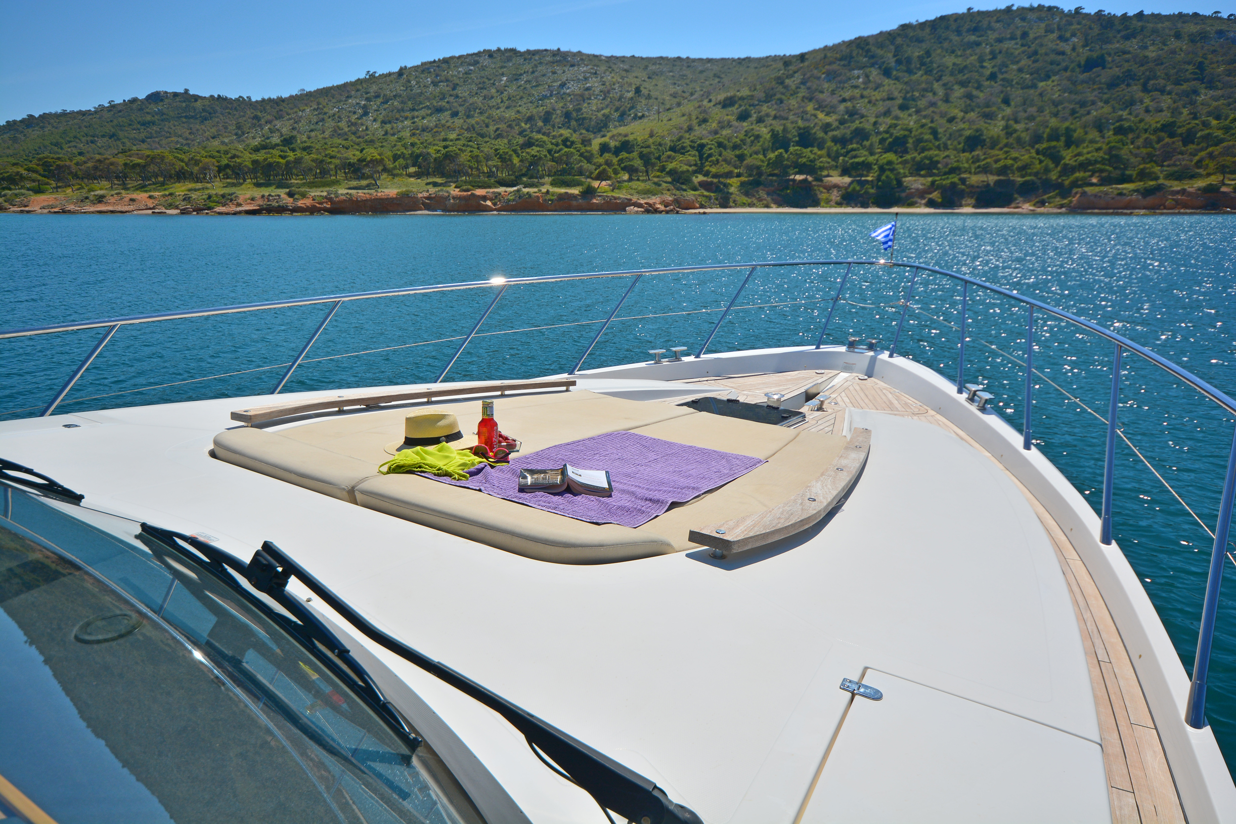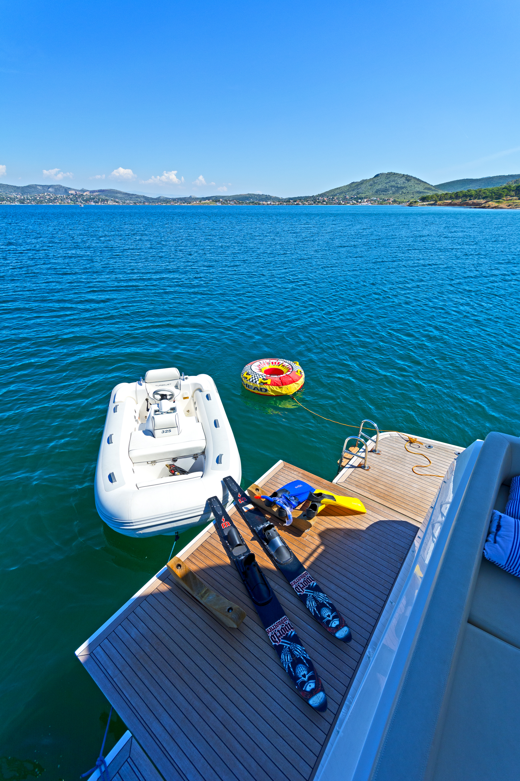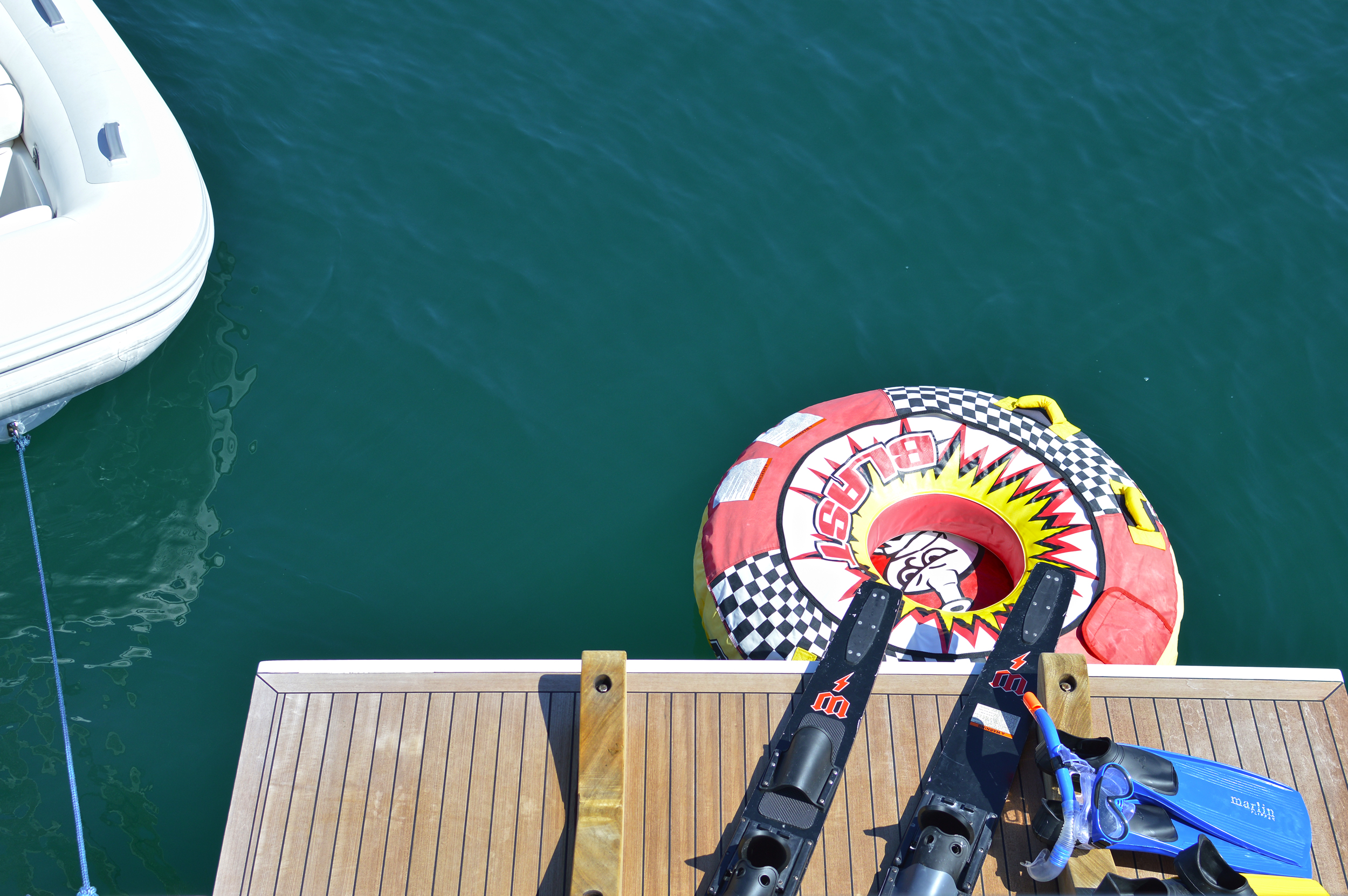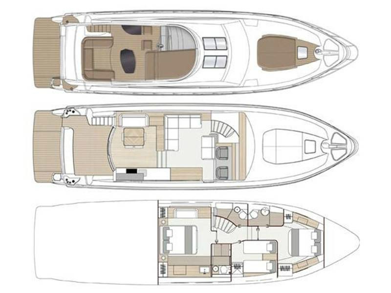 | Outside | Angelausrüstung, Anker mit Kette, Badeleiter, Badeplattform, Bootshaken, Cockpitpolster, Cockpittisch, Deckbürste, elektr. Ankerwinsch, elektr. Gangway, Fender, Festmacherleinen, Grill, Schnorchelausrüstung, Unterwasserbeleuchtung, Winschen |