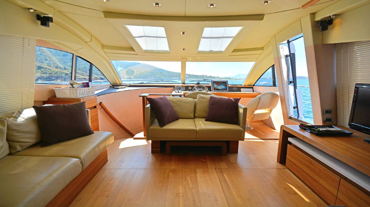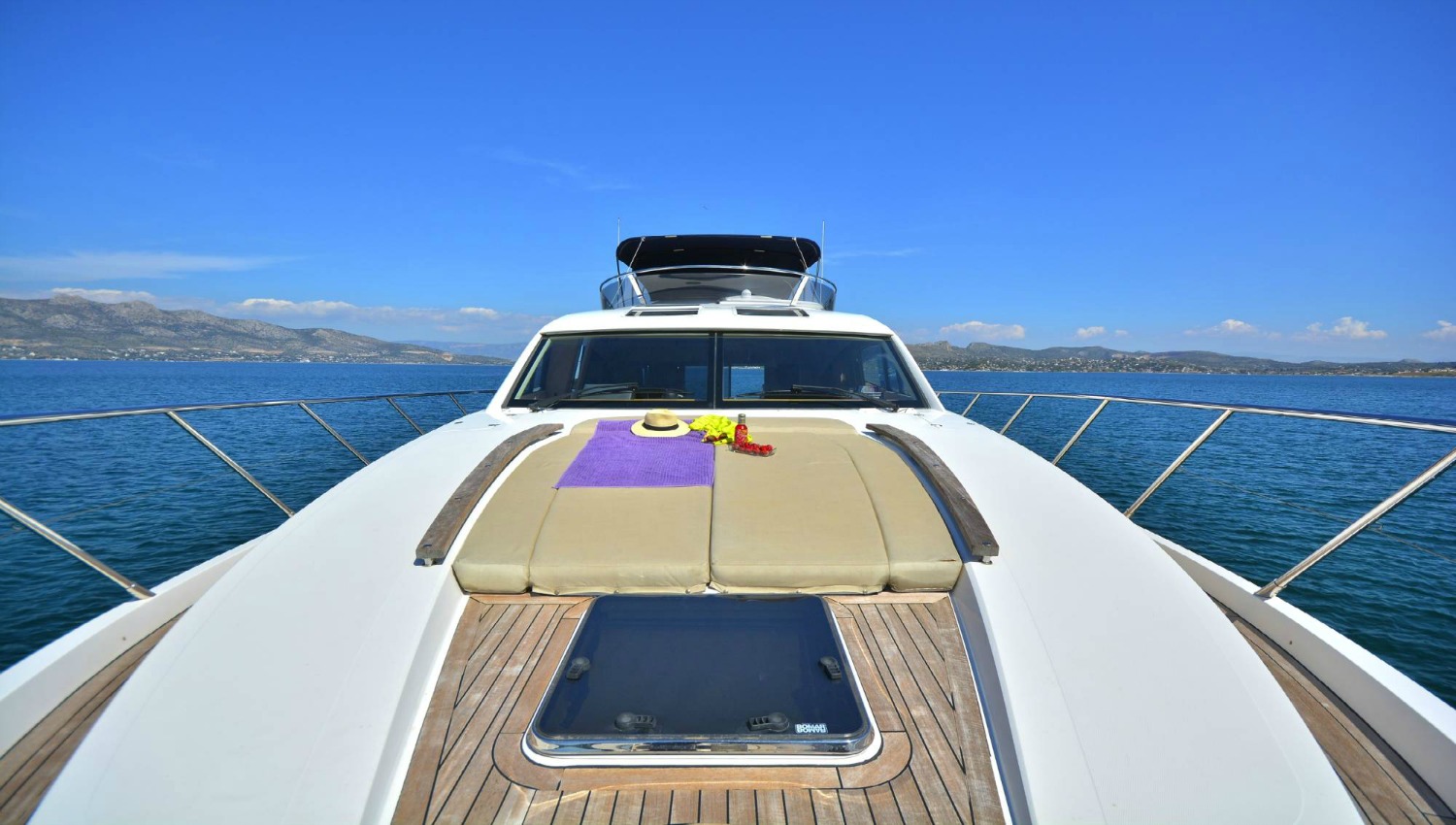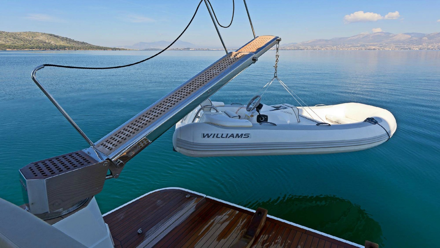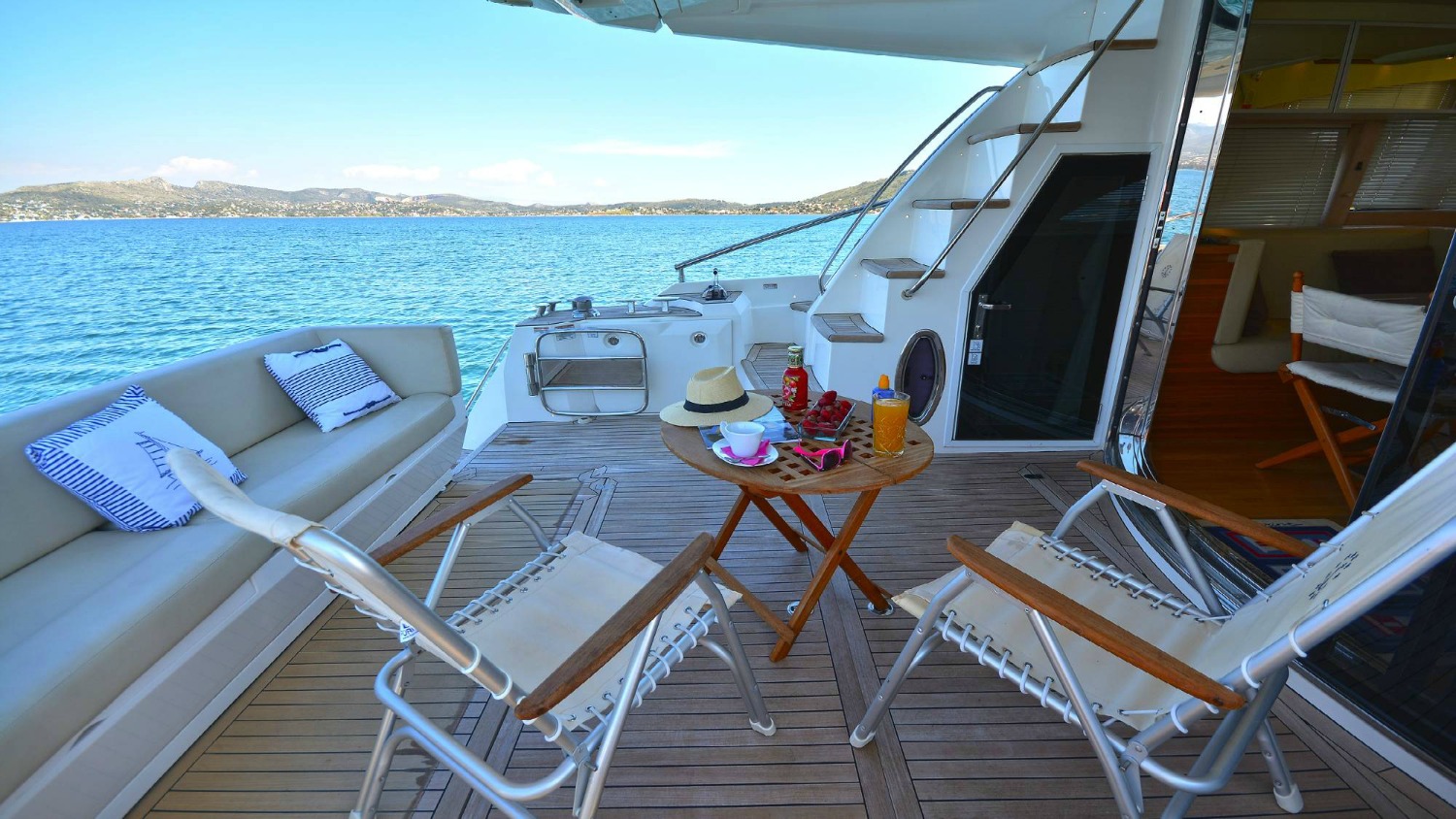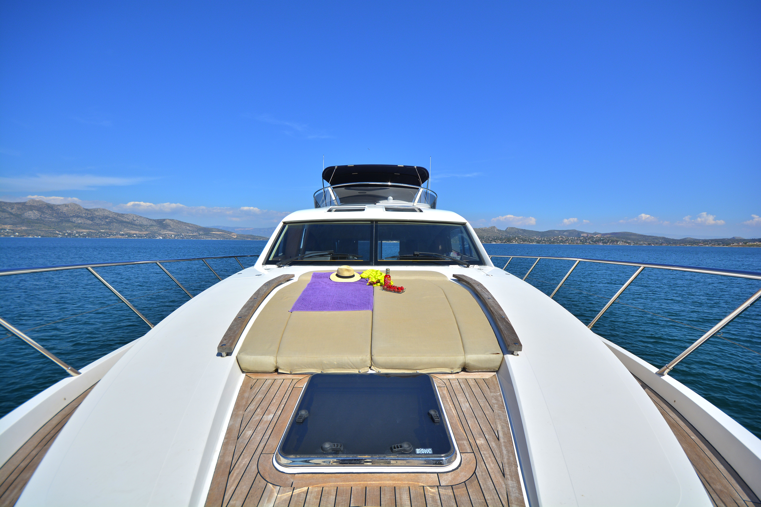 | Outside | Angelausrüstung, Anker mit Kette, Badeleiter, Badeplattform, Bootshaken, Cockpitpolster, Cockpittisch, Deckbürste, elektr. Ankerwinsch, elektr. Gangway, Fender, Festmacherleinen, Grill, Schnorchelausrüstung, Unterwasserbeleuchtung, Winschen |