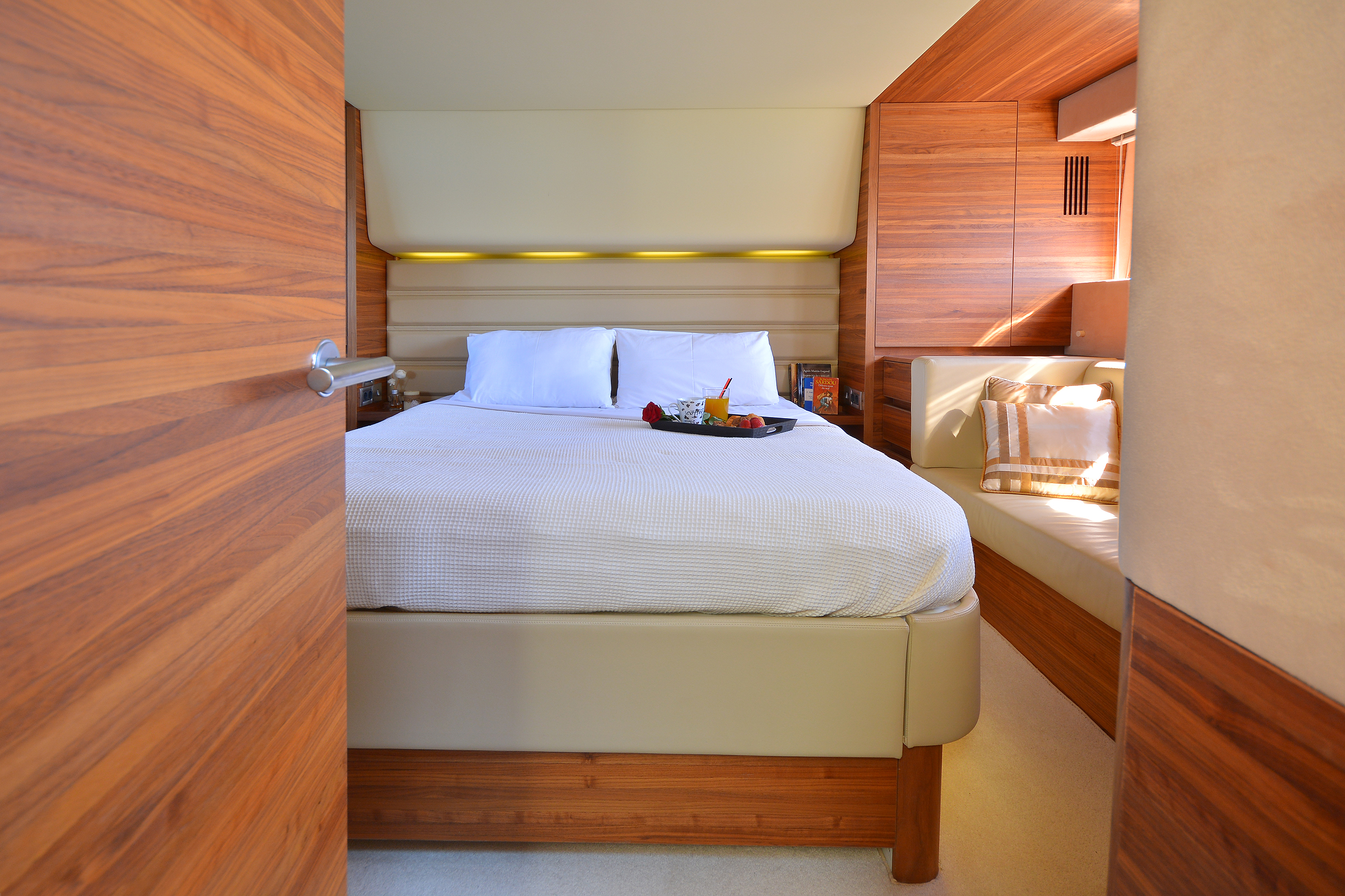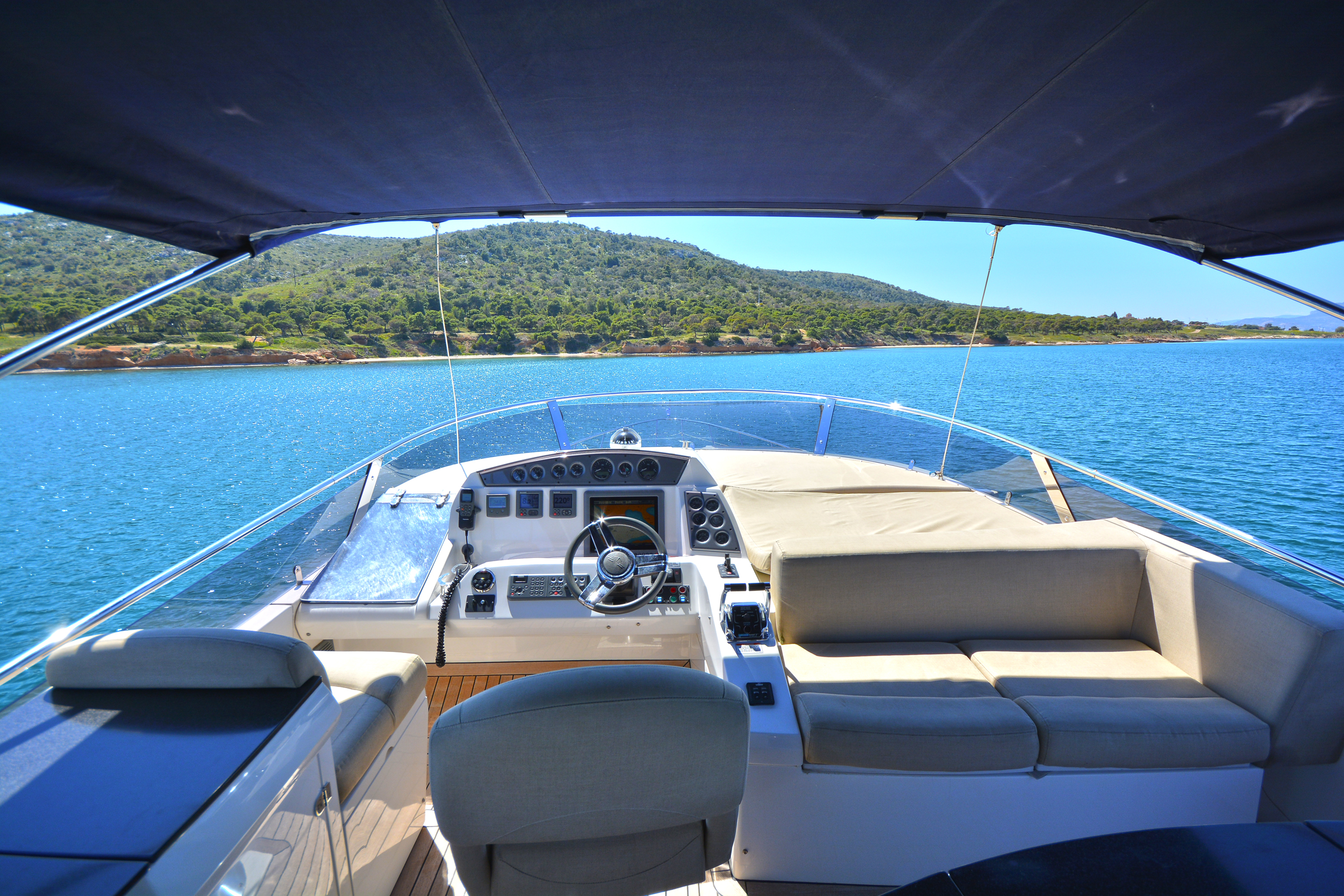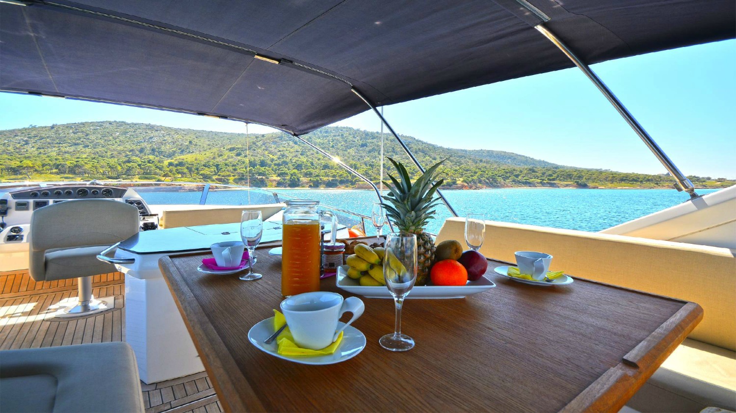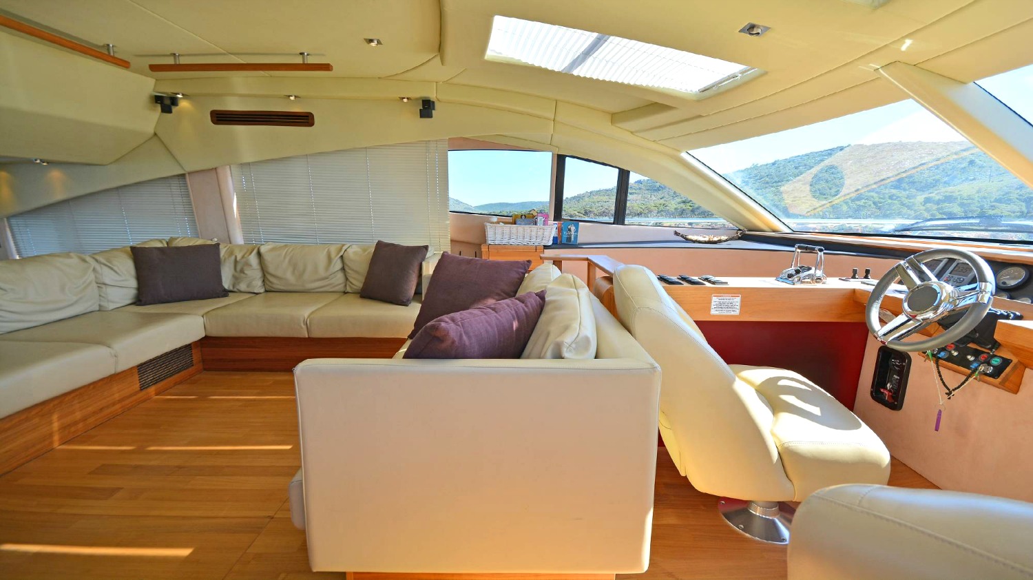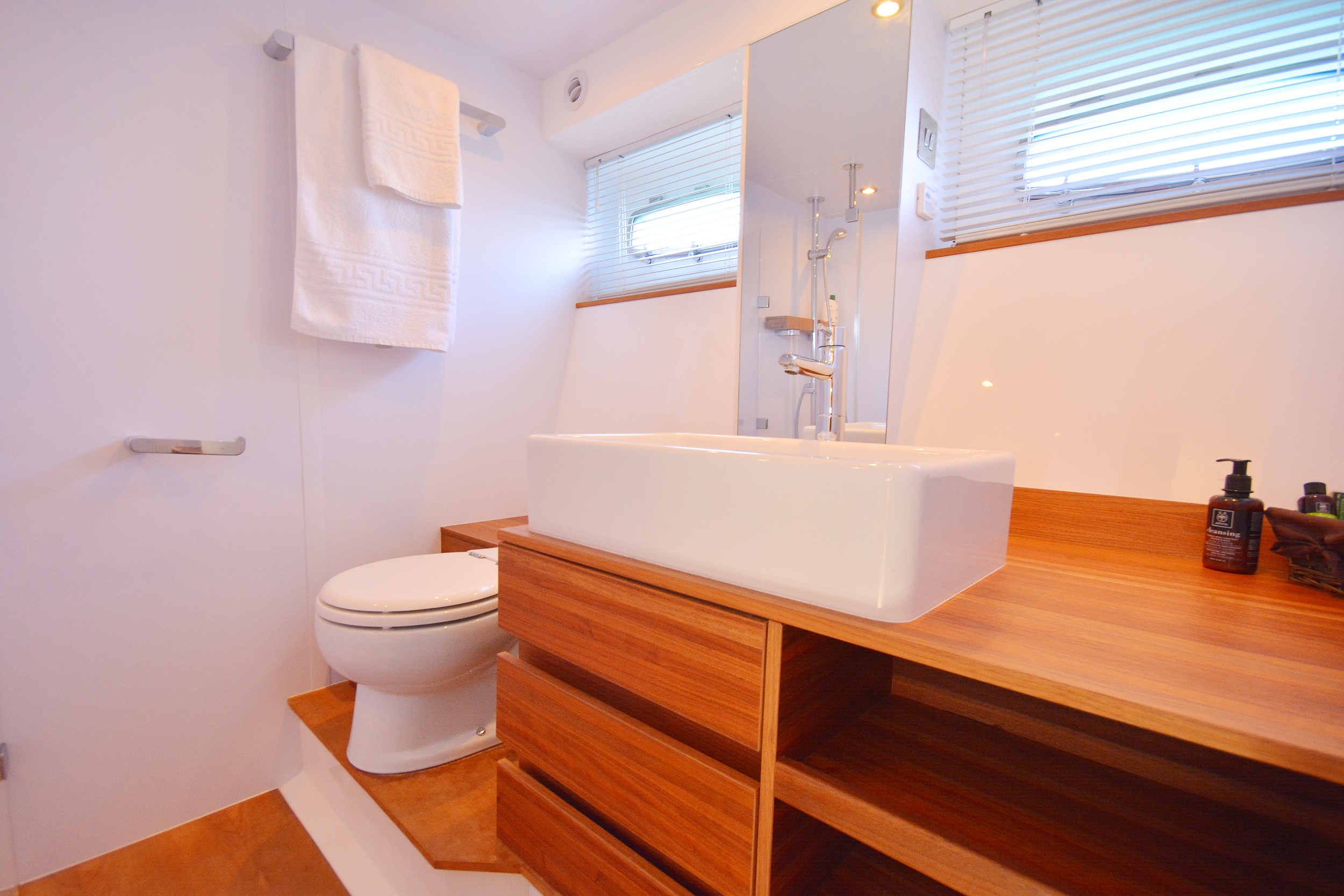 | Outside | Angelausrüstung, Anker mit Kette, Badeleiter, Badeplattform, Bootshaken, Cockpitpolster, Cockpittisch, Deckbürste, elektr. Ankerwinsch, elektr. Gangway, Fender, Festmacherleinen, Grill, Schnorchelausrüstung, Unterwasserbeleuchtung, Winschen |