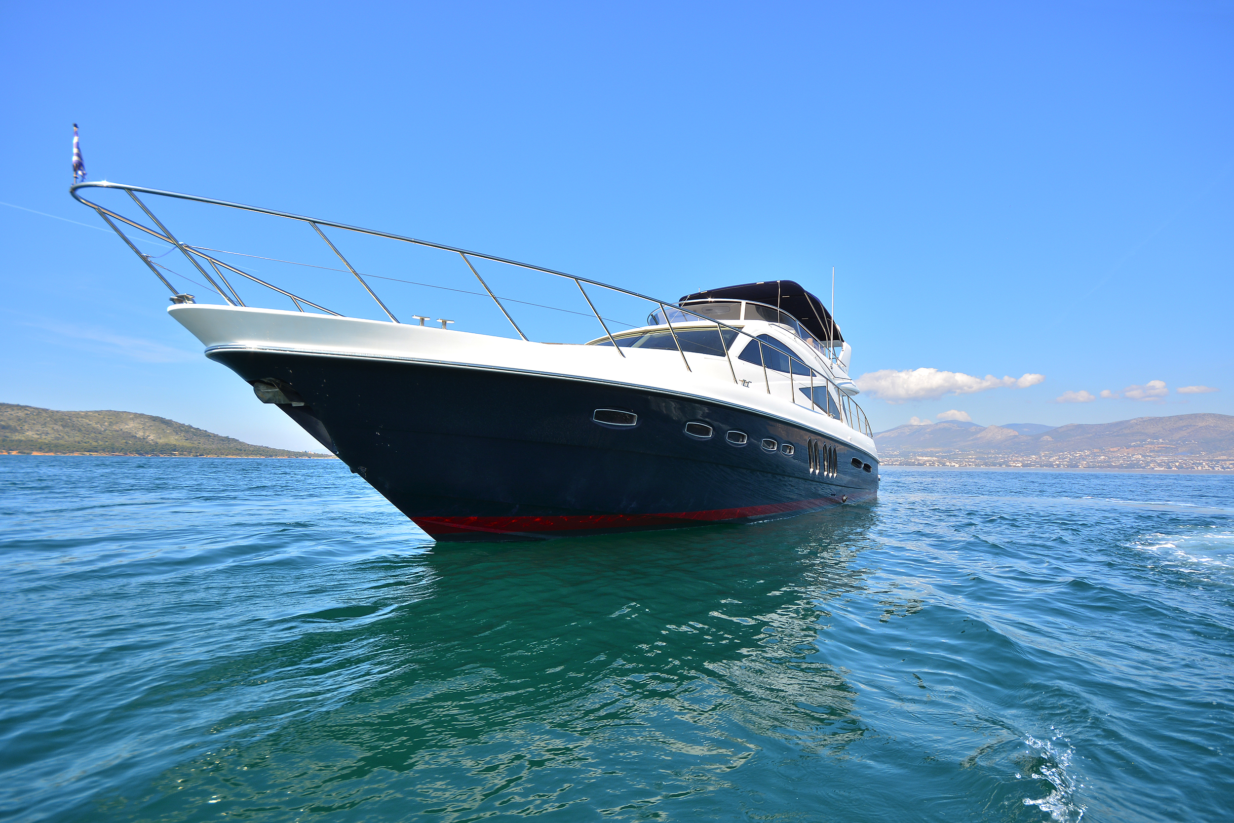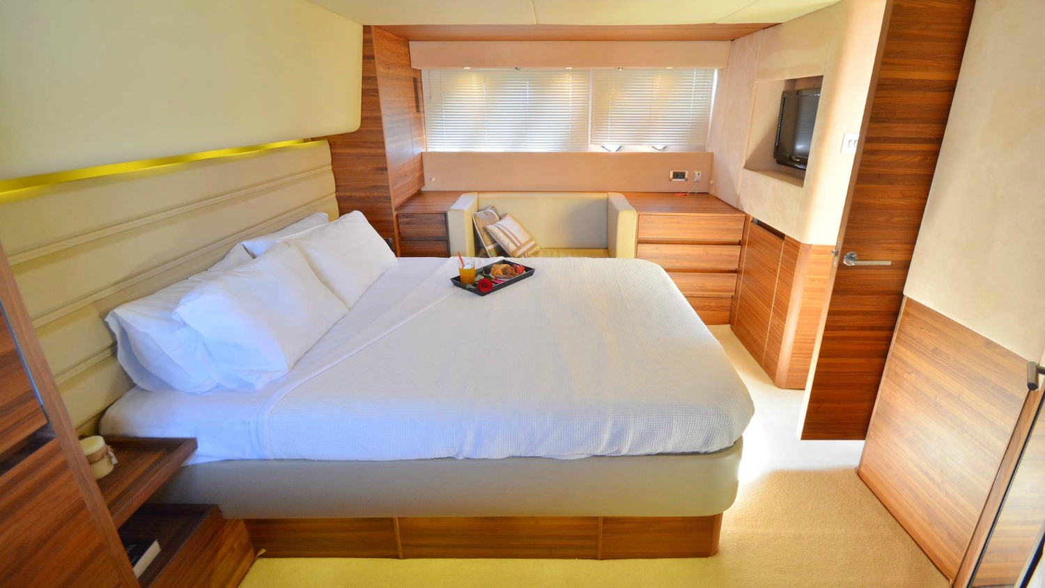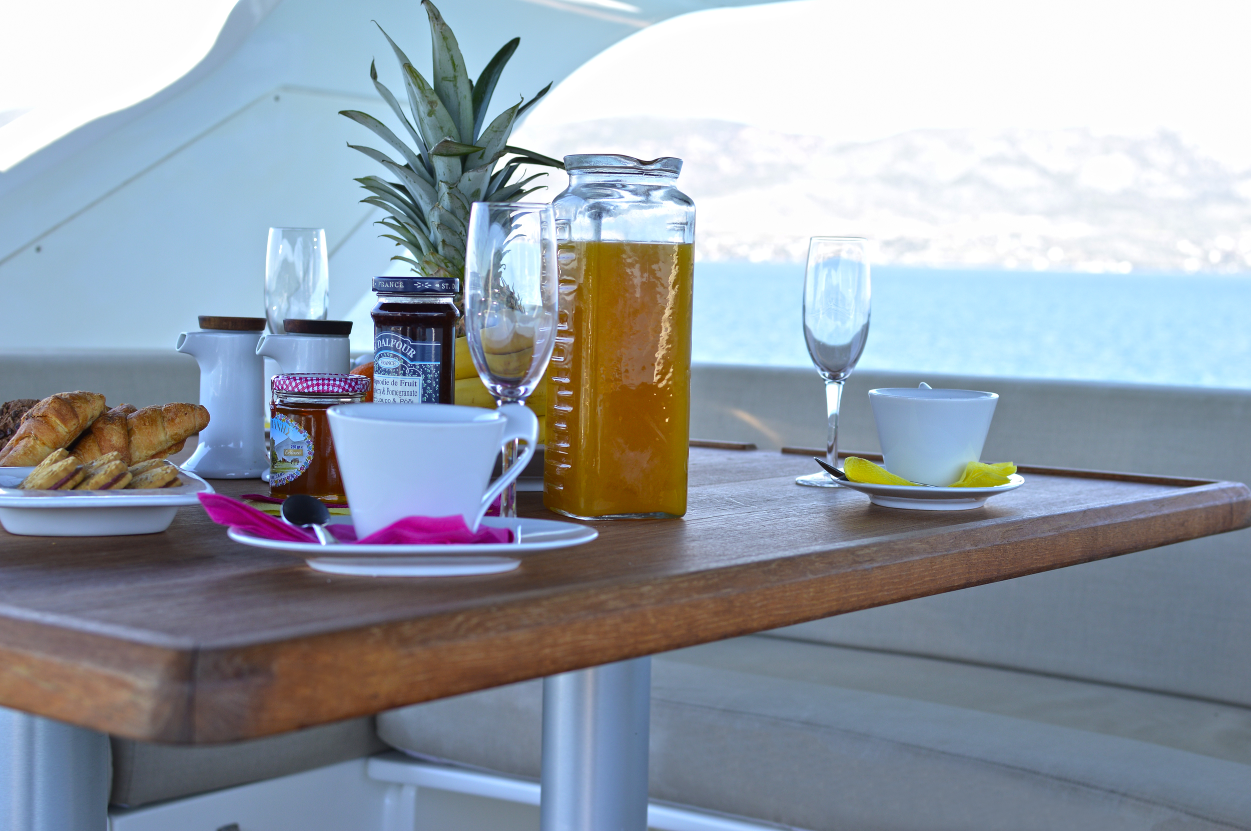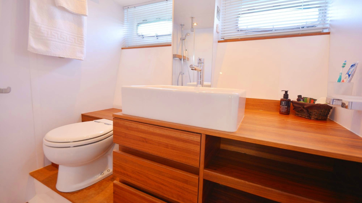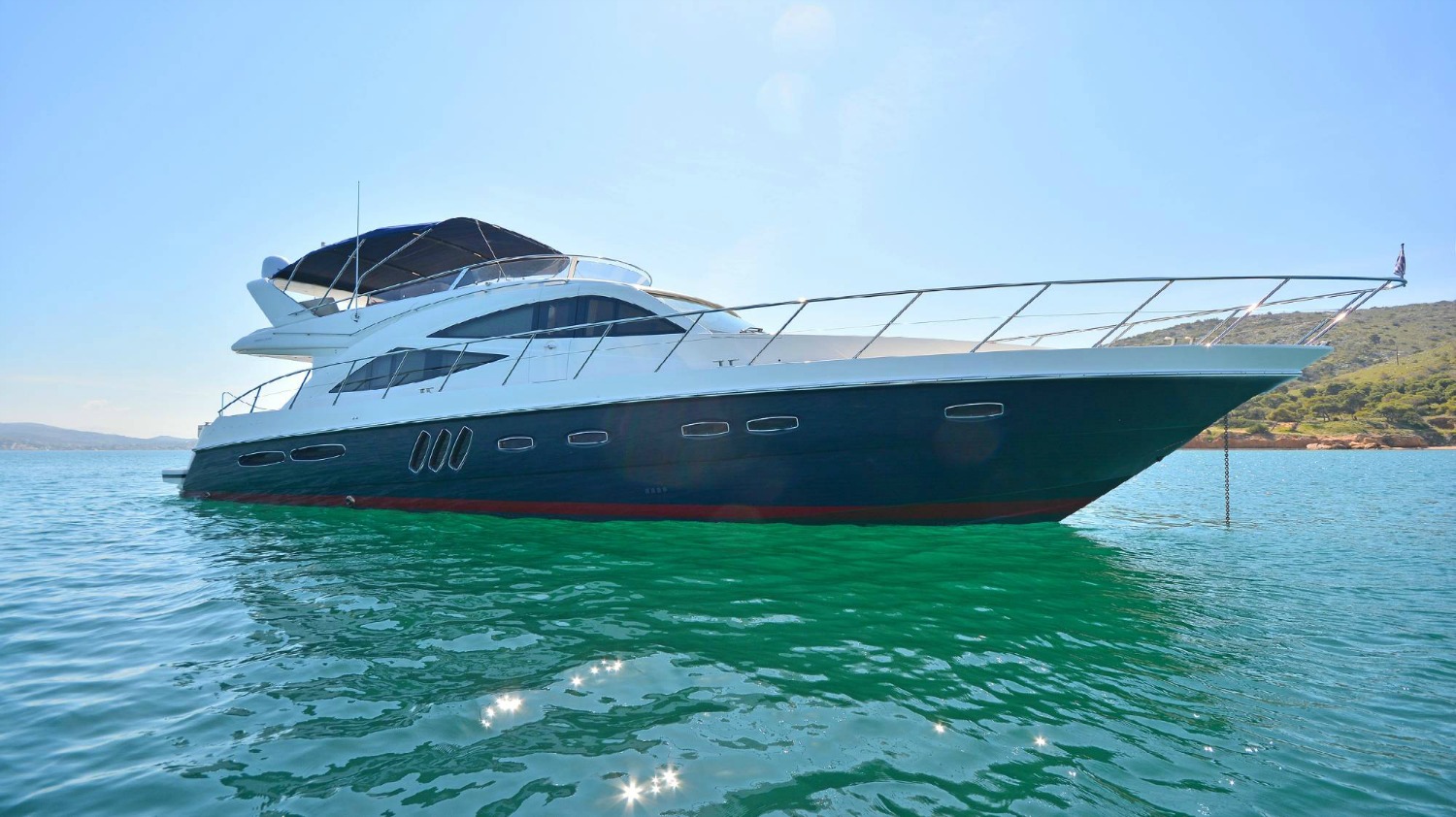 | Outside | Angelausrüstung, Anker mit Kette, Badeleiter, Badeplattform, Bootshaken, Cockpitpolster, Cockpittisch, Deckbürste, elektr. Ankerwinsch, elektr. Gangway, Fender, Festmacherleinen, Grill, Schnorchelausrüstung, Unterwasserbeleuchtung, Winschen |