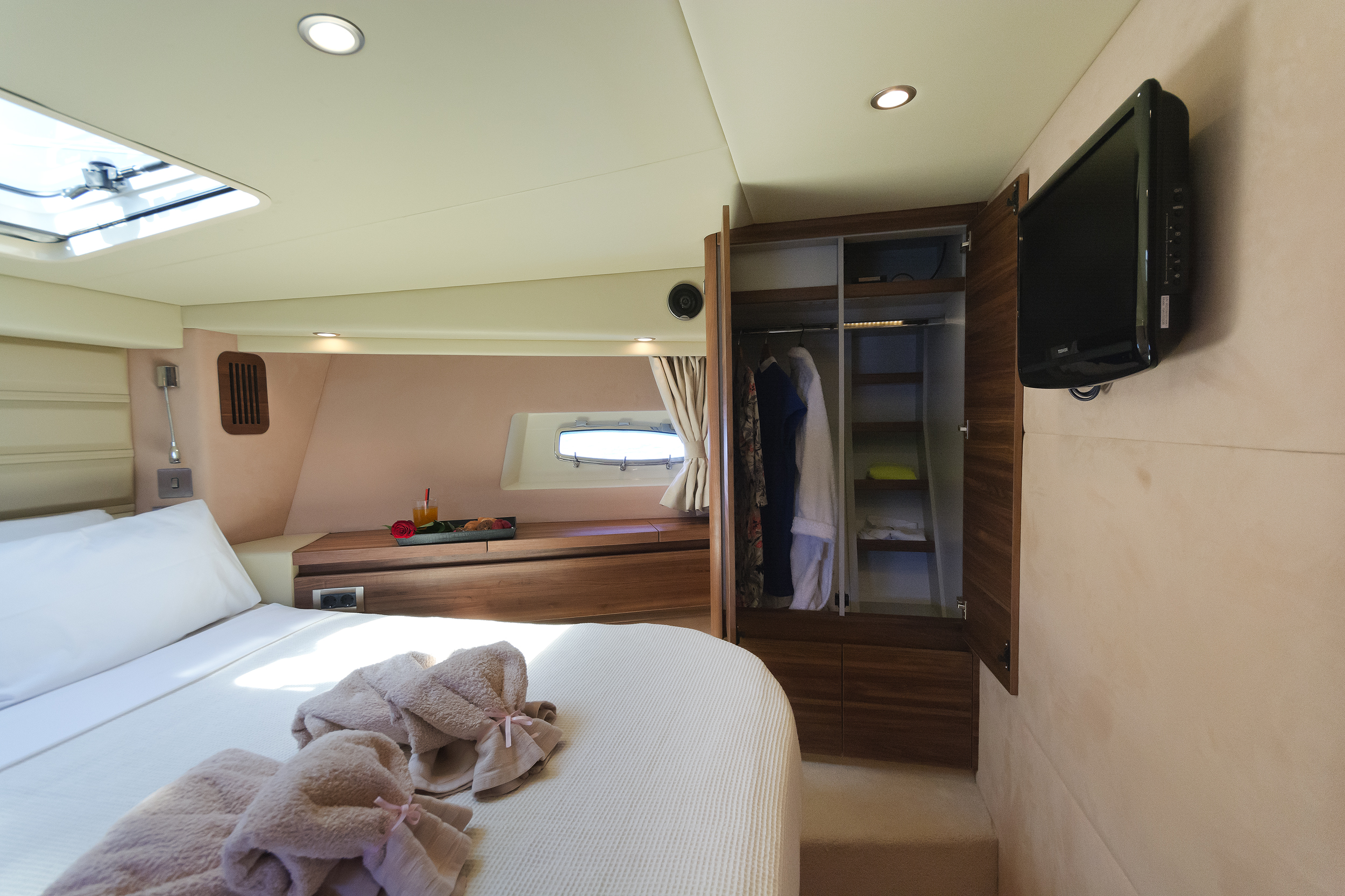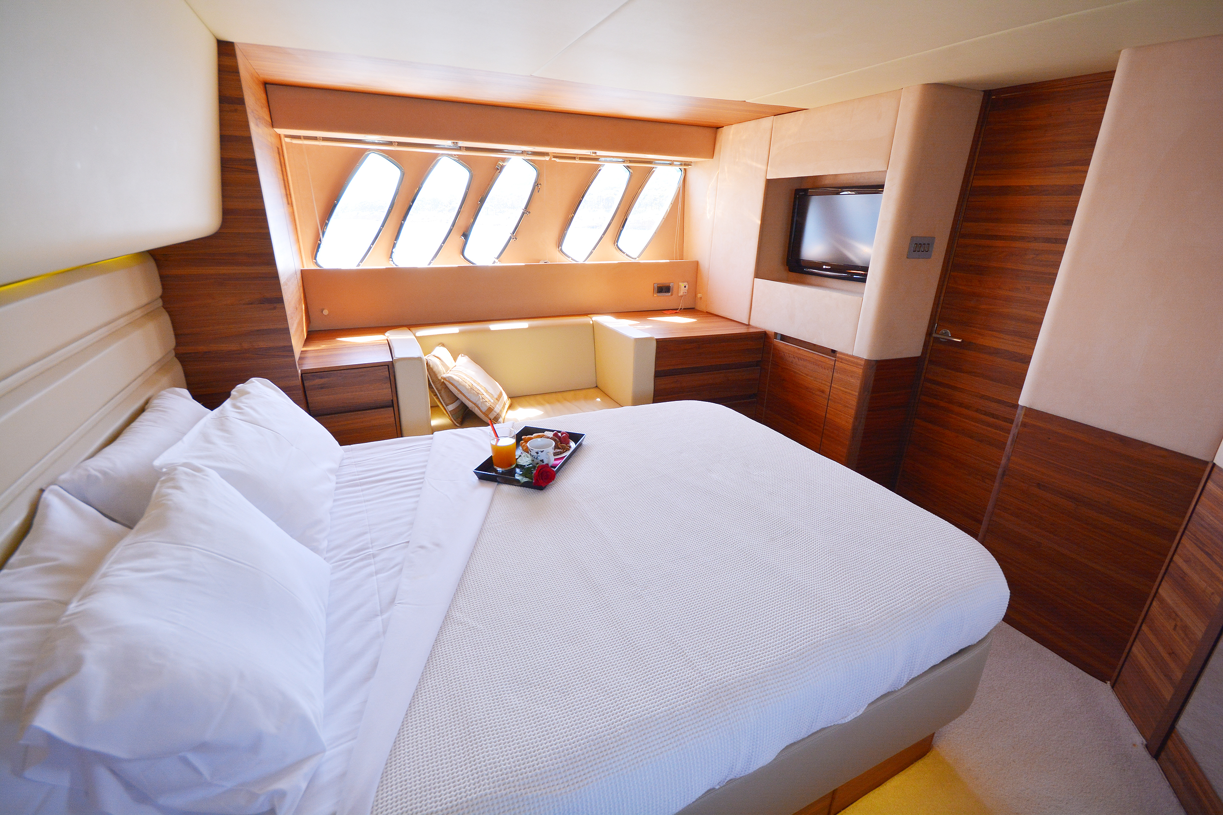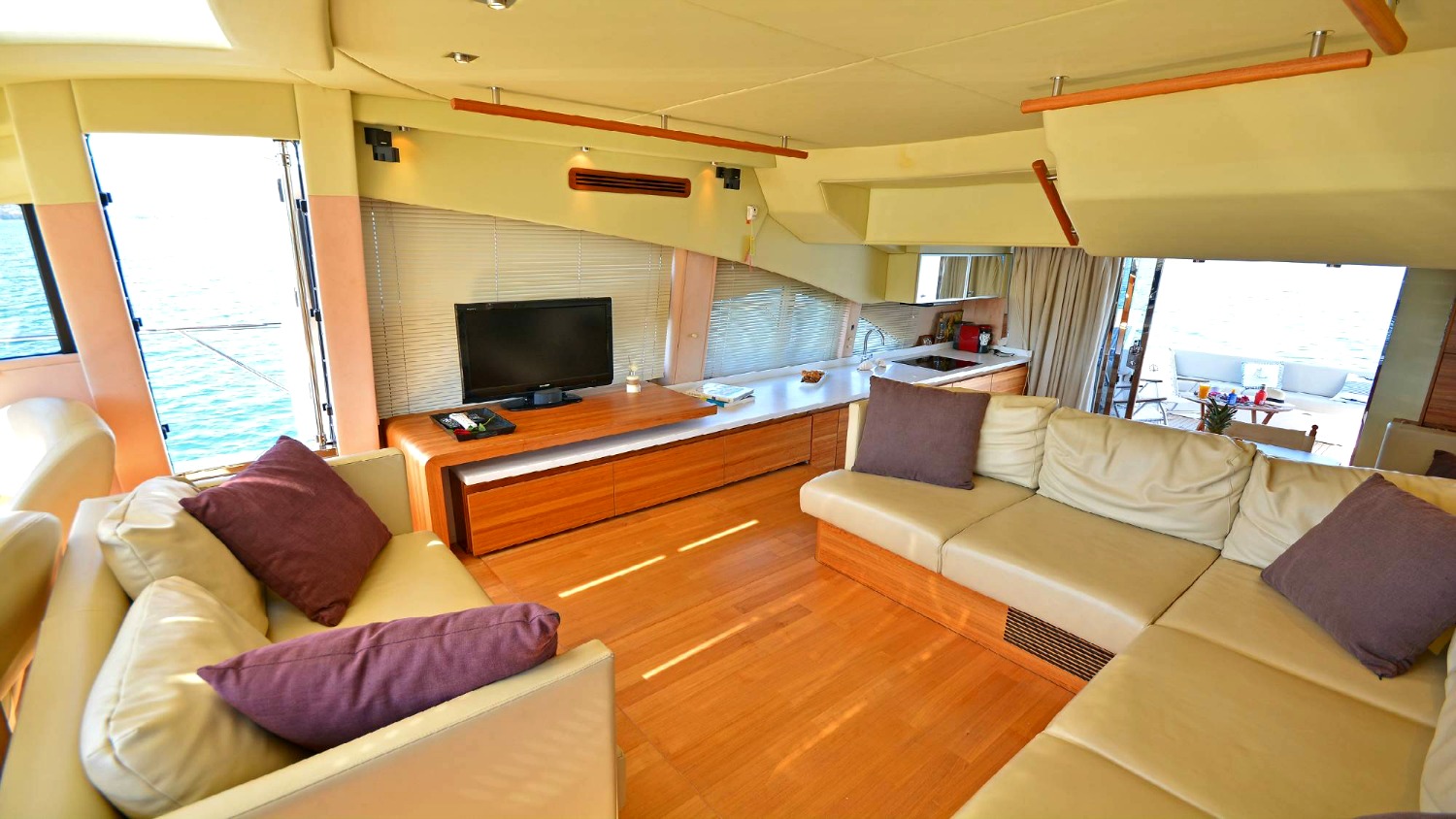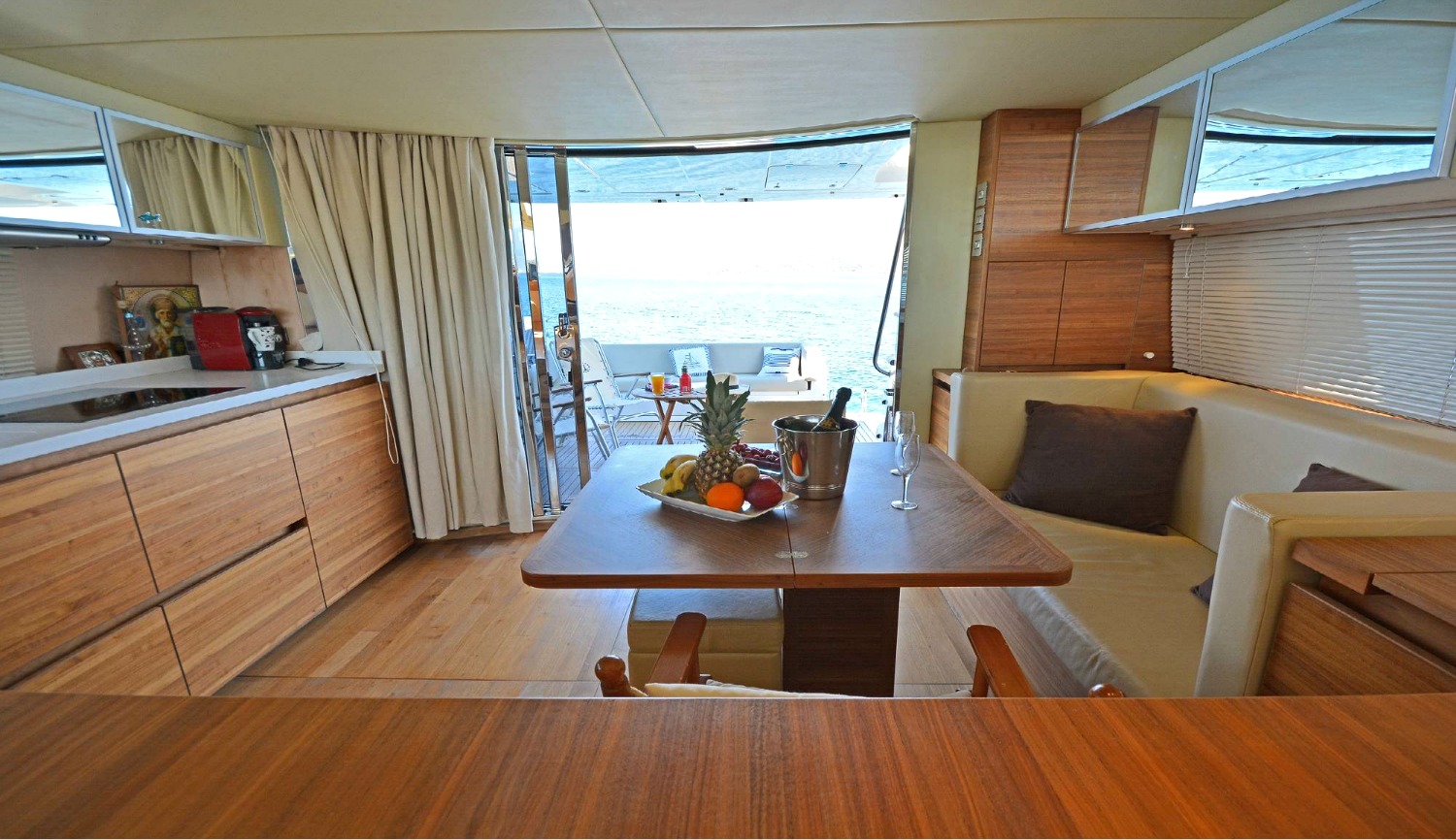 | Inside | 220V Steckdosen, Borduhr, Eiswürfelmaschine, Gasherd mit Backofen, Gefrierschrank, Generator, Hi-Fi System, Klimaanlage (ohne Landstrombedarf), Kühlschrank, Ladegerät, LCD Fernseher + DVD, Pantryausstattung, Satelliten-TV, Watermaker |
