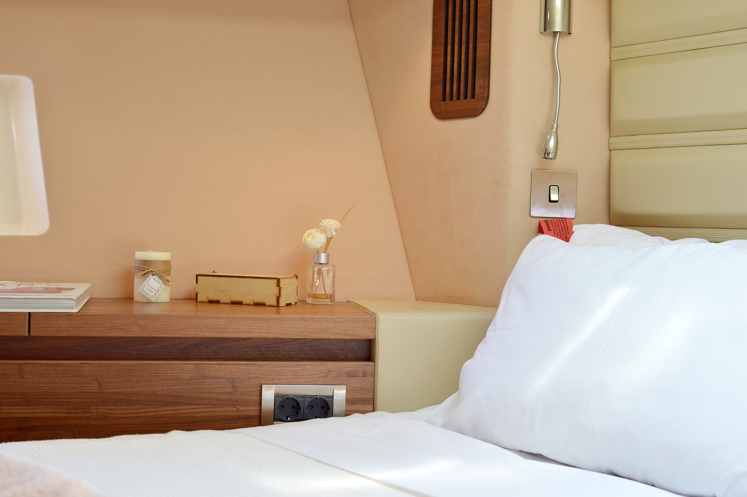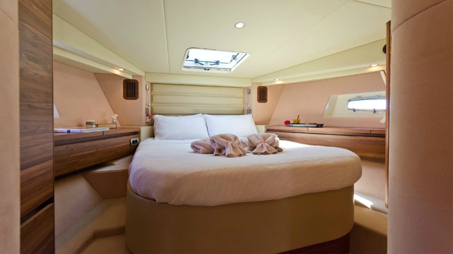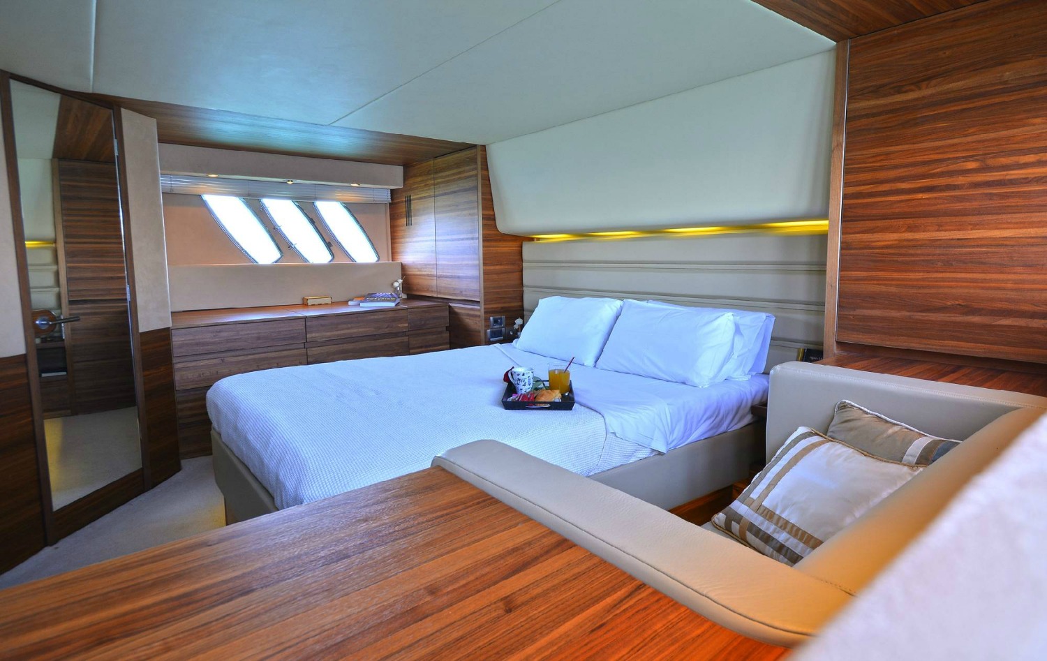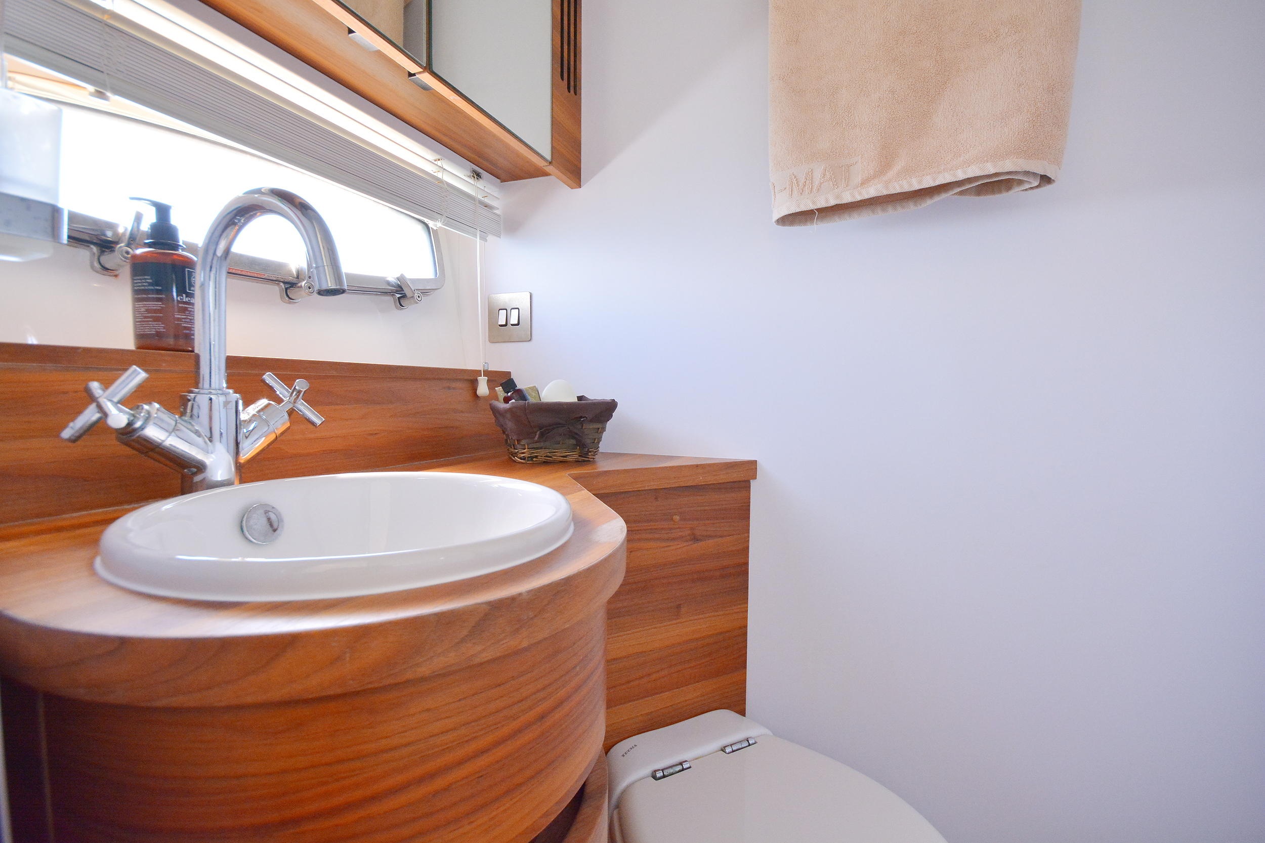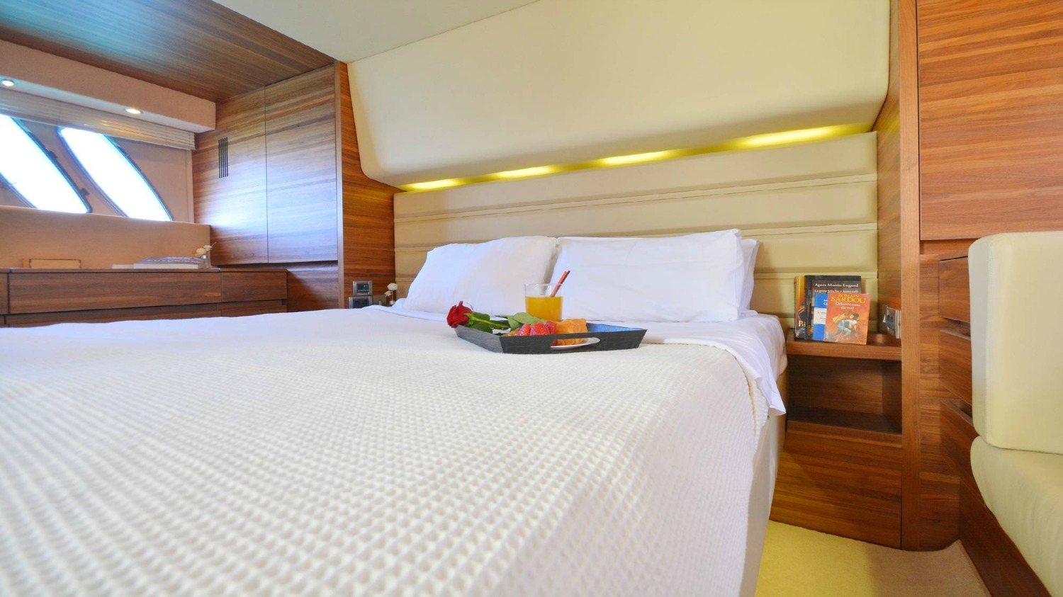 | Inside | 220V Steckdosen, Borduhr, Eiswürfelmaschine, Gasherd mit Backofen, Gefrierschrank, Generator, Hi-Fi System, Klimaanlage (ohne Landstrombedarf), Kühlschrank, Ladegerät, LCD Fernseher + DVD, Pantryausstattung, Satelliten-TV, Watermaker |