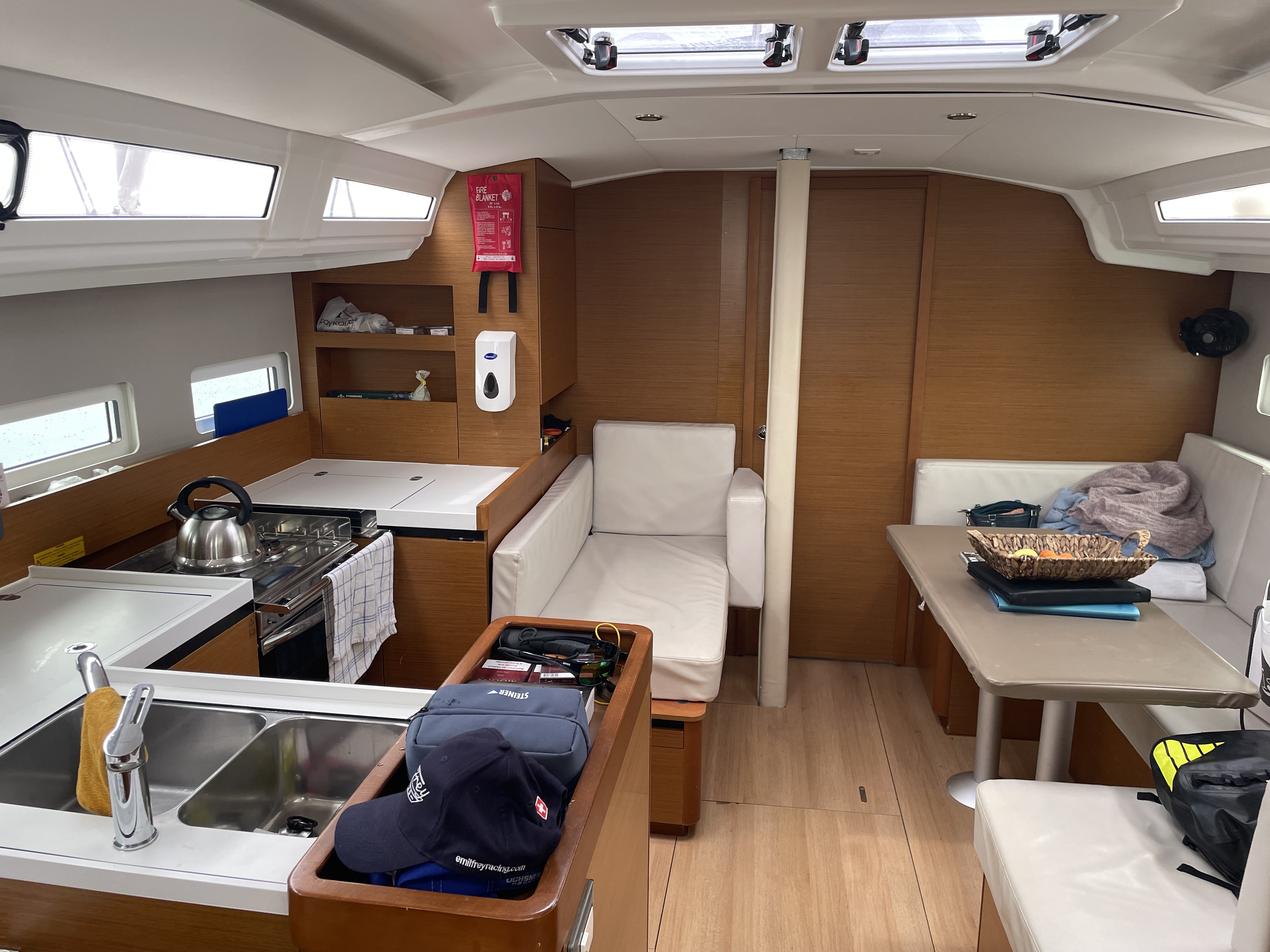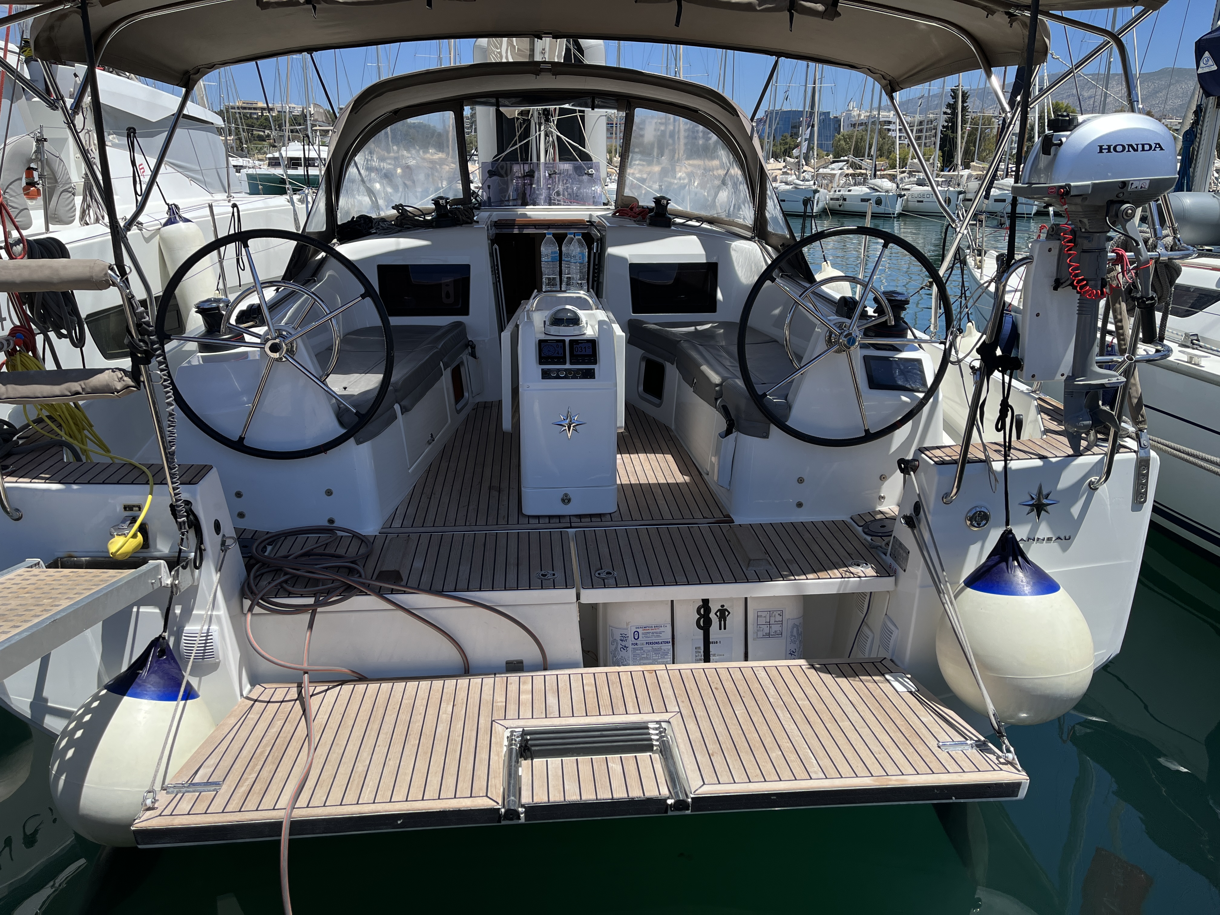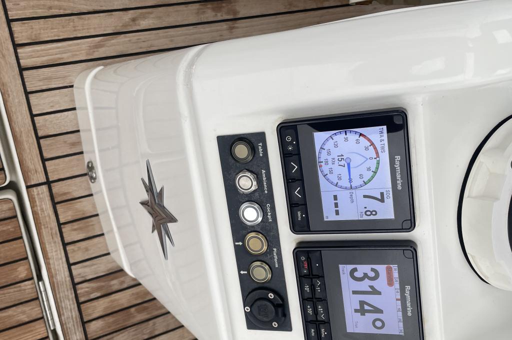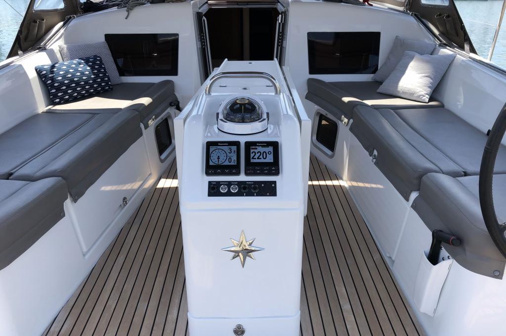 Outside Badeleiter, Biminitop, Cockpitdusche, Cockpitlautsprecher, Cockpitleuchte, Cockpitpolster, Cockpittisch, elektr. Ankerwinsch, Gangway, Solaranlage, Sonnendeck, Sprayhood, Teak im Cockpit, Unterwasserbeleuchtung, Windex