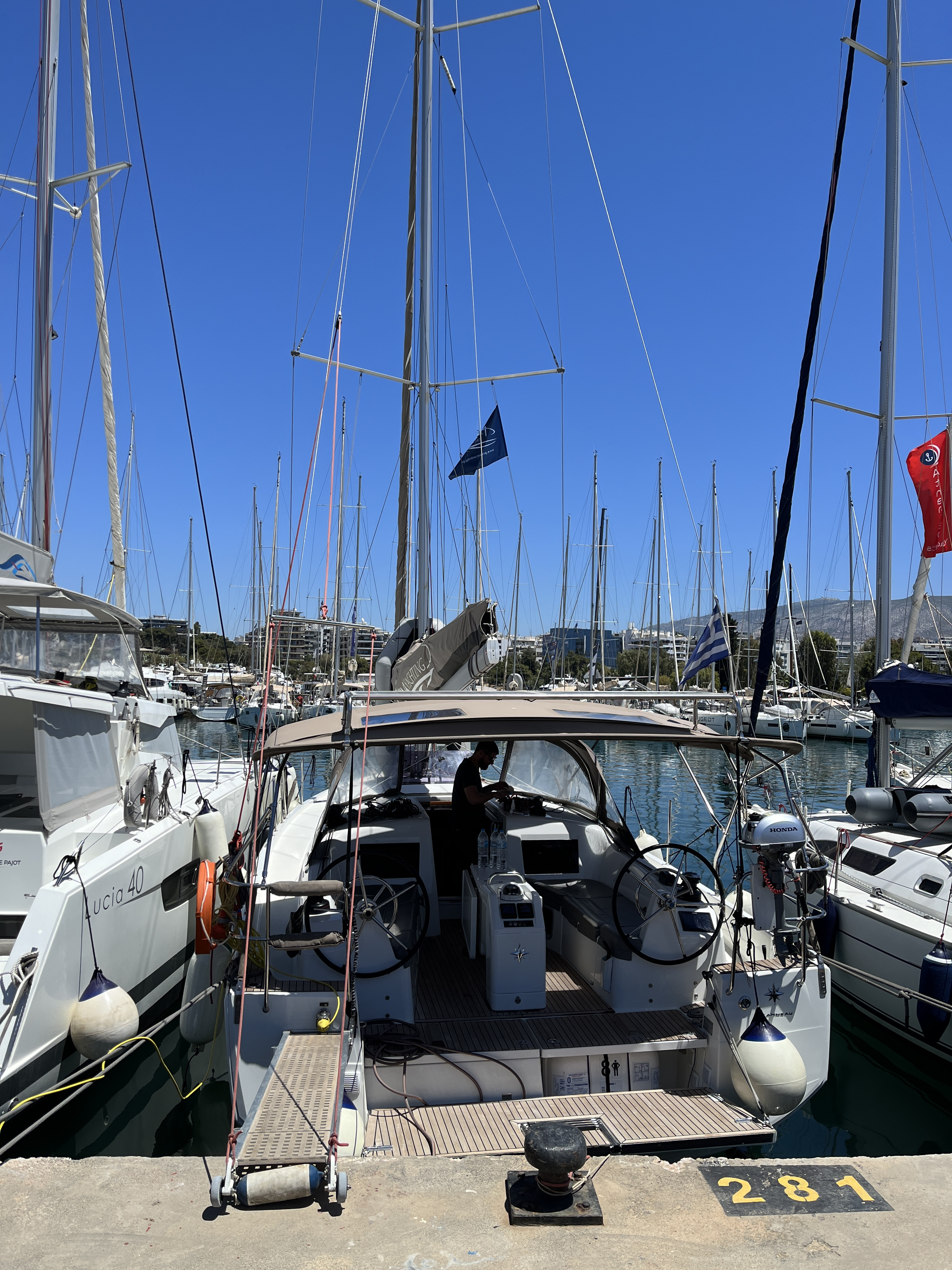 - bei Übernahme musste der Lümmelbeschlag erneuert werden; der dadurch entstandene Dreck (Metallspäne) wurde nicht entfernt und musste von mir in 2 stündiger Arbeit vor Auslaufen entfernt werden. Lapidar hieße es, der Wind würde den Dreck schön wegwehen. Das Verletzungsrisiko durch die Späne (an Schoten und am Deckboden) war dem Hafenpersonal egal.