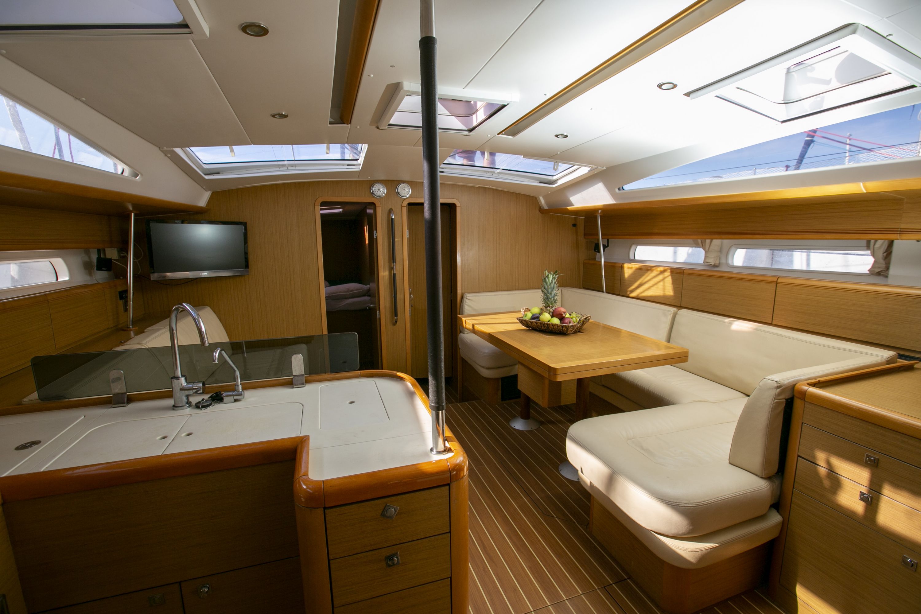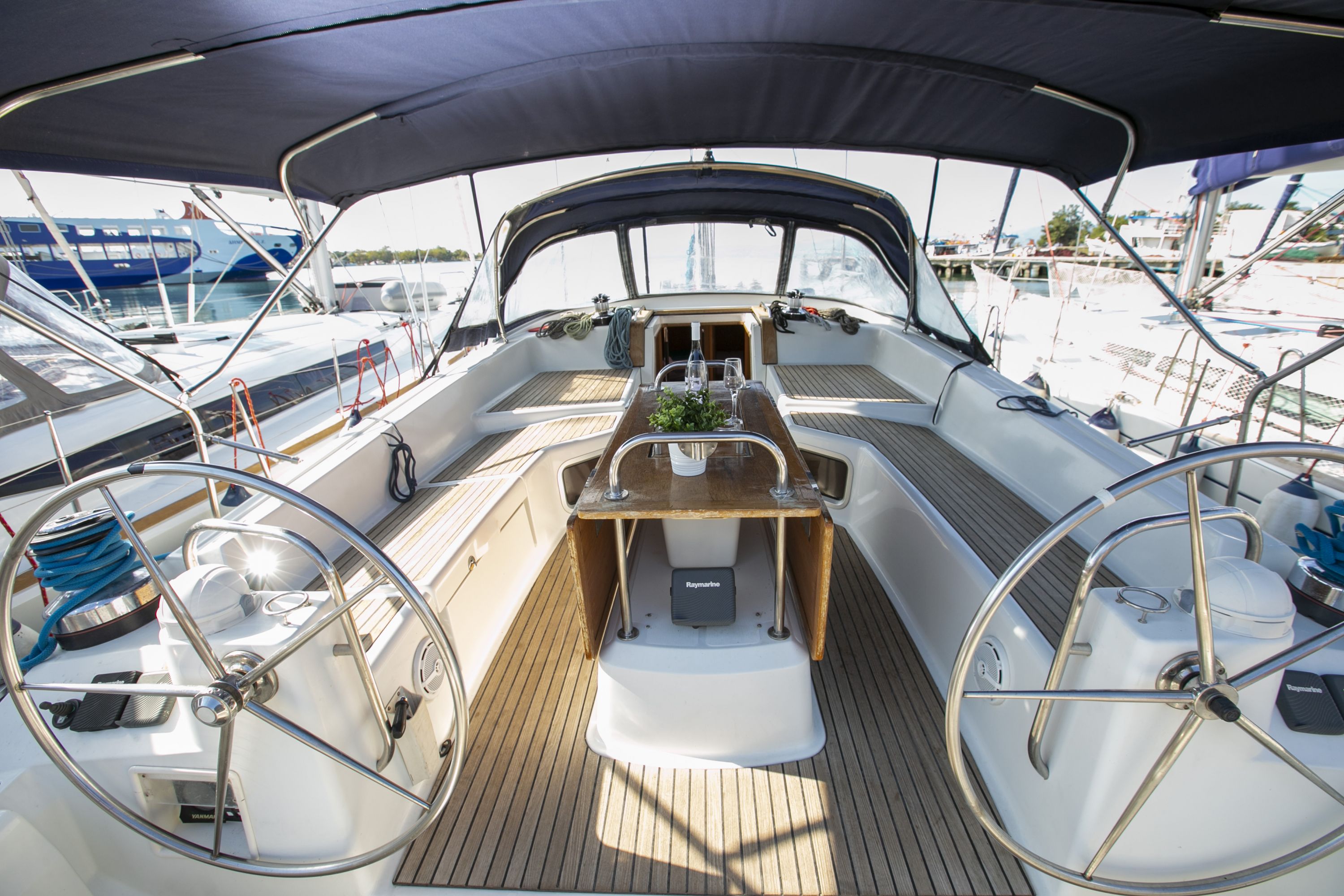 | Outside | 220 V-Landanschluss, Badeleiter, Biminitop, Cockpitdusche, Cockpitlautsprecher, Cockpitpolster, elektr. Ankerwinsch, elektr. Großwinsch, hydraul. Gangway, Sprayhood, Teak im Cockpit, Wantenschneider |