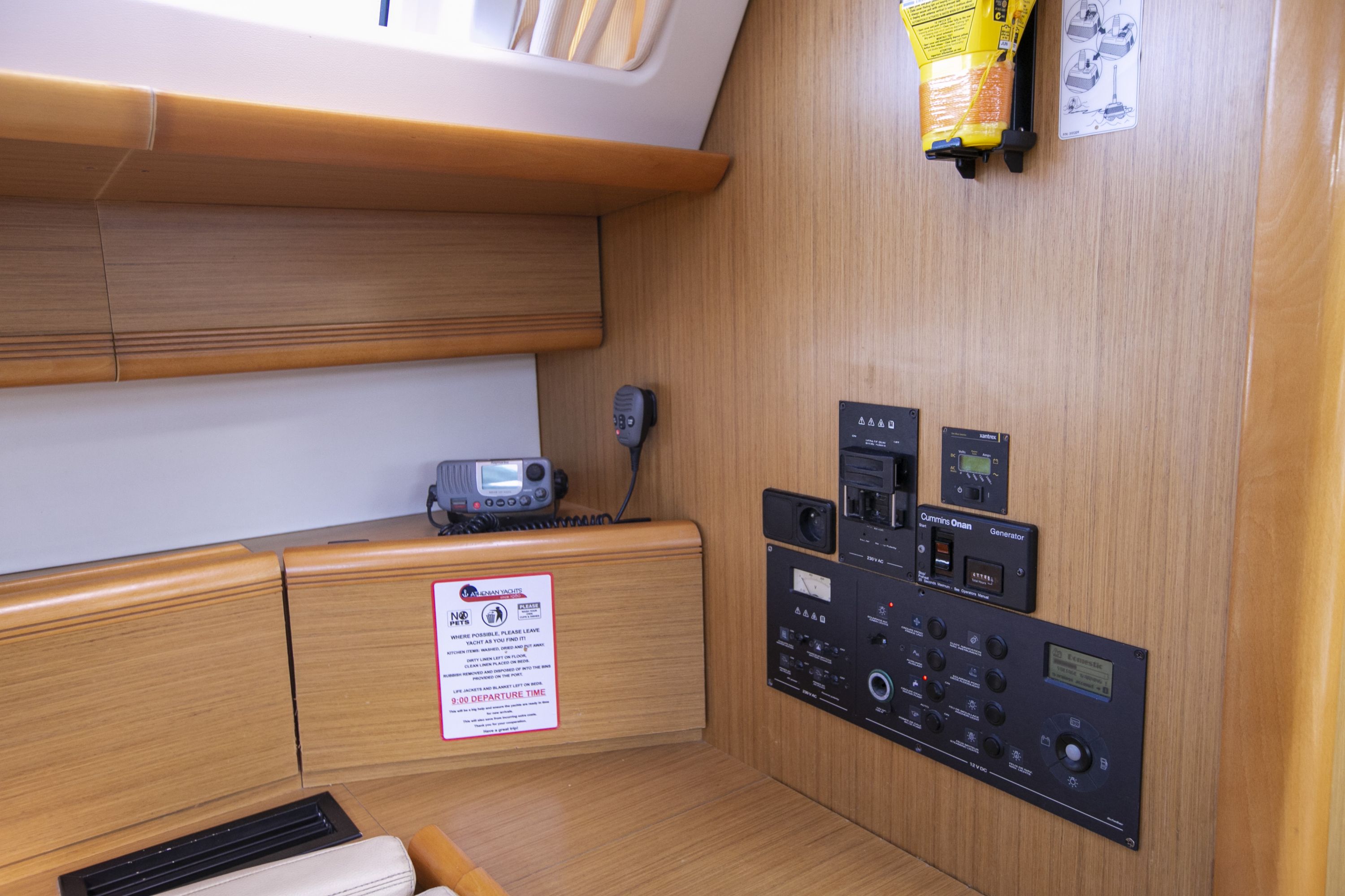 | Safety | Autopilot, Bootsmannstuhl, Bordapotheke, Bordwerkzeug, Epirb, Feststoffschwimmwesten, Feuerlöscher, Leuchtboje, Lifebelts, Nebelhorn, Notpinne, Notsignale, Rettungsinsel, UKW-Funk, Zweitanker |