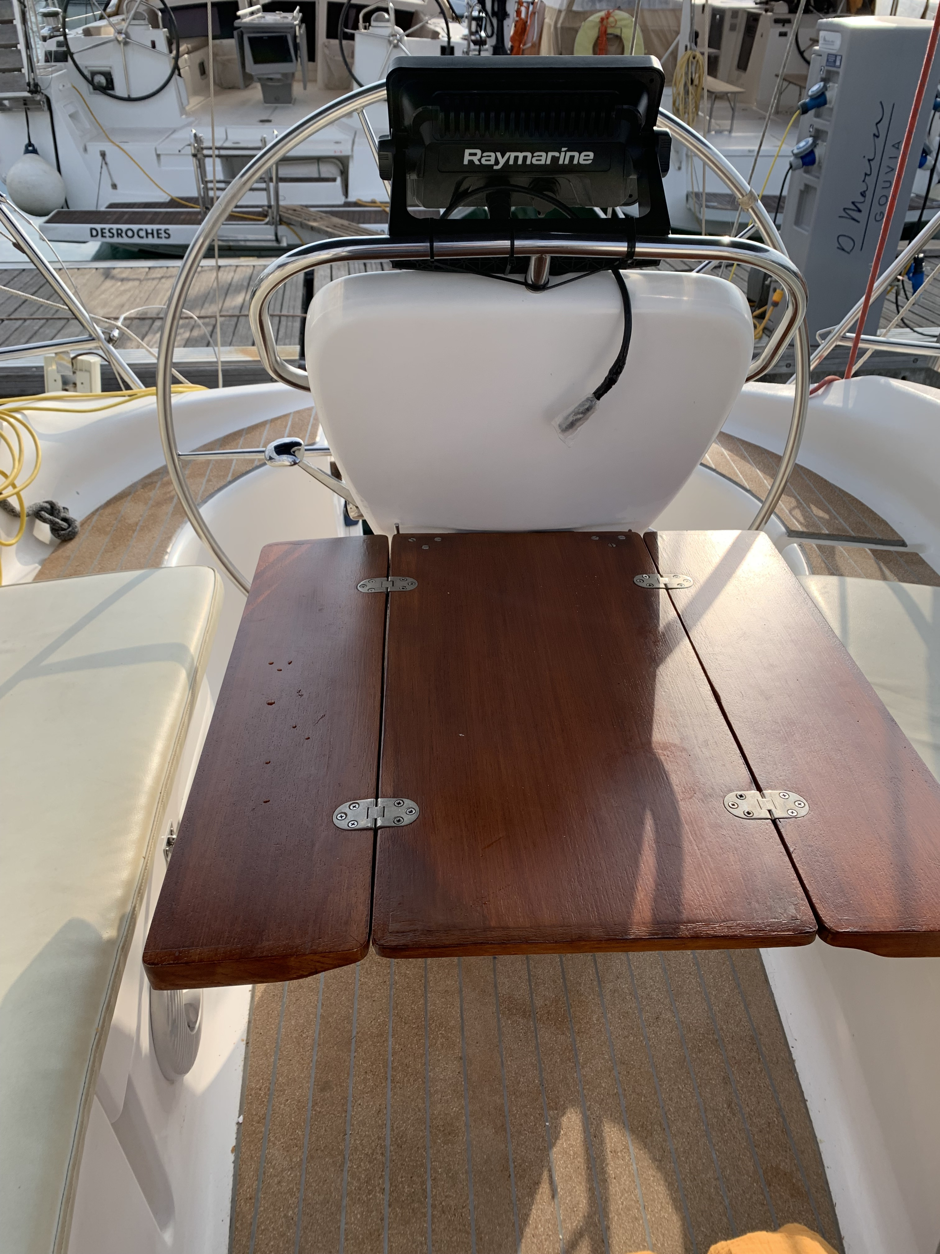 | Outside | 220 V-Landanschluss, Anker mit Kette, Biminitop, Bootshaken, Cockpitdusche, Cockpitlautsprecher, Cockpitpolster, Cockpittisch, Deckbürste, Dieselkanister , elektr. Ankerwinsch, Fender, Festmacherleinen, Gangway, Schnorchelausrüstung, Selbstholende Winschen, Sonnensegel, Windex, Winschen |