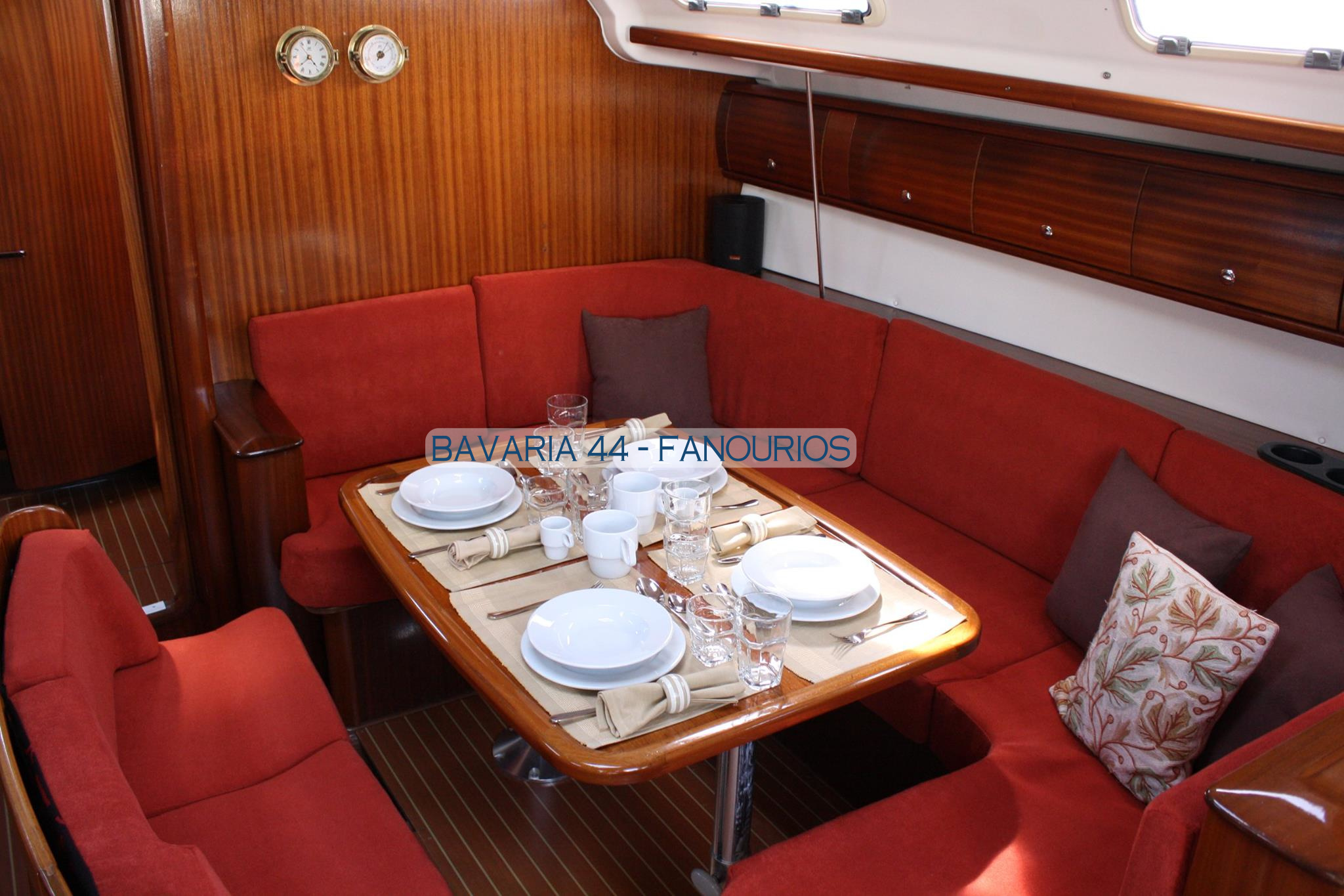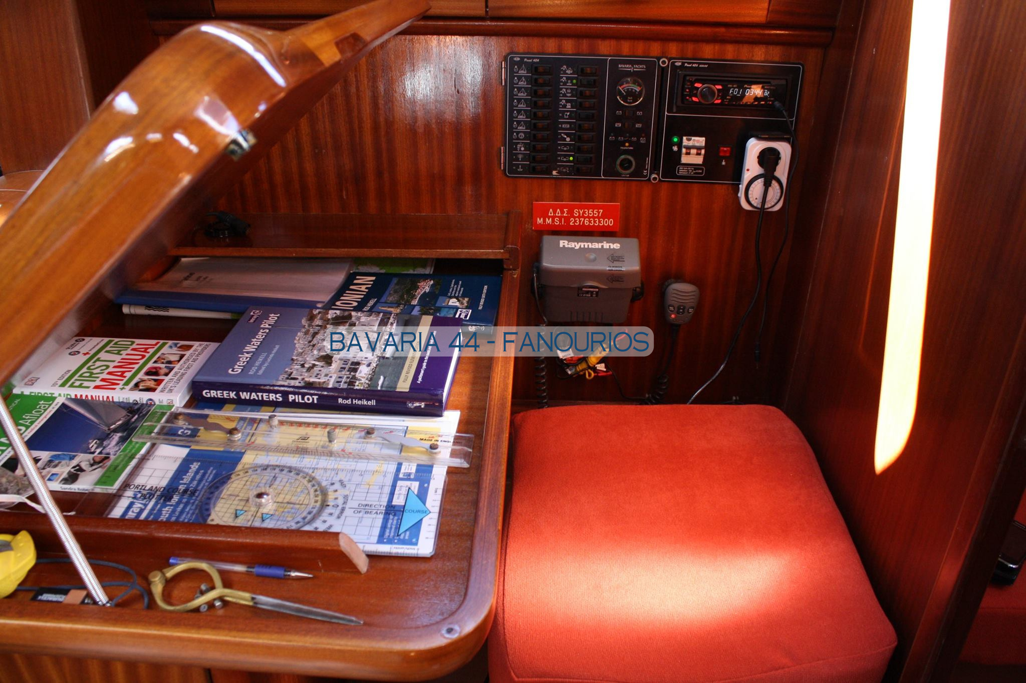 | Navigation | Barometer, Echolot, Fernglas mit Peilkompass, GPS mit Kartenplotter, GPS mit Kartenplotter im Salon, Hafenhandbücher, Handpeilkompass, Navigationsbesteck, Seekarten, Sumlog, Tridata (Log, Echolot, Windm.), Windmesser |