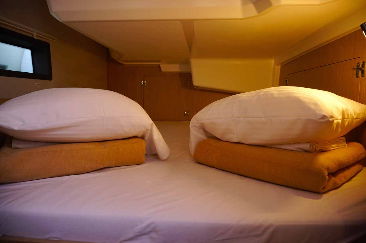 | Inside | Inverter 12V/220V, Kühlschrank, Ladegerät, Luftpumpe für Beiboot, Pantryausstattung, Radio mit USB, Bluetooth und AUX-In, USB Steckdosen in Salon und Kabinen, Warmwasser, WC (elektr.) |