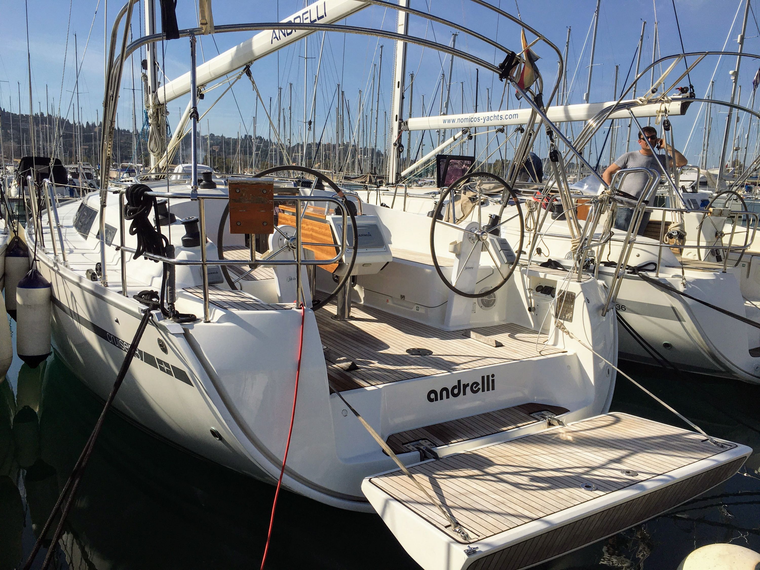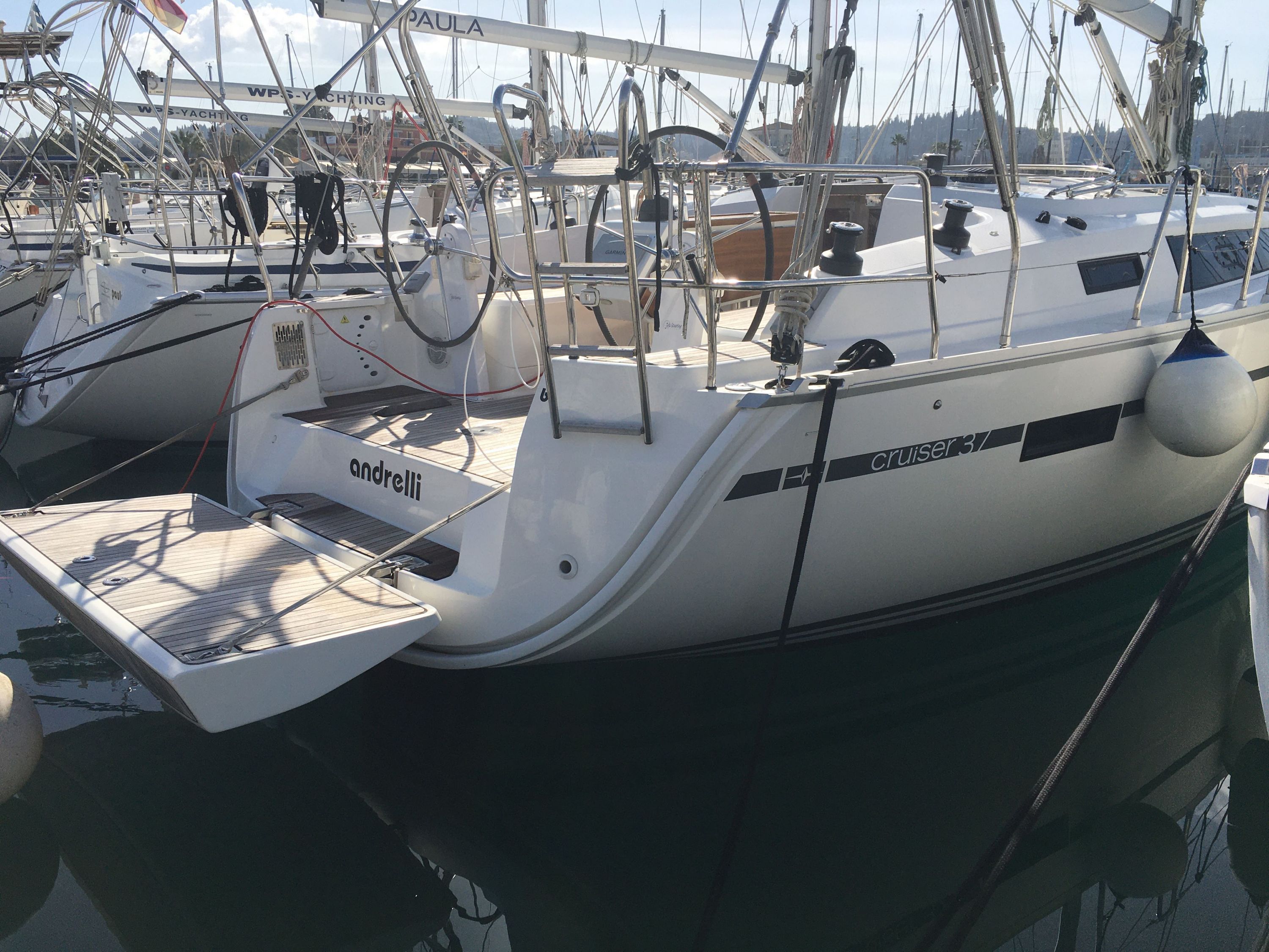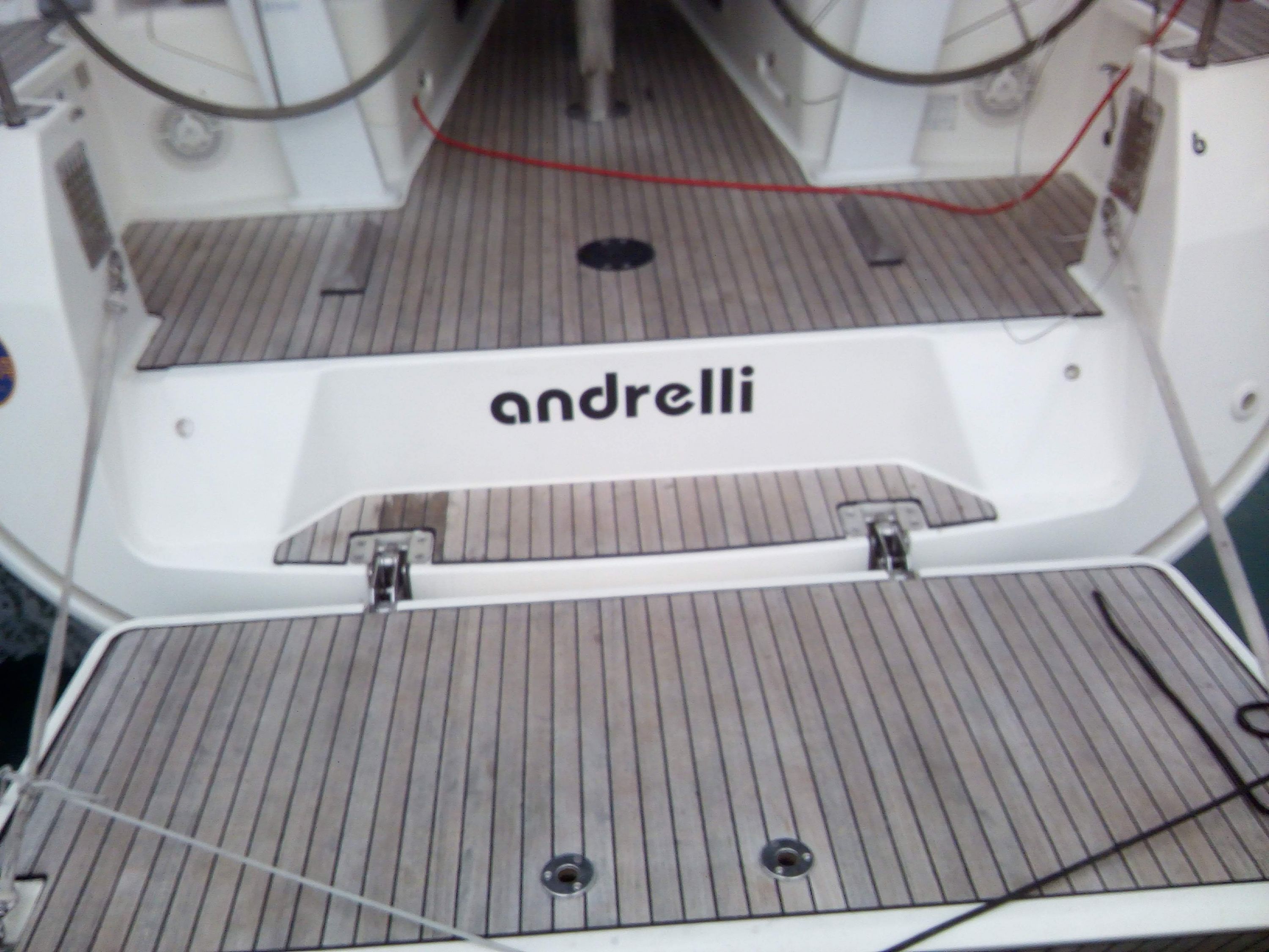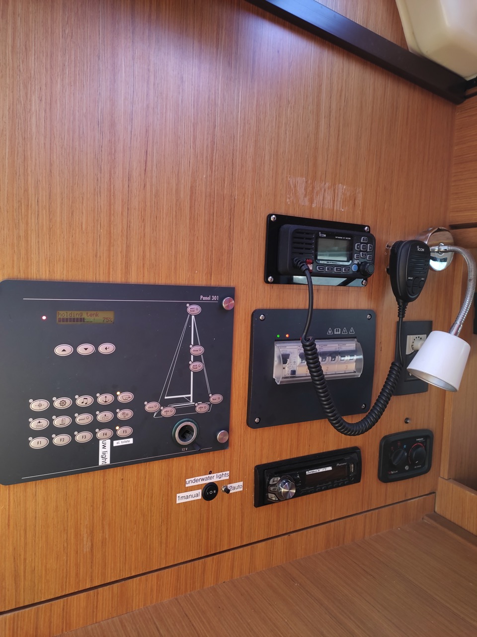 | Outside | 12 V-Anschluss, Anker mit Kette, Badeleiter, Badeplattform, Biminitop, Cockpitdusche, Cockpitlautsprecher, Cockpittisch, elektr. Ankerwinsch, Fender, Festmacherleinen, Gangway, Segel-Flickwerkzeug, Solaranlage, Sprayhood, Teakdeck, Treibanker, Wasserschlauch, Windex |