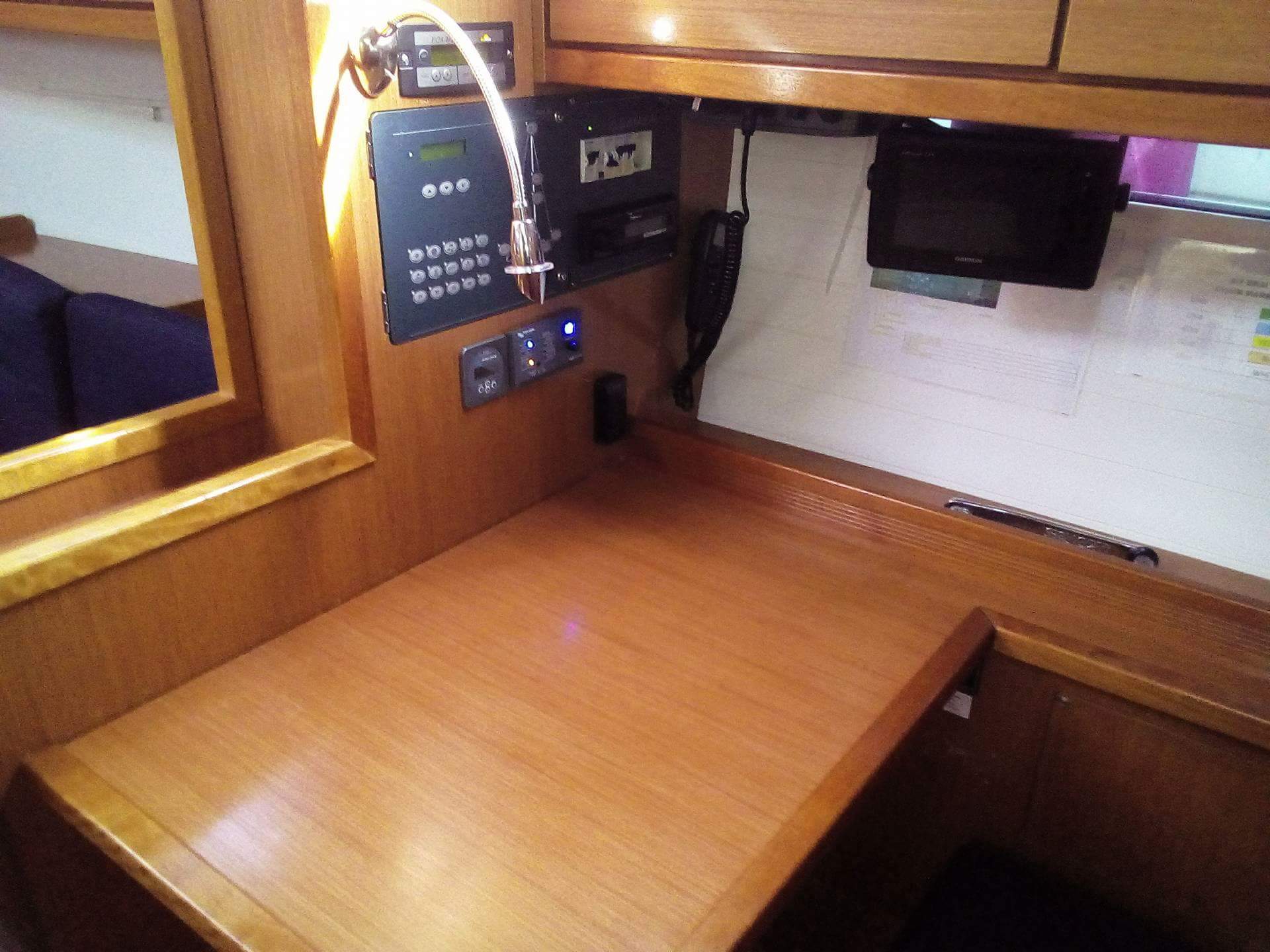 | Navigation | Barometer, Fernglas, GPS mit Kartenplotter im Cockpit, GPS mit Kartenplotter im Salon, Hafenhandbücher, Handpeilkompass, Kartenplotter im Salon, Kompass, Seekarten, Tridata (Log, Echolot, Windm.) |
