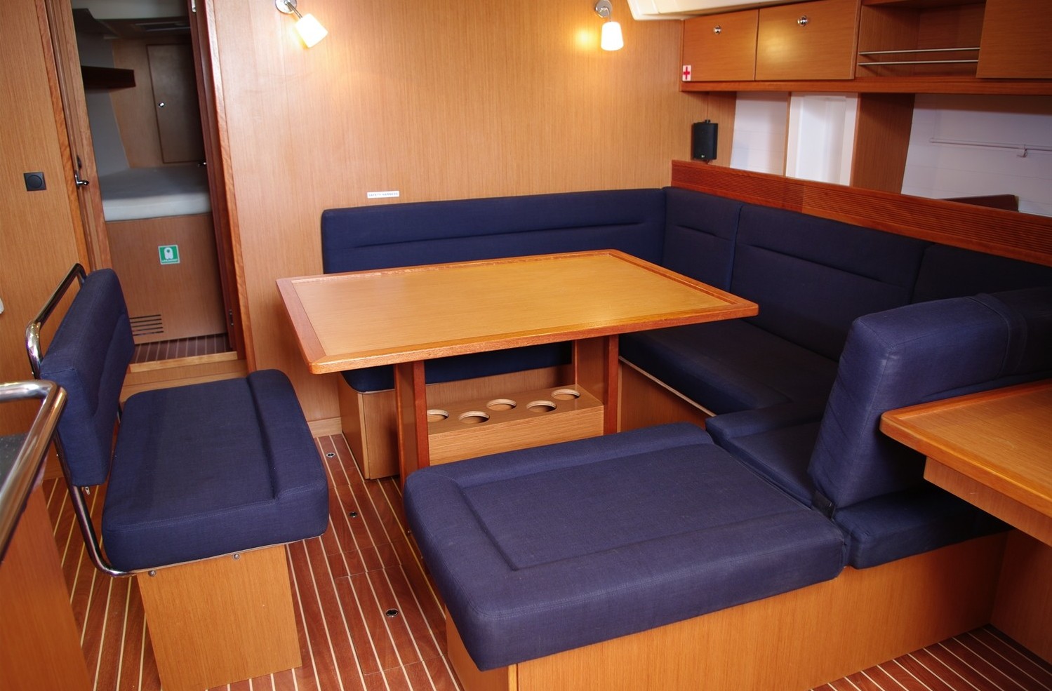 | Safety | Autopilot, Bootsmannstuhl, Bordapotheke, Bordwerkzeug, Bugstrahlruder, elektr. Bilgepumpe, Feststoffschwimmwesten, Feuerlöscher, Flaggen, Leuchtboje, Navigationslichter, Nebelhorn, Notpinne, Notsignale, Radarreflektor, Reserve-Motoröl, Rettungsinsel, Rettungskragen, Sicherheitsgurt, Taschenlampe, UKW-Funk |