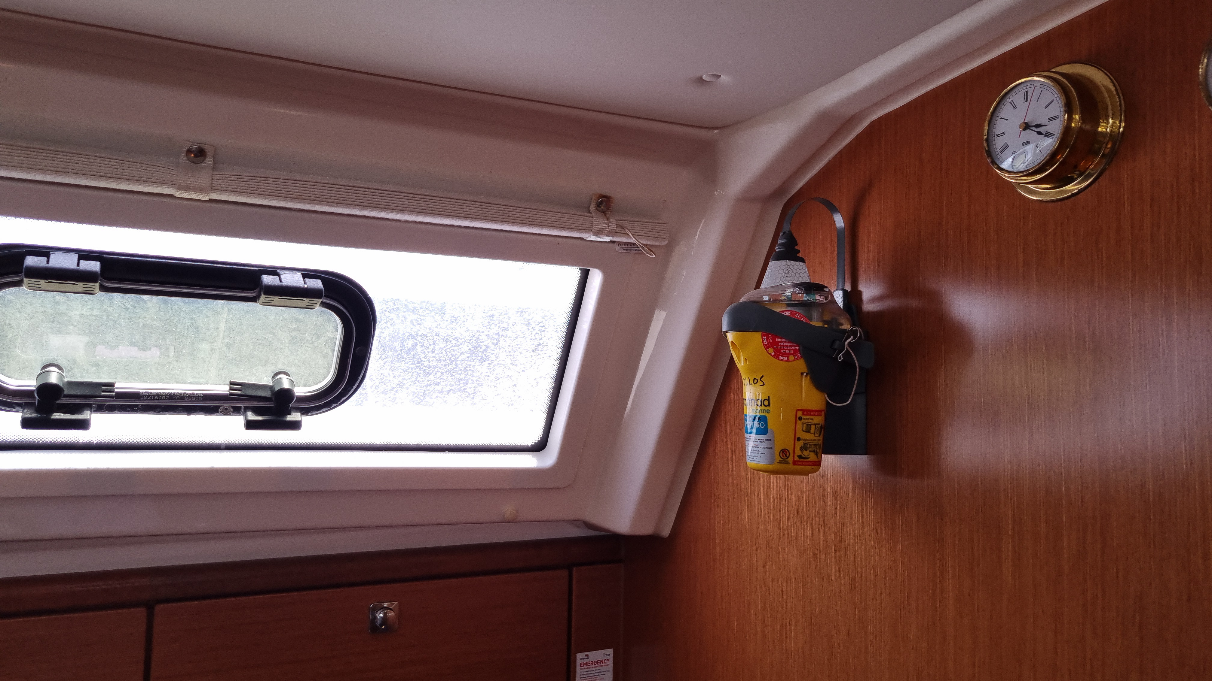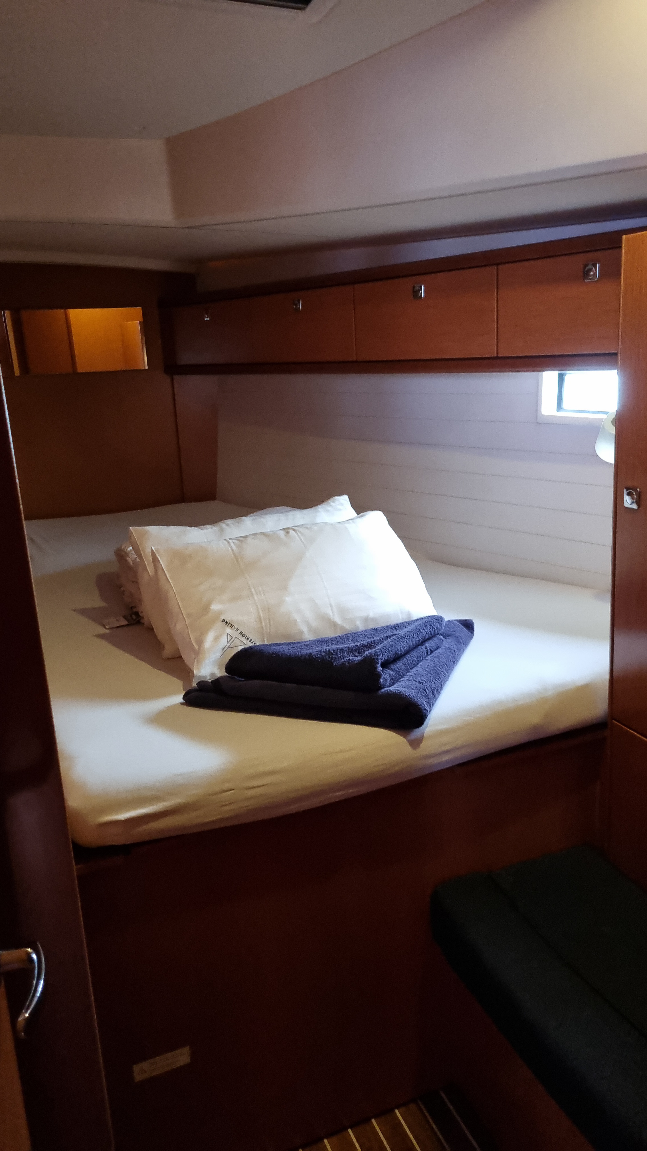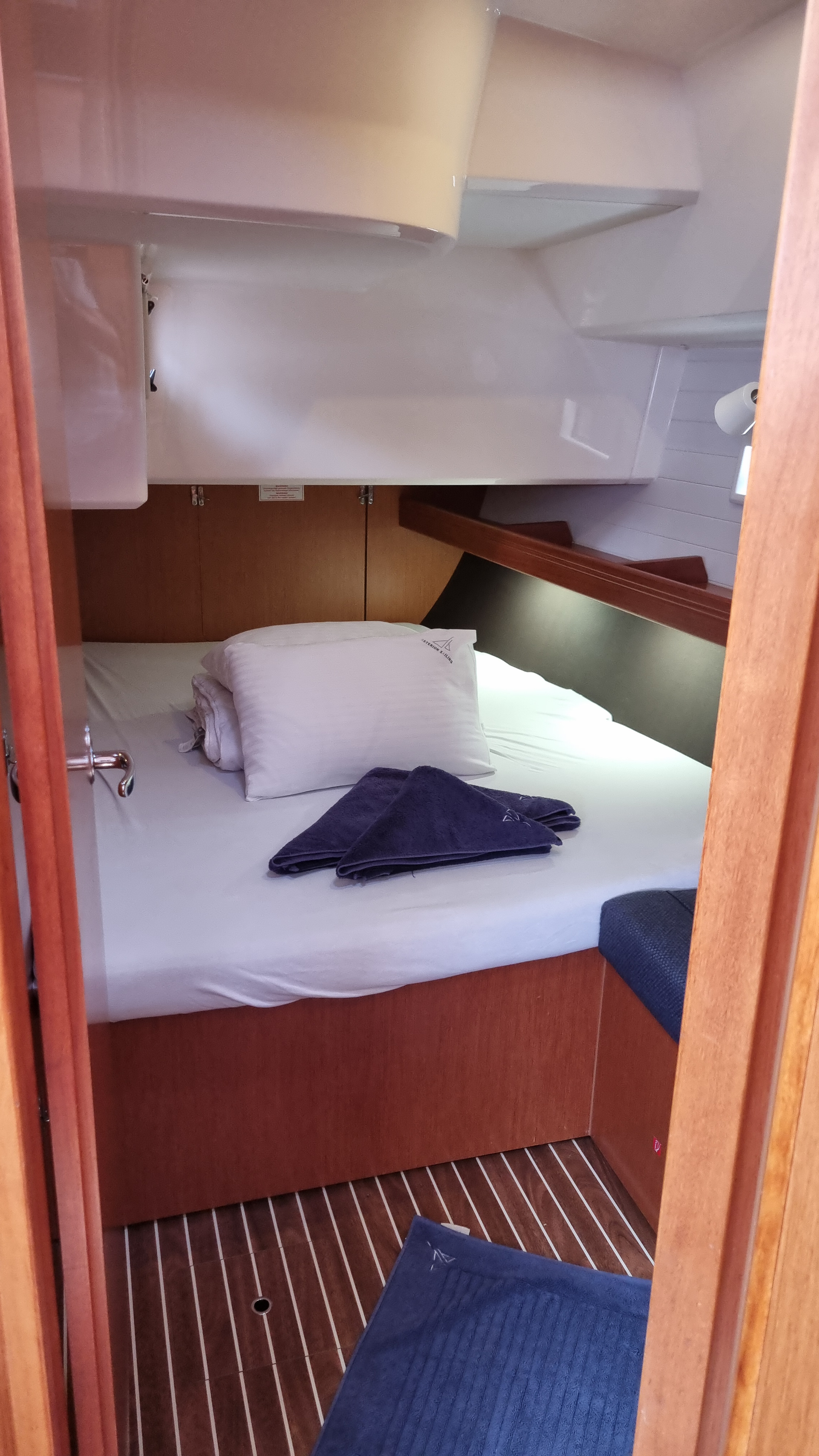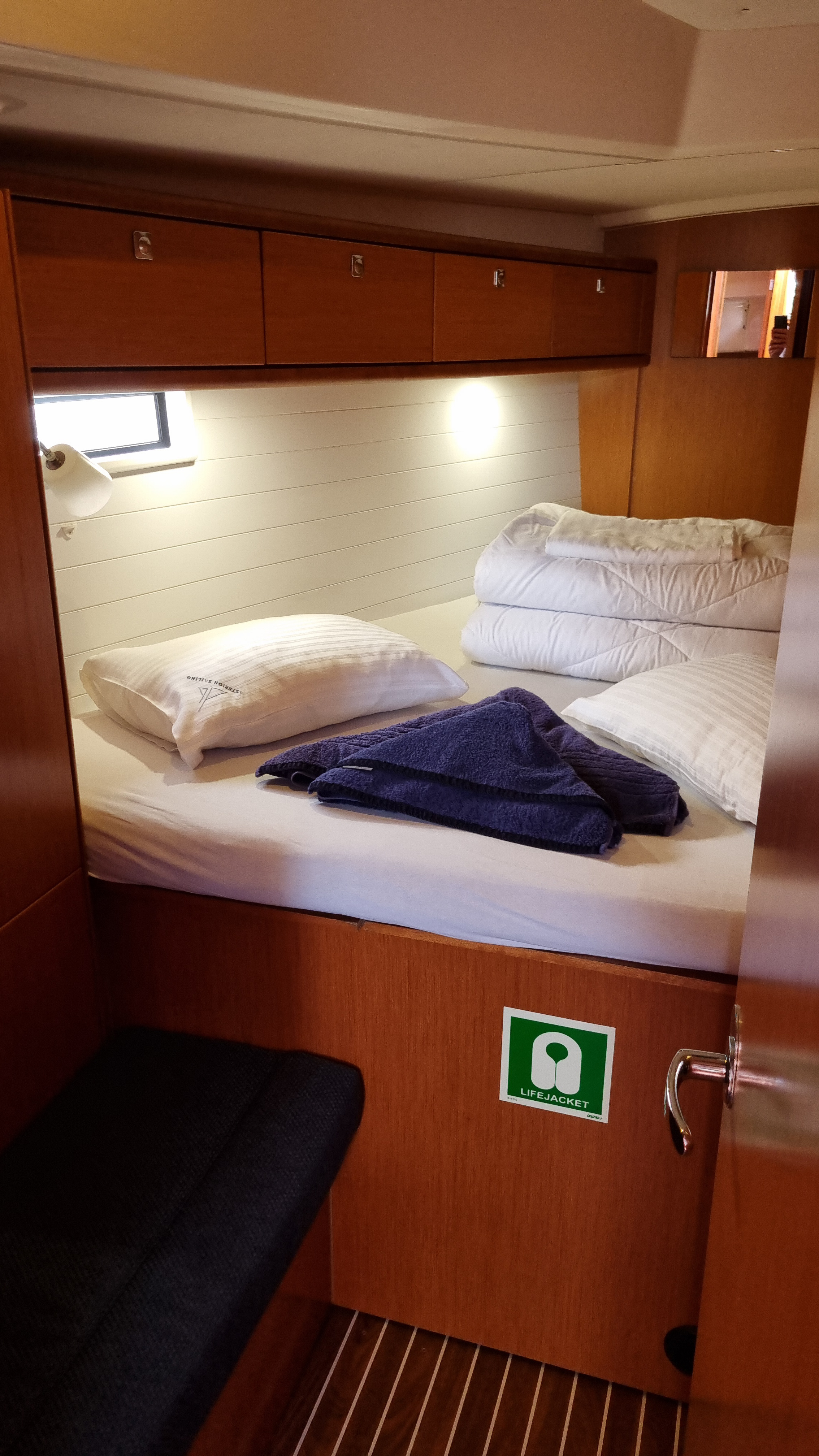 Eher kosmetische Mängel am Schiff, keine ersnsthaften sicherheitsrelevanten Themen. Einzig fragwürdig (auch bei Rückgabe angemerkt): Die Sicherung für die Ankerwinsch sollte man sie brauchen ist nicht wie oft gesehen in der Vorschiffskabine auf der Vorderseite vom Bett, sondern am Schott zum Vorschiff unter der Matratze/Bodenbrett -> im Zweifelsfall schlecht zu erreichen und der Crew auch schlecht zu zeigen bei der Einweisung.