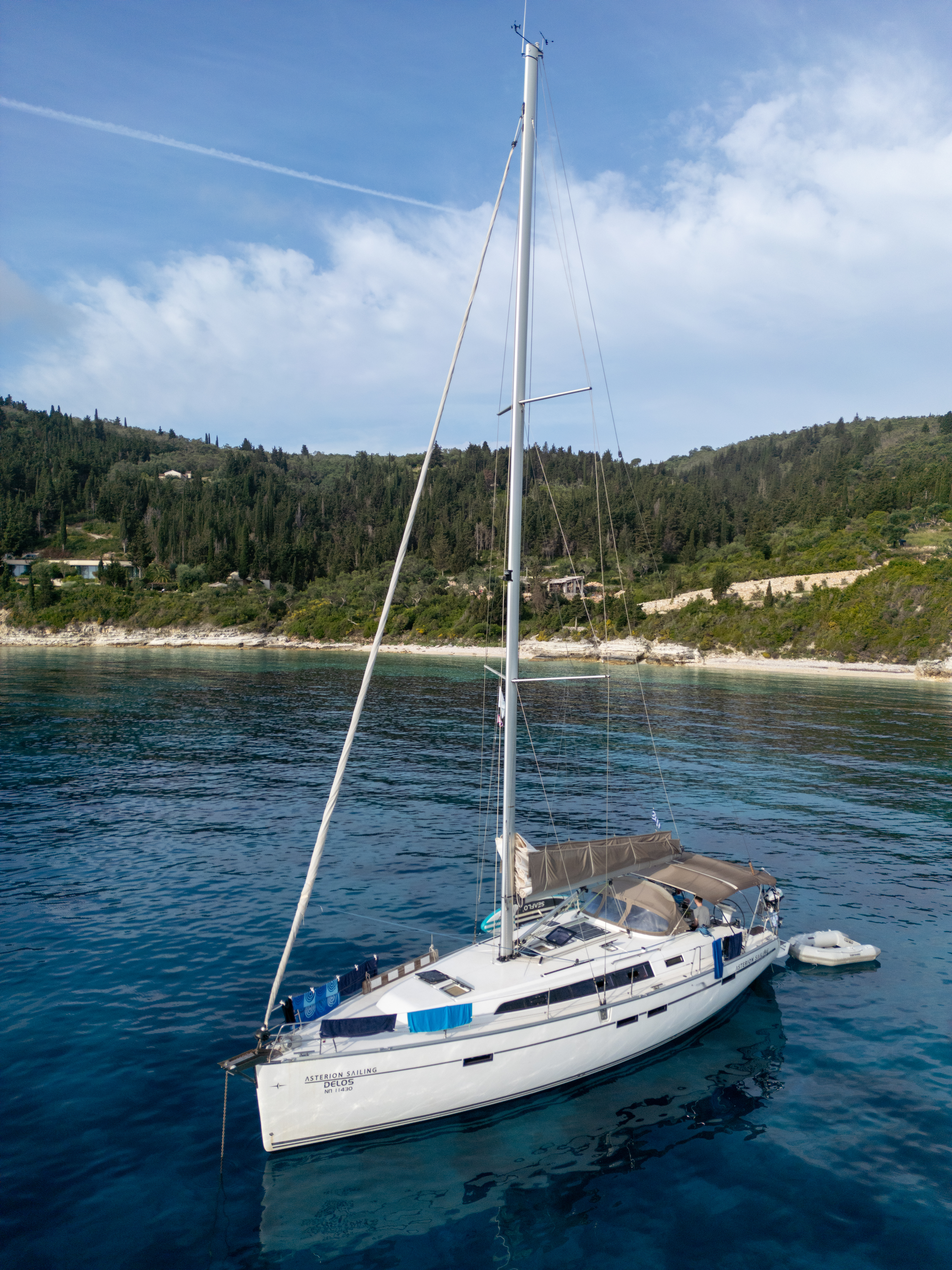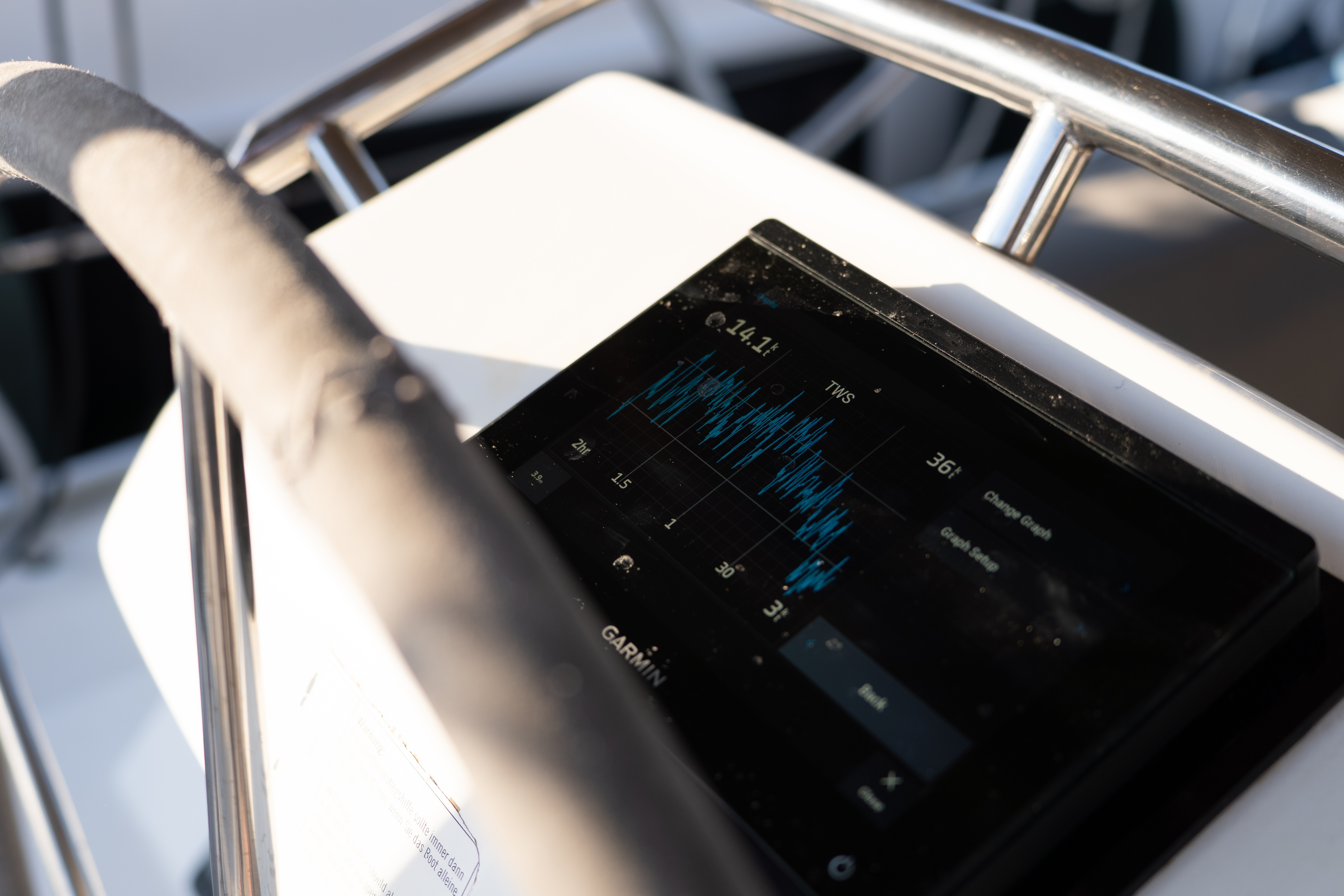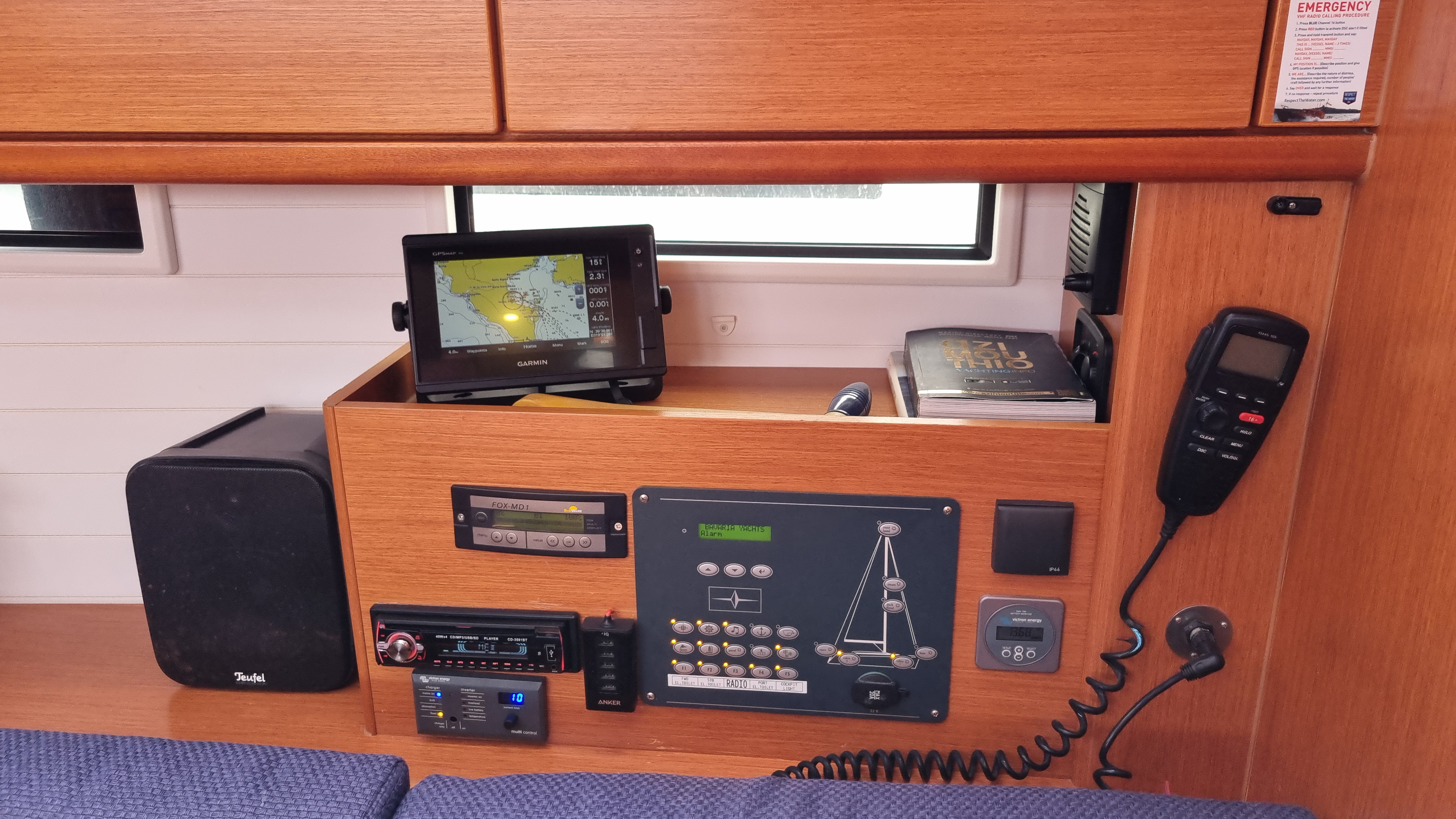 | Navigation | Barometer, Fernglas, GPS mit Kartenplotter im Cockpit, GPS mit Kartenplotter im Salon, Hafenhandbücher, Handpeilkompass, Kartenplotter im Salon, Kompass, Seekarten, Tridata (Log, Echolot, Windm.) |