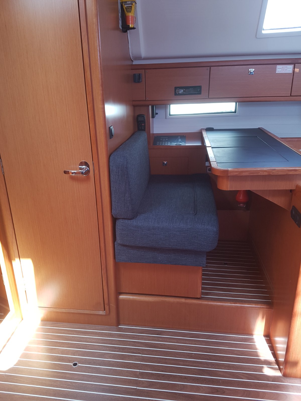 | Safety | Autopilot, Bordapotheke, Bordwerkzeug, Bugstrahlruder, Feststoffschwimmwesten, Feuerlöscher, Flaggen, Navigationslichter, Nebelhorn, Notpinne, Notsignale, Radarreflektor, Reserve-Motoröl, Rettungsinsel, Rettungskragen, Sicherheitsgurt, Signalspiegel, Taschenlampe, UKW-Funk |