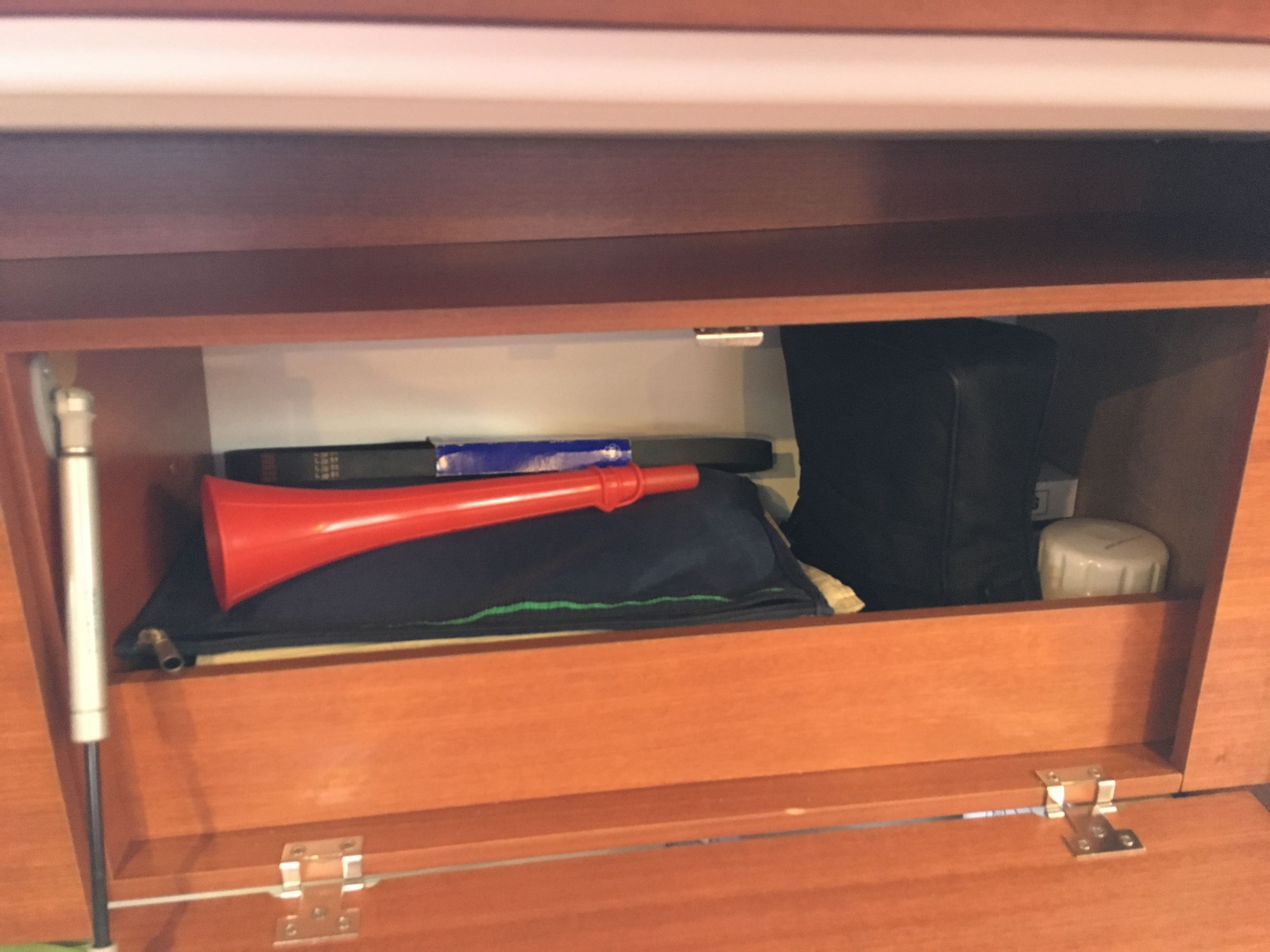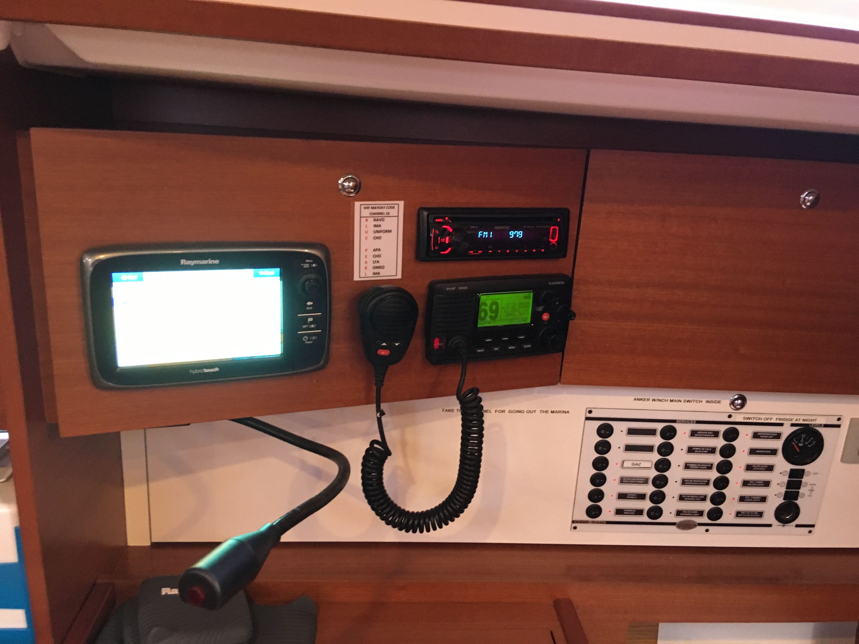 Autopilot, Blitzboje, Bootsmannstuhl, Bordapotheke, Bordwerkzeug, Feststoffschwimmwesten, Feuerlöscher, Lifebelts, Motor-Ersatzteile, Nebelhorn, Notsignale, Radarreflektor, Reparaturset für Beiboot, Rettungsinsel, Rettungswesten, Suchscheinwerfer, Taschenlampe, UKW-Funk, Zweitanker |