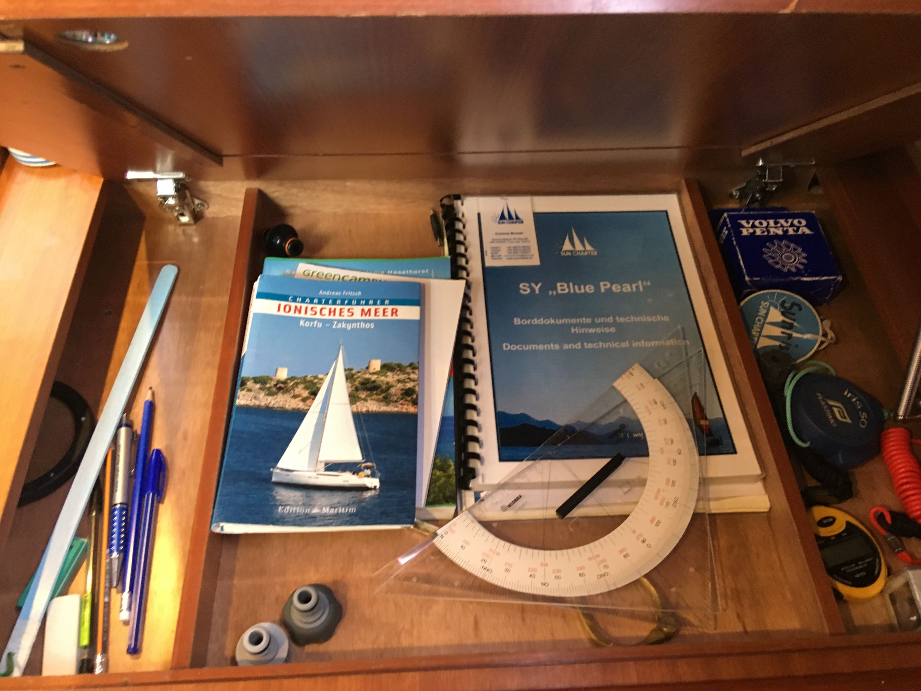 Barometer, Echolot, Fernglas, GPS, Hafenhandbücher, Handpeilkompass, Kartenplotter im Cockpit, Navigationsbesteck, Seekarten, Sumlog, Tridata (Log, Echolot, Windm.), Windmesser |