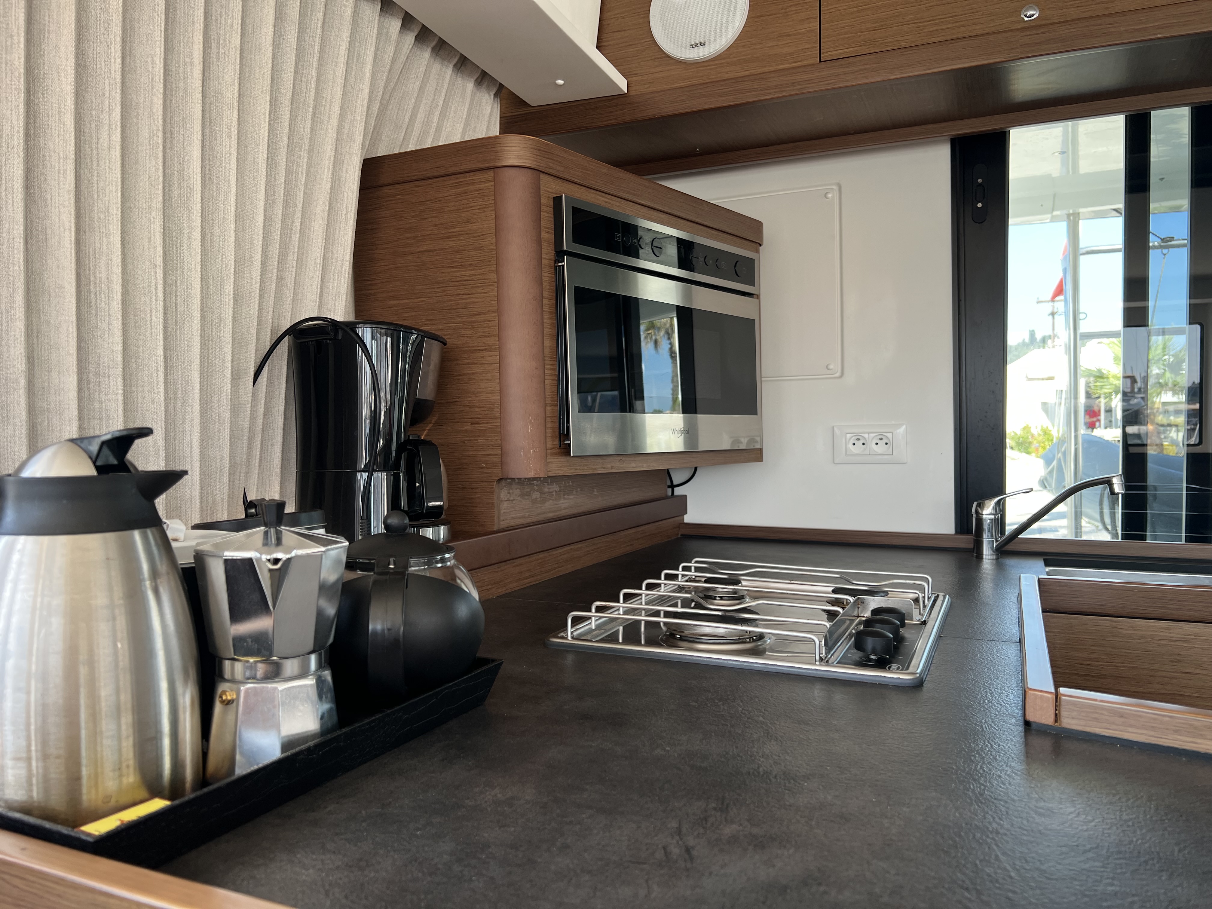 | Inside | Backofen, Dusche, Fäkalientank, Gasherd, Generator, Klimaanlage (ohne Landstrombedarf), Kühlschrank, Pantryausstattung, Radio, Warmwasser, Watermaker, WC (elektr.) |