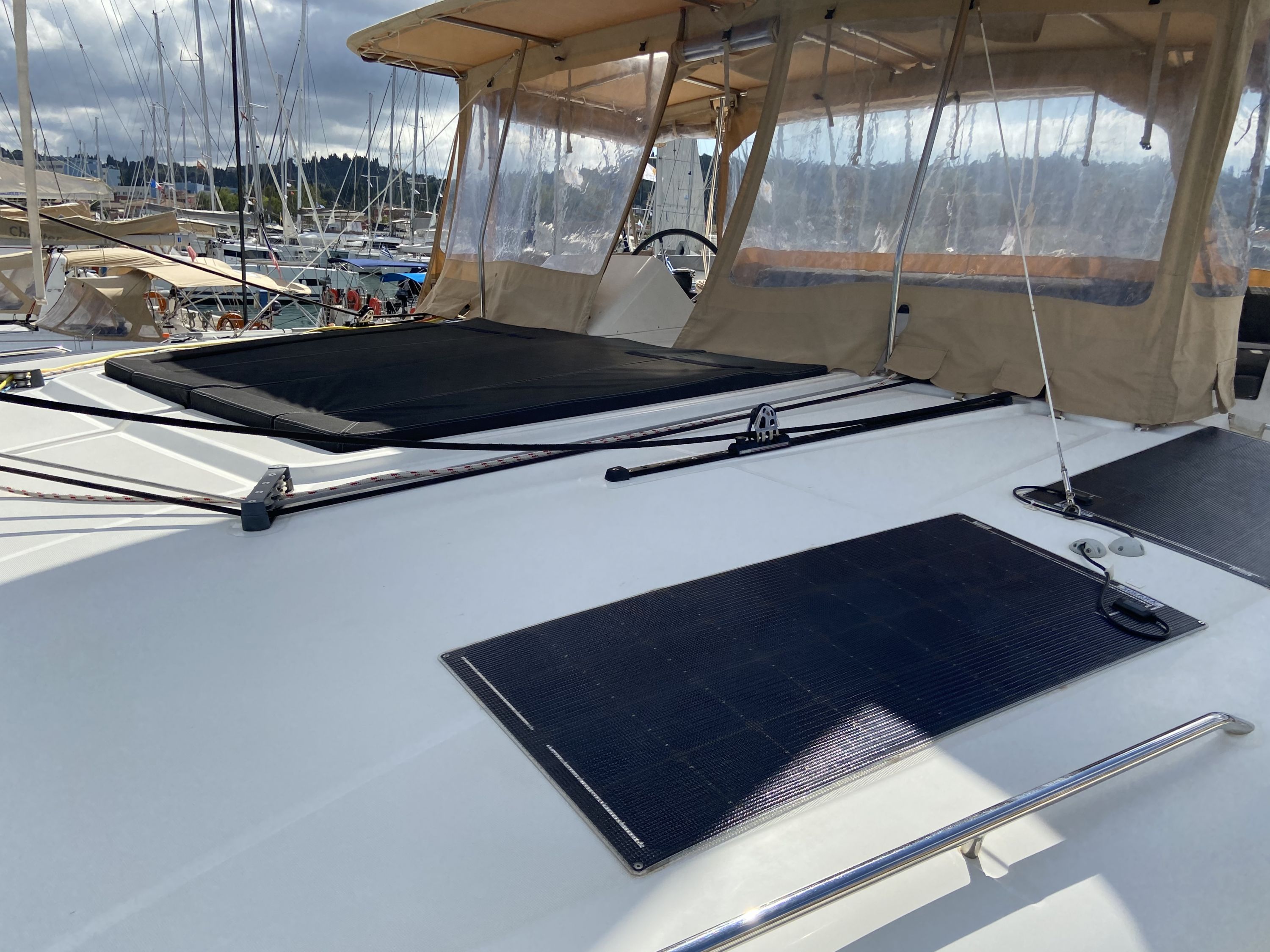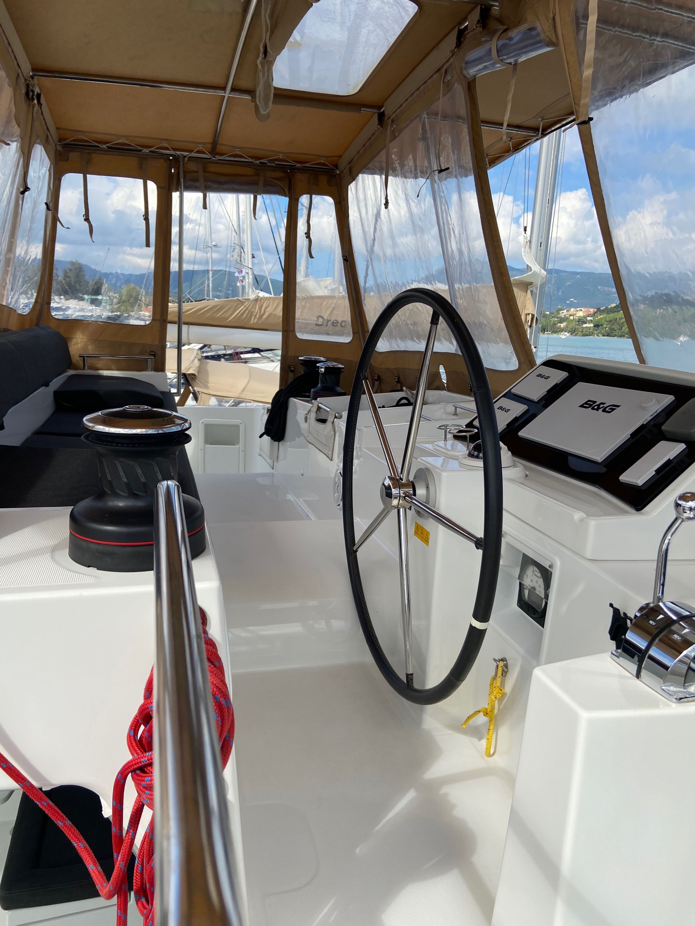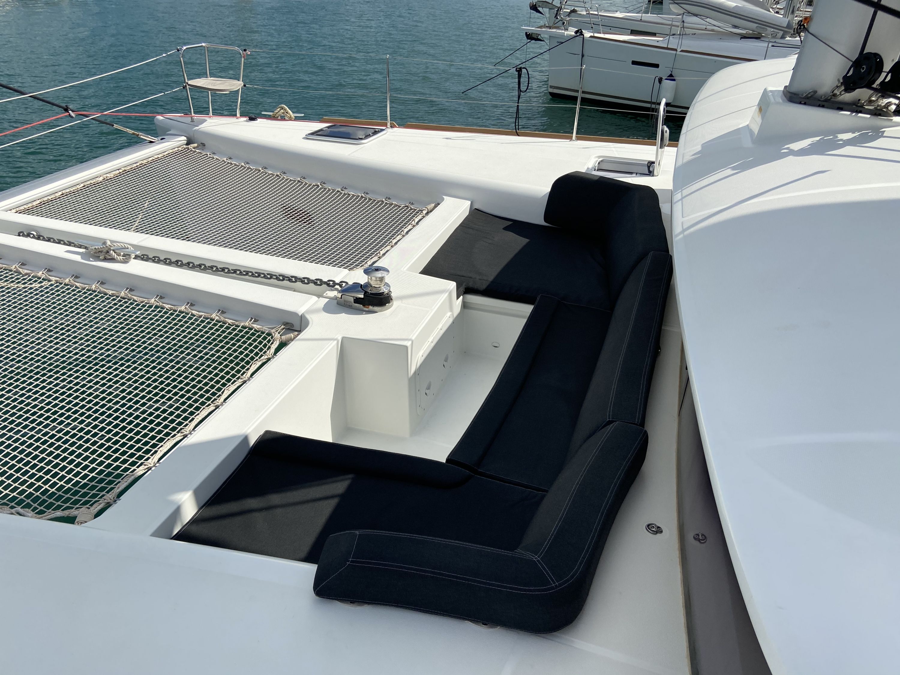 | Outside | Badeleiter, Biminitop, Cockpitdusche warm/kalt, Cockpitkühlschrank, Cockpitpolster, Cockpittisch, Davits, Deckpolster, elektr. Ankerwinsch, elektr. Winsch, Fernsteuerung für elektr. Ankerwinsch, Polster auf Flybridge, Selbstholende Winschen, Solaranlage |