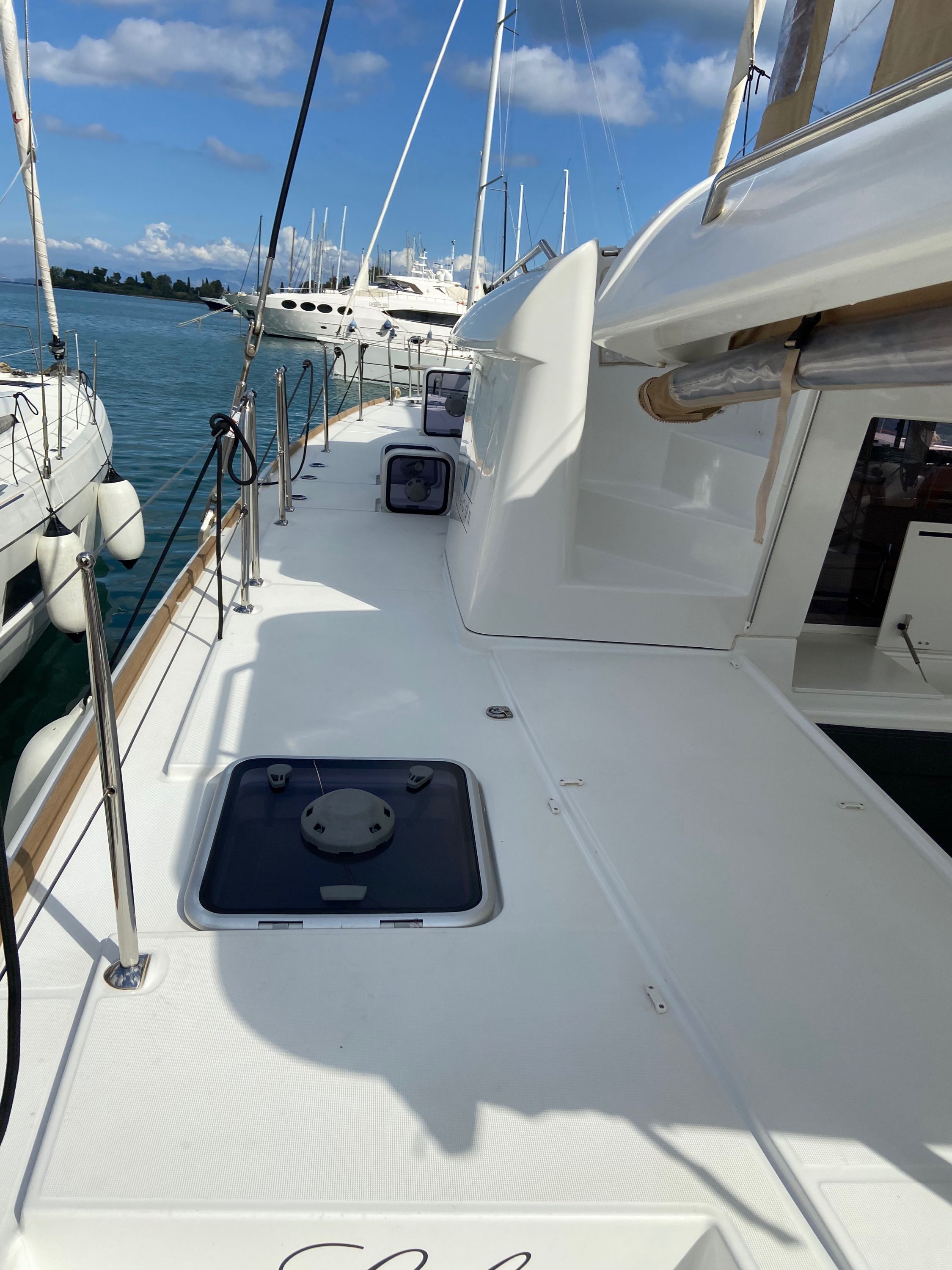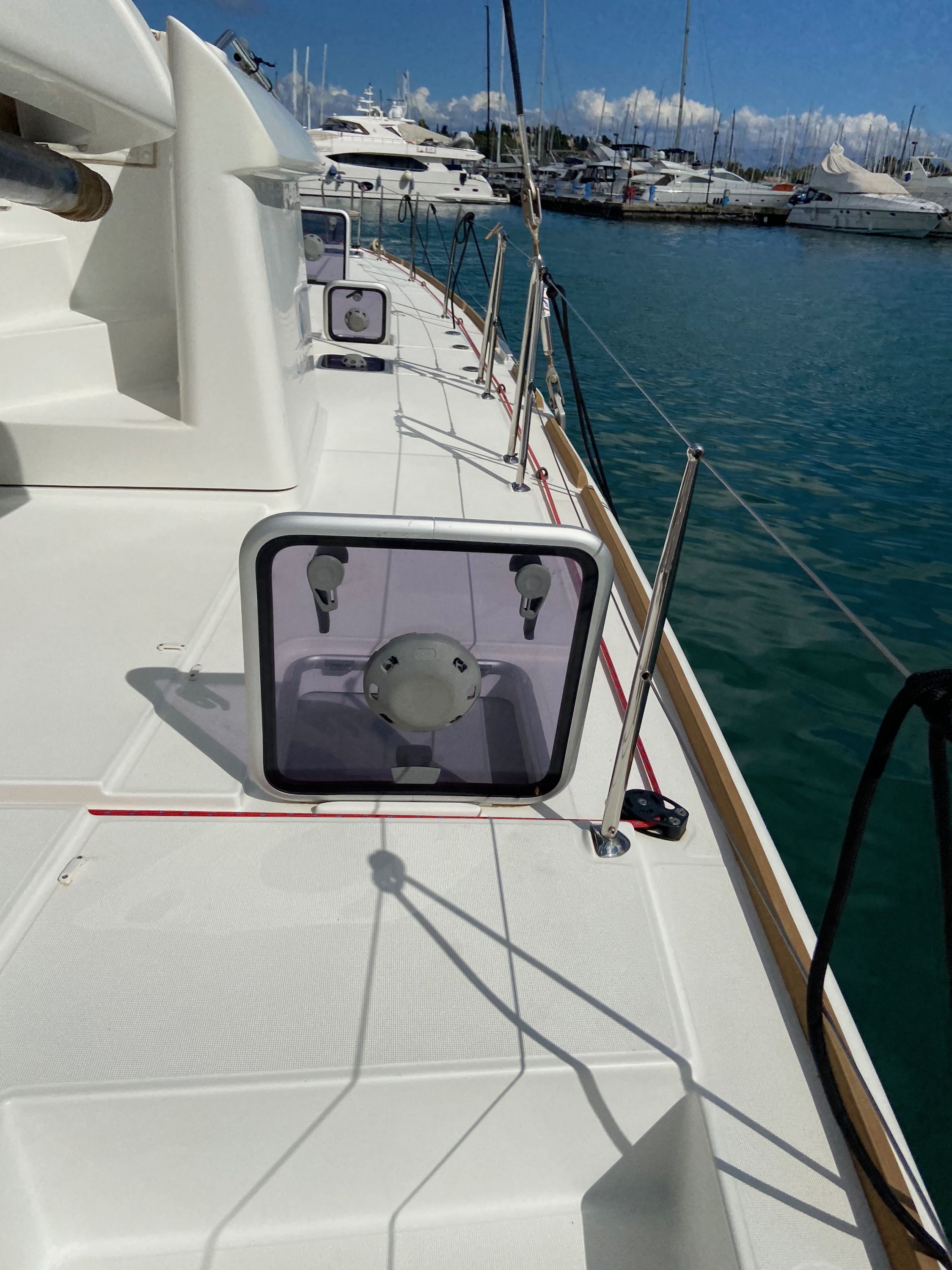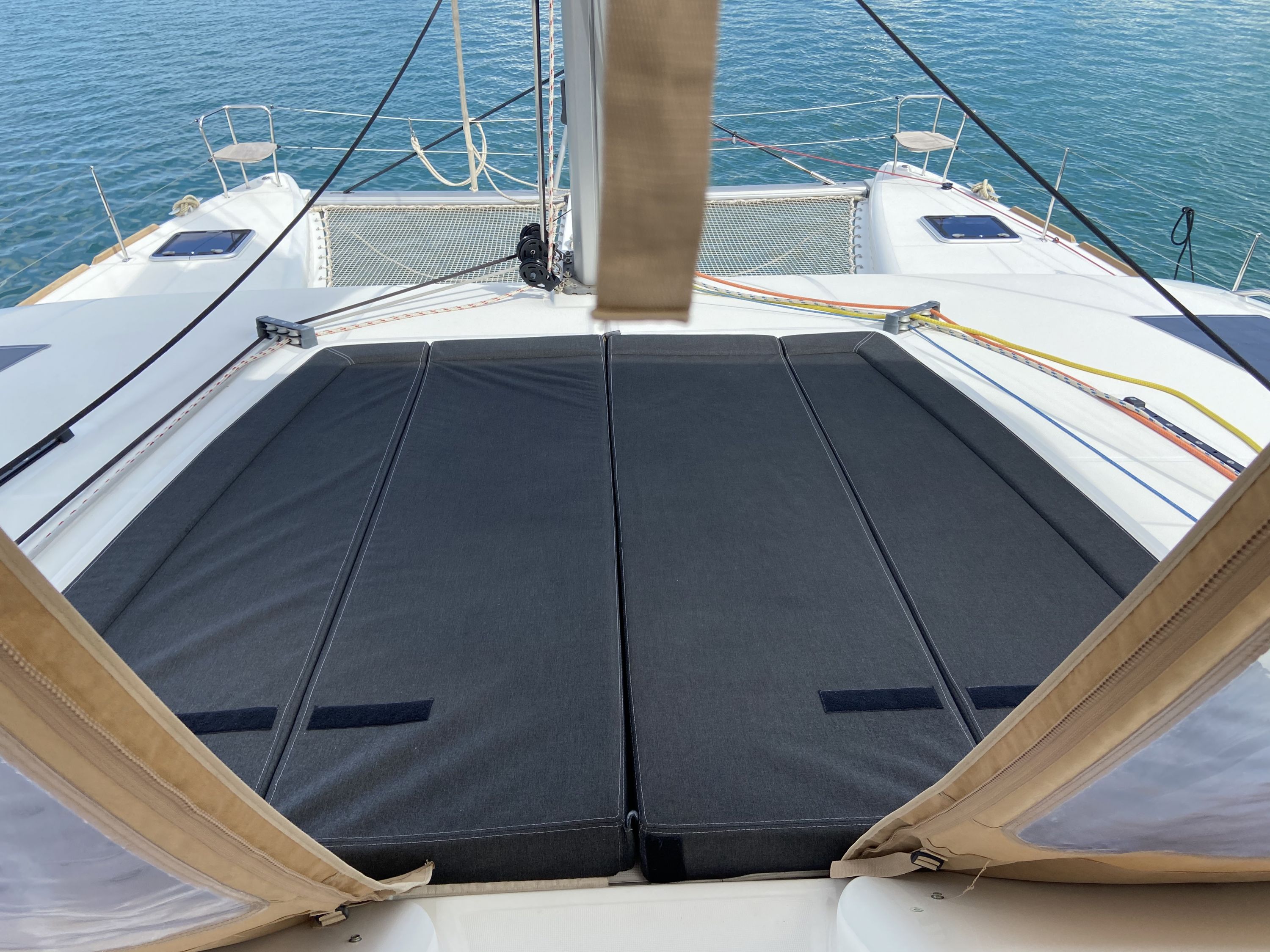 | Outside | Badeleiter, Biminitop, Cockpitdusche warm/kalt, Cockpitkühlschrank, Cockpitpolster, Cockpittisch, Davits, Deckpolster, elektr. Ankerwinsch, elektr. Winsch, Fernsteuerung für elektr. Ankerwinsch, Polster auf Flybridge, Selbstholende Winschen, Solaranlage |