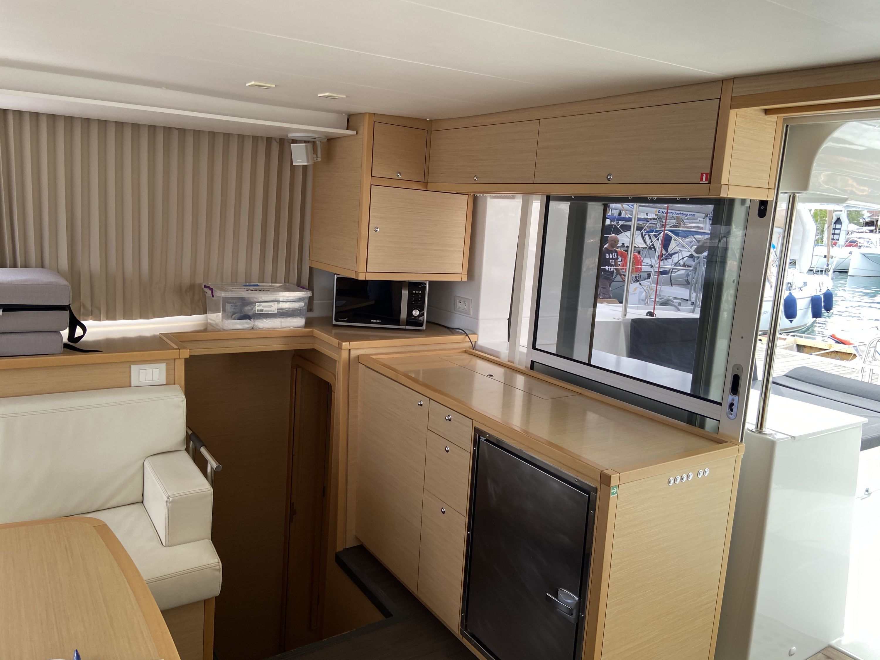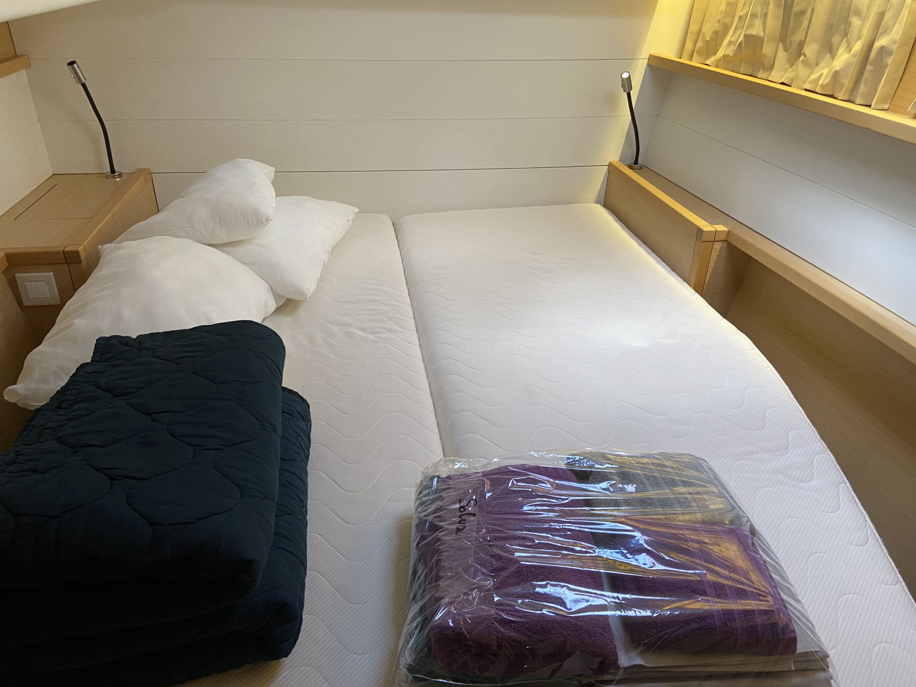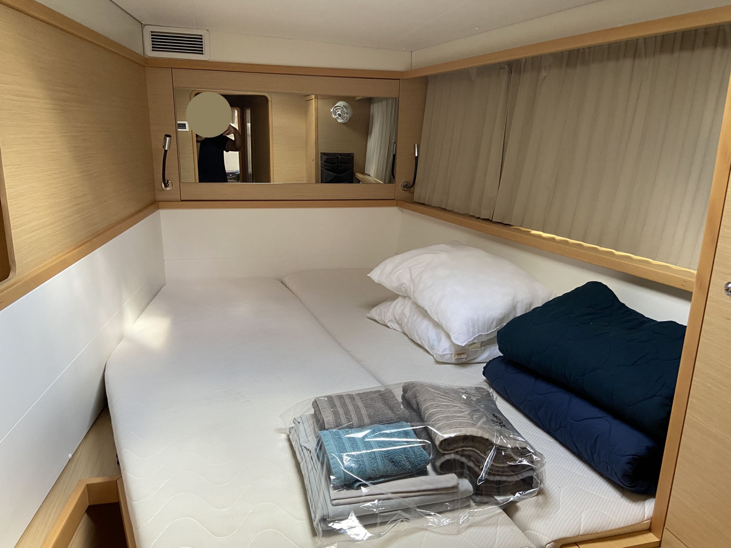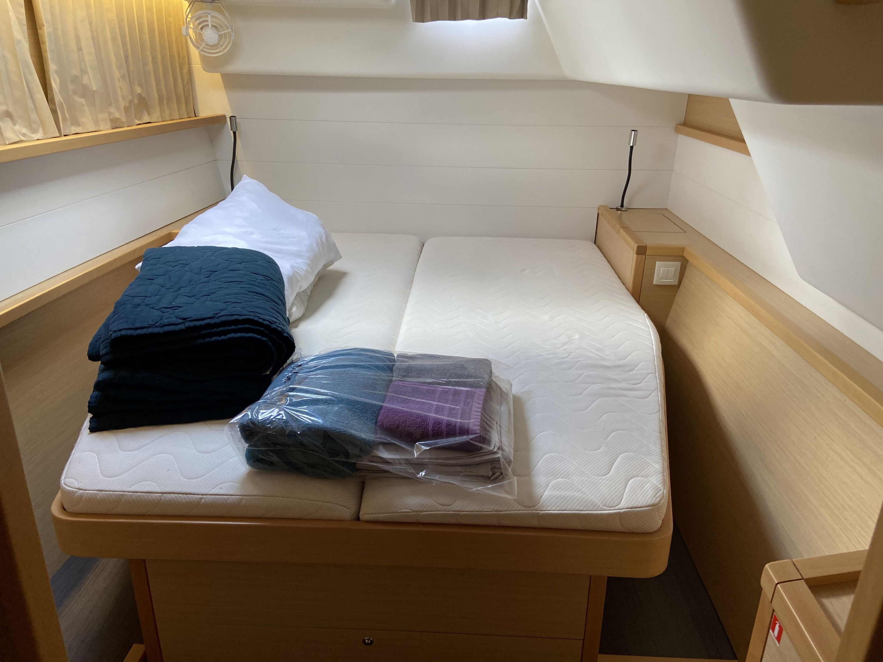 | Inside | 2. Kühlschrank, Backofen, Gasherd, Generator, Inverter 12V/220V, Klimaanlage (Landstrom), Kühlschrank, Ladegerät, Salontisch absenkbar, USB Steckdosen in den Kabinen, Ventilatoren in Kabinen, Watermaker, WC (elektr.) |