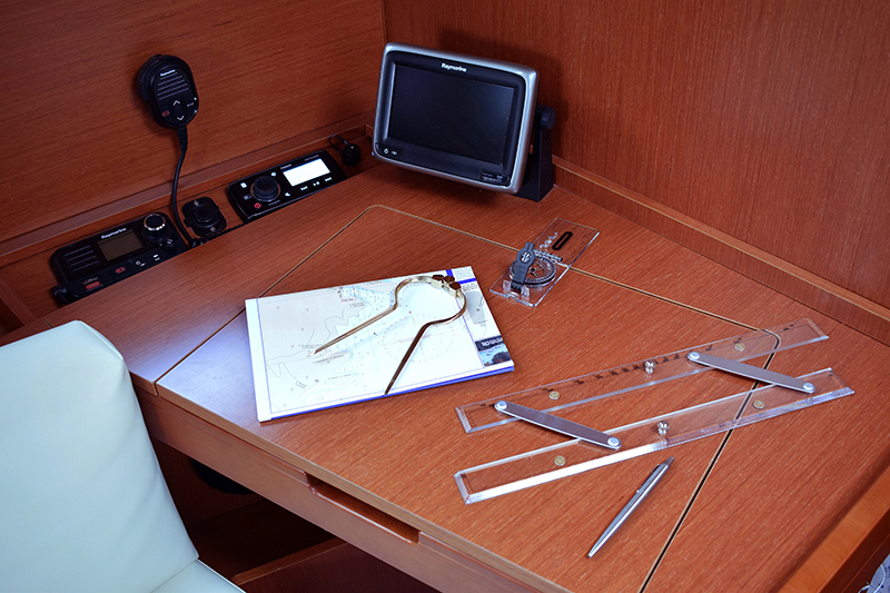 | Navigation | Echolot, GPS mit Kartenplotter im Cockpit, GPS mit Kartenplotter im Salon, Navigationsbesteck, Seekarten, Sumlog, Windmesser |