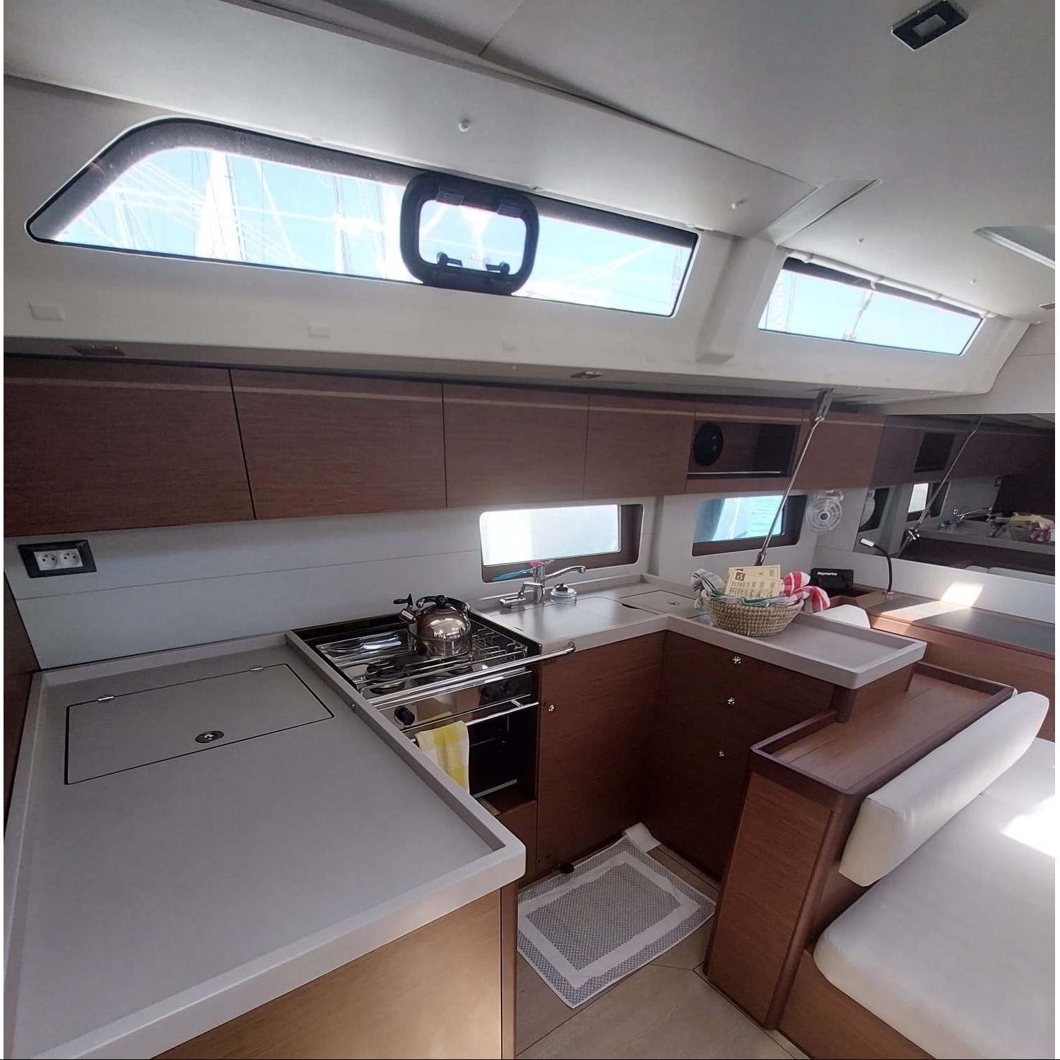 | Outside | 220 V-Landanschluss, Anker mit Kette, Badeleiter, Badeplattform, Biminitop, Bootshaken, Cockpitlautsprecher, Cockpitleuchte, Cockpitpolster, Deckbürste, elektr. Ankerwinsch, Fender, Festmacherleinen, Gangway, Kunststoff-Eimer (Pütz), Segel-Flickwerkzeug, Solaranlage, Sprayhood, Treibanker, Wantenschneider, Wasserschlauch, Winschen |