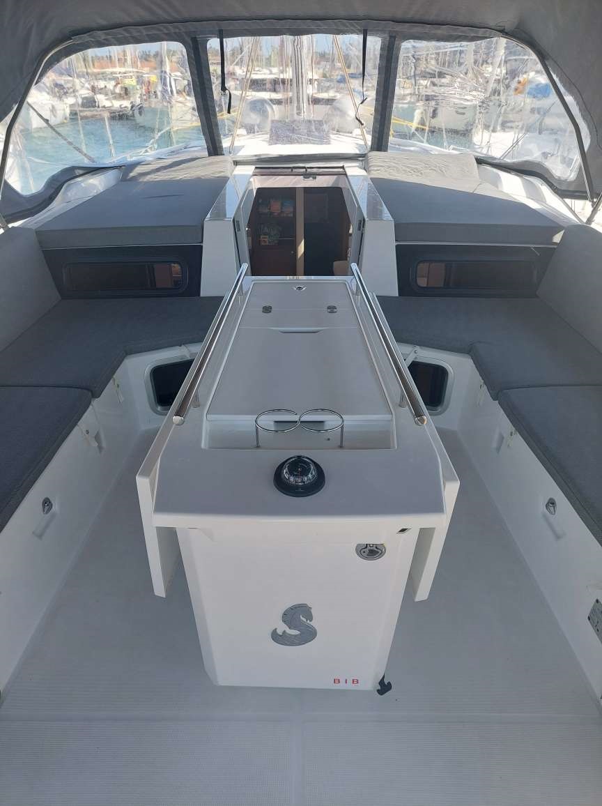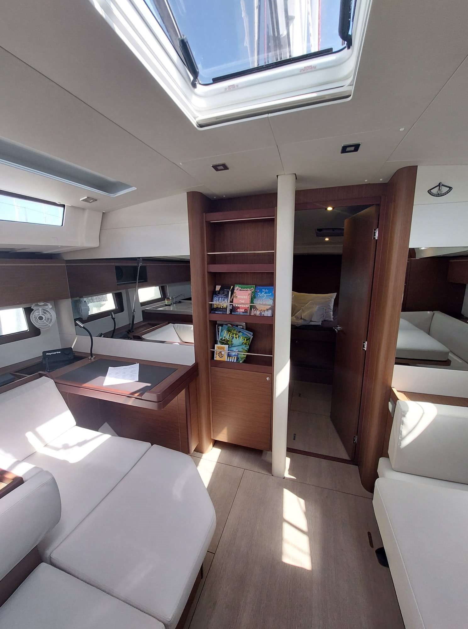 | Outside | 220 V-Landanschluss, Anker mit Kette, Badeleiter, Badeplattform, Biminitop, Bootshaken, Cockpitlautsprecher, Cockpitleuchte, Cockpitpolster, Deckbürste, elektr. Ankerwinsch, Fender, Festmacherleinen, Gangway, Kunststoff-Eimer (Pütz), Segel-Flickwerkzeug, Solaranlage, Sprayhood, Treibanker, Wantenschneider, Wasserschlauch, Winschen |