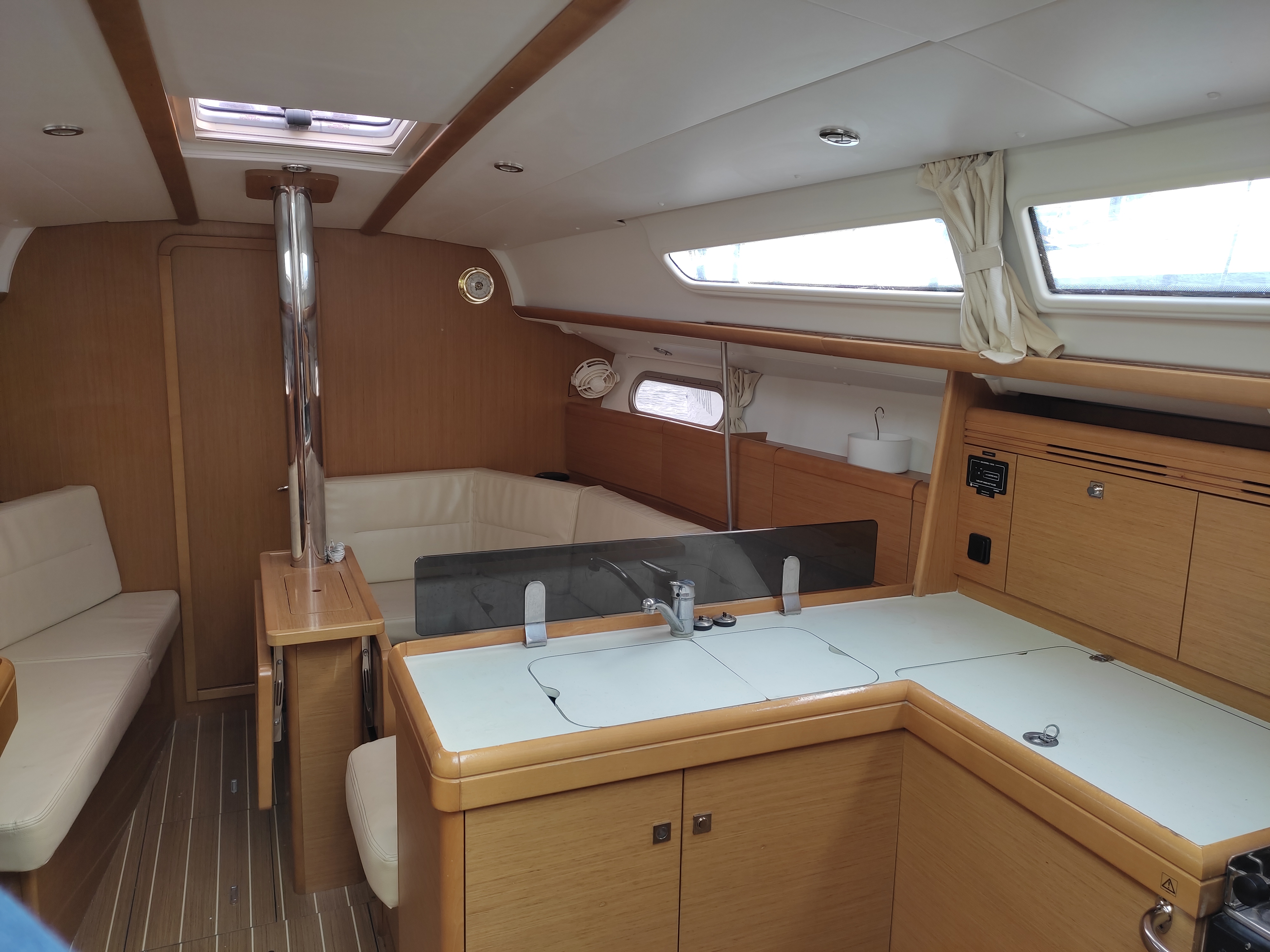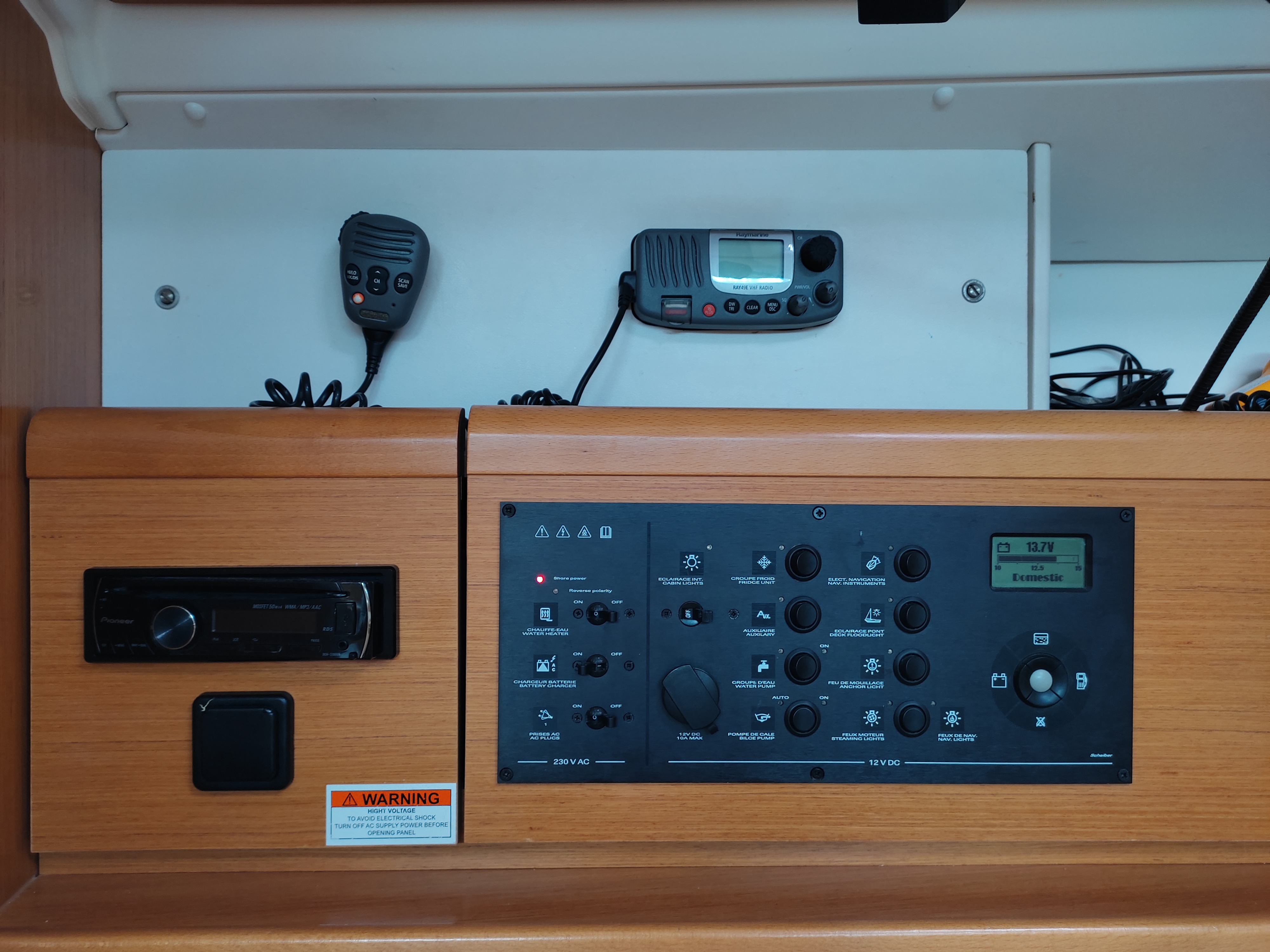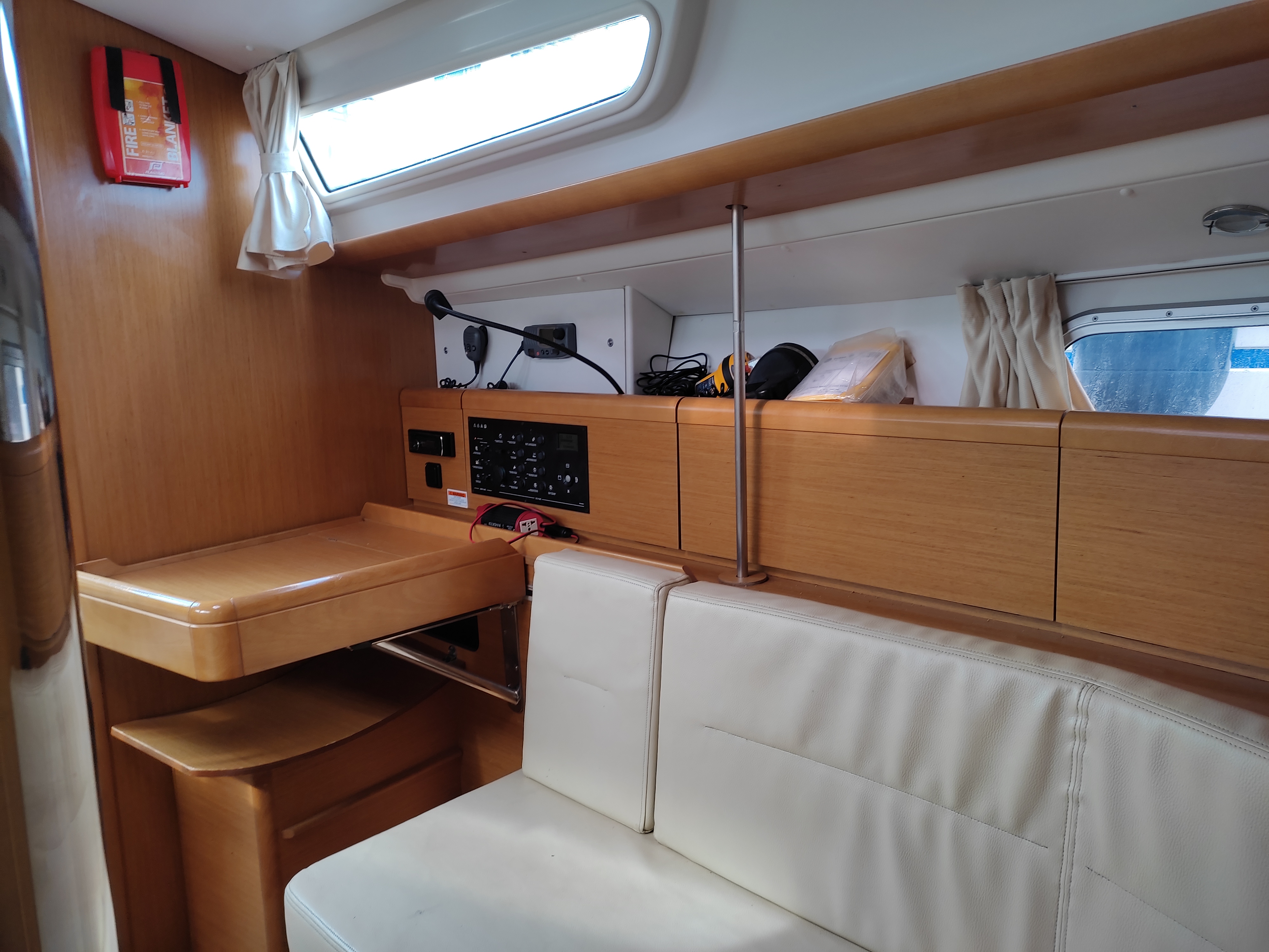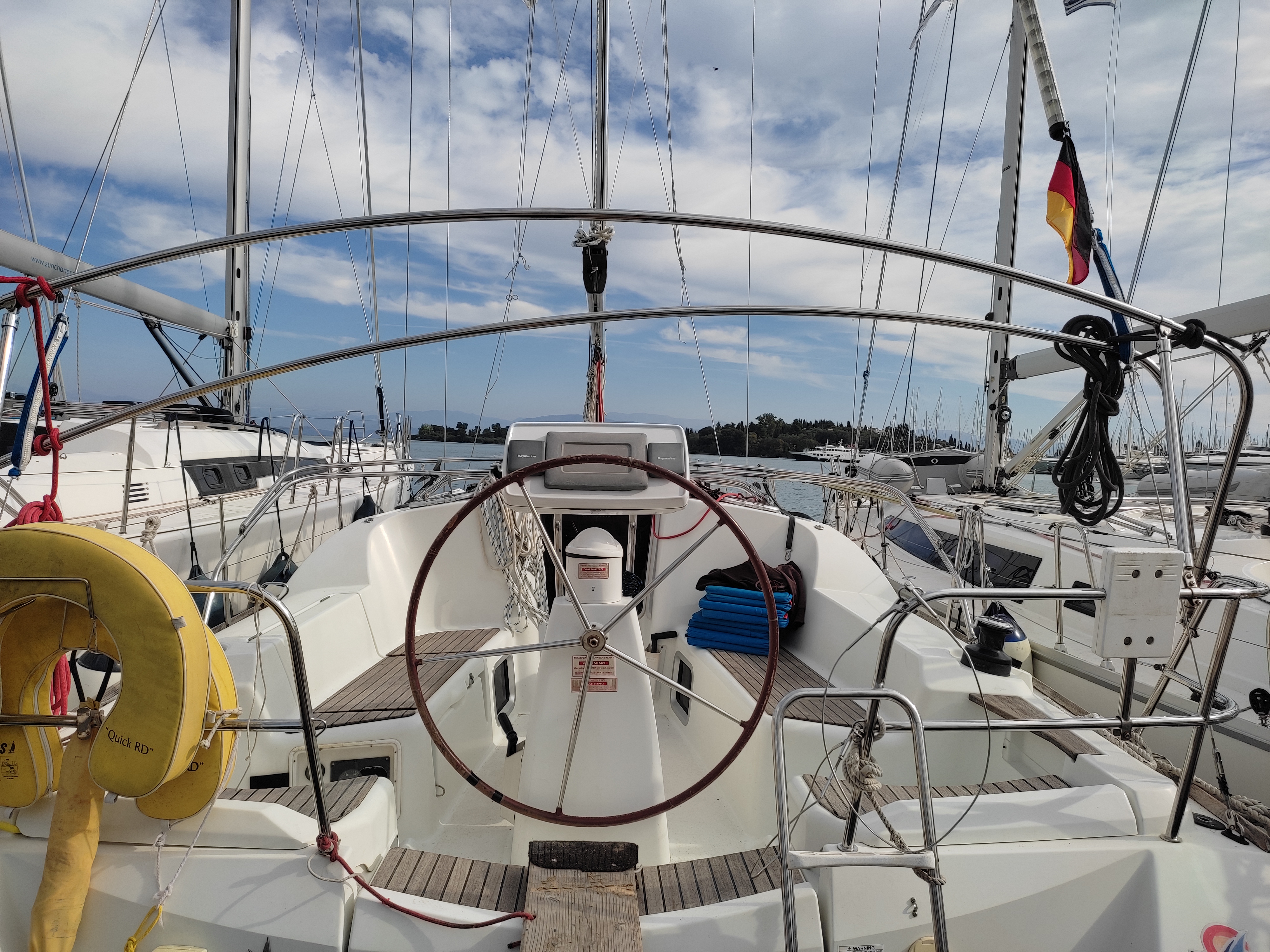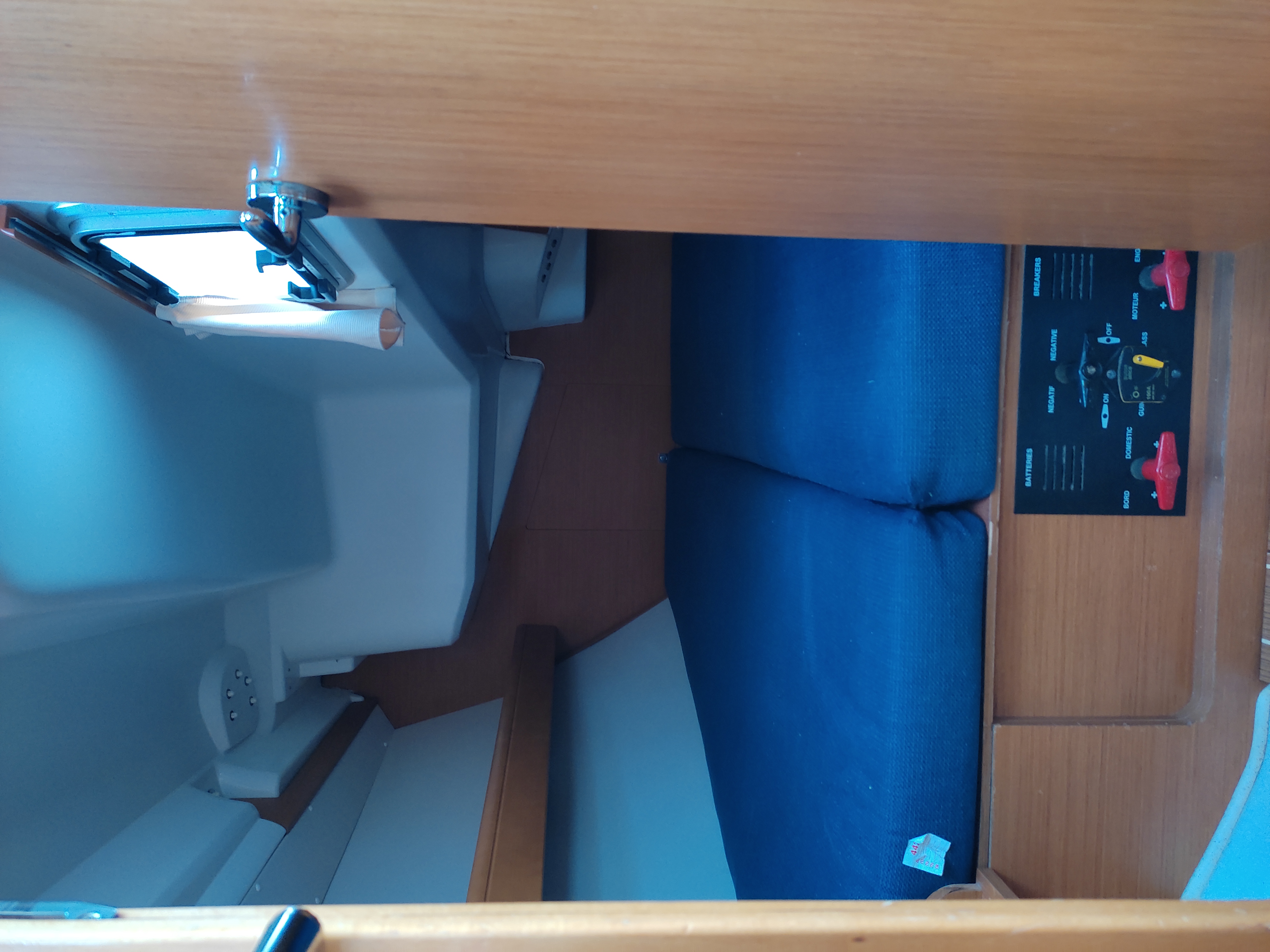 | Outside | 12 V-Anschluss, Anker mit Kette, Badeleiter, Badeplattform, Biminitop, Cockpitdusche, Cockpitlautsprecher, Cockpittisch, elektr. Ankerwinsch, Fender, Festmacherleinen, Gangway, Sprayhood, Teak im Cockpit, Wasserschlauch, Windex |