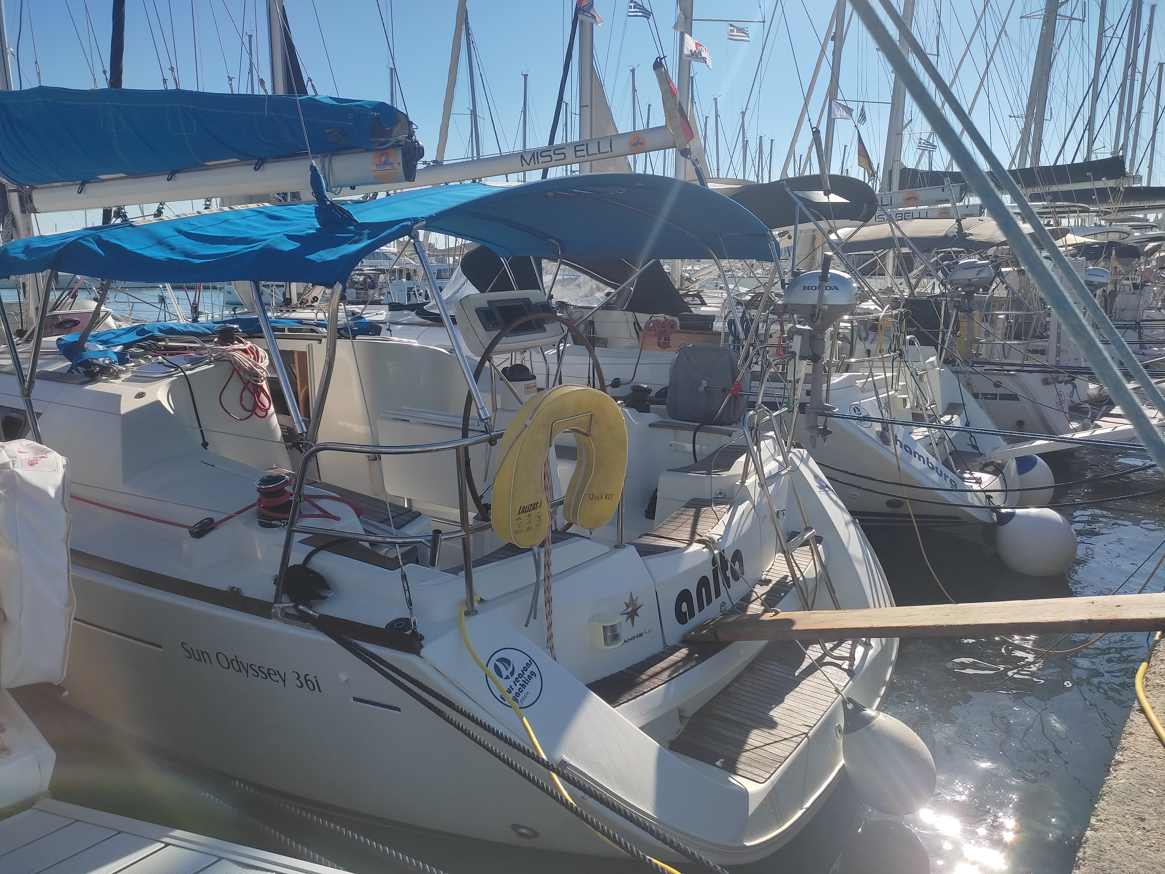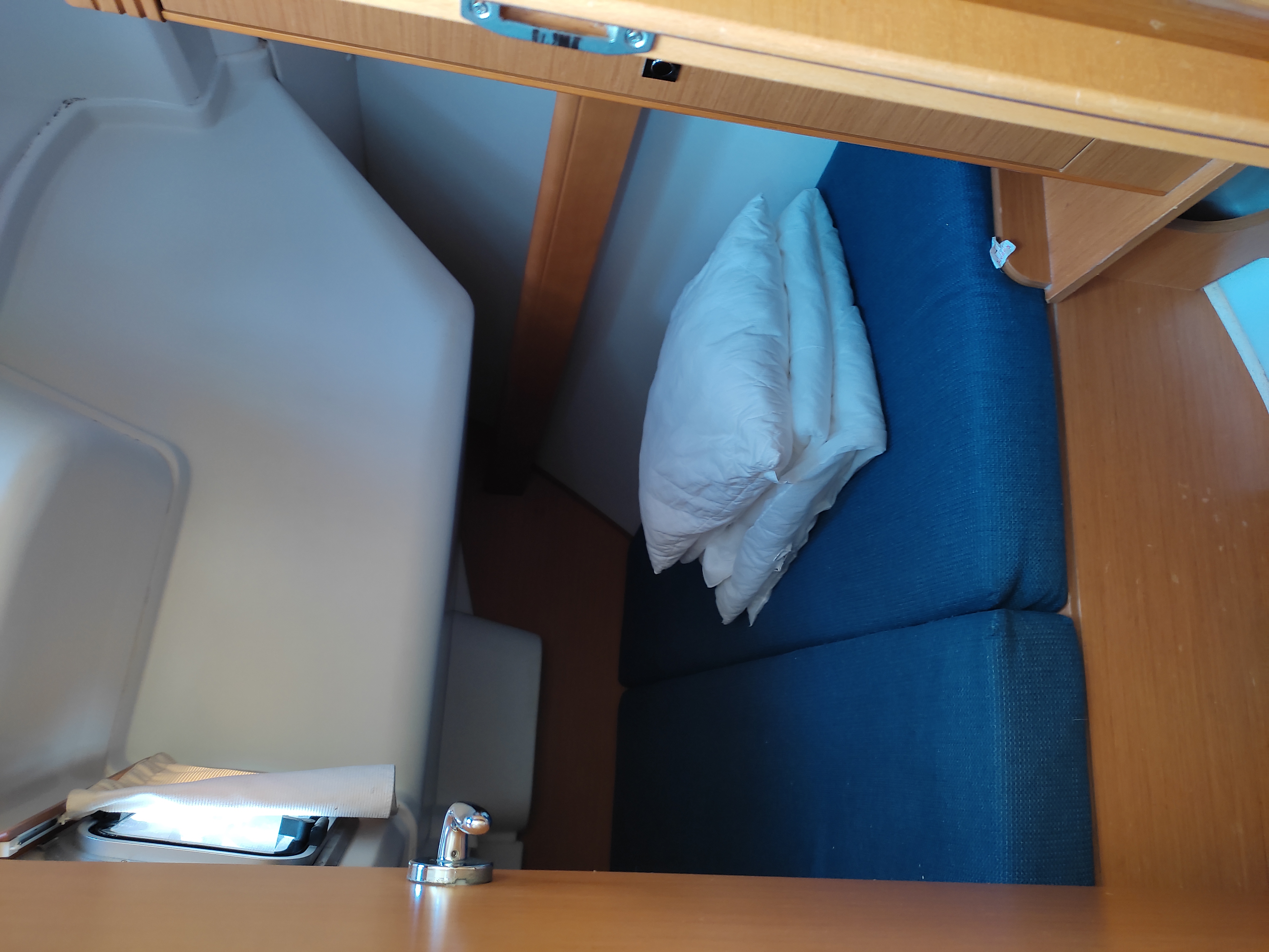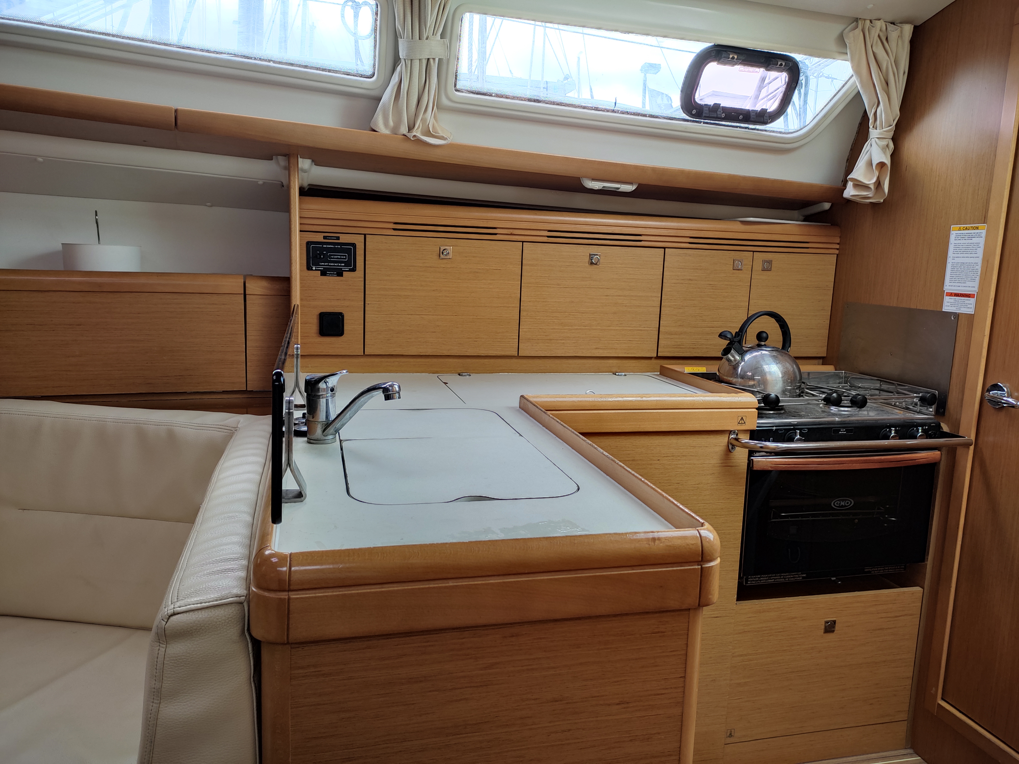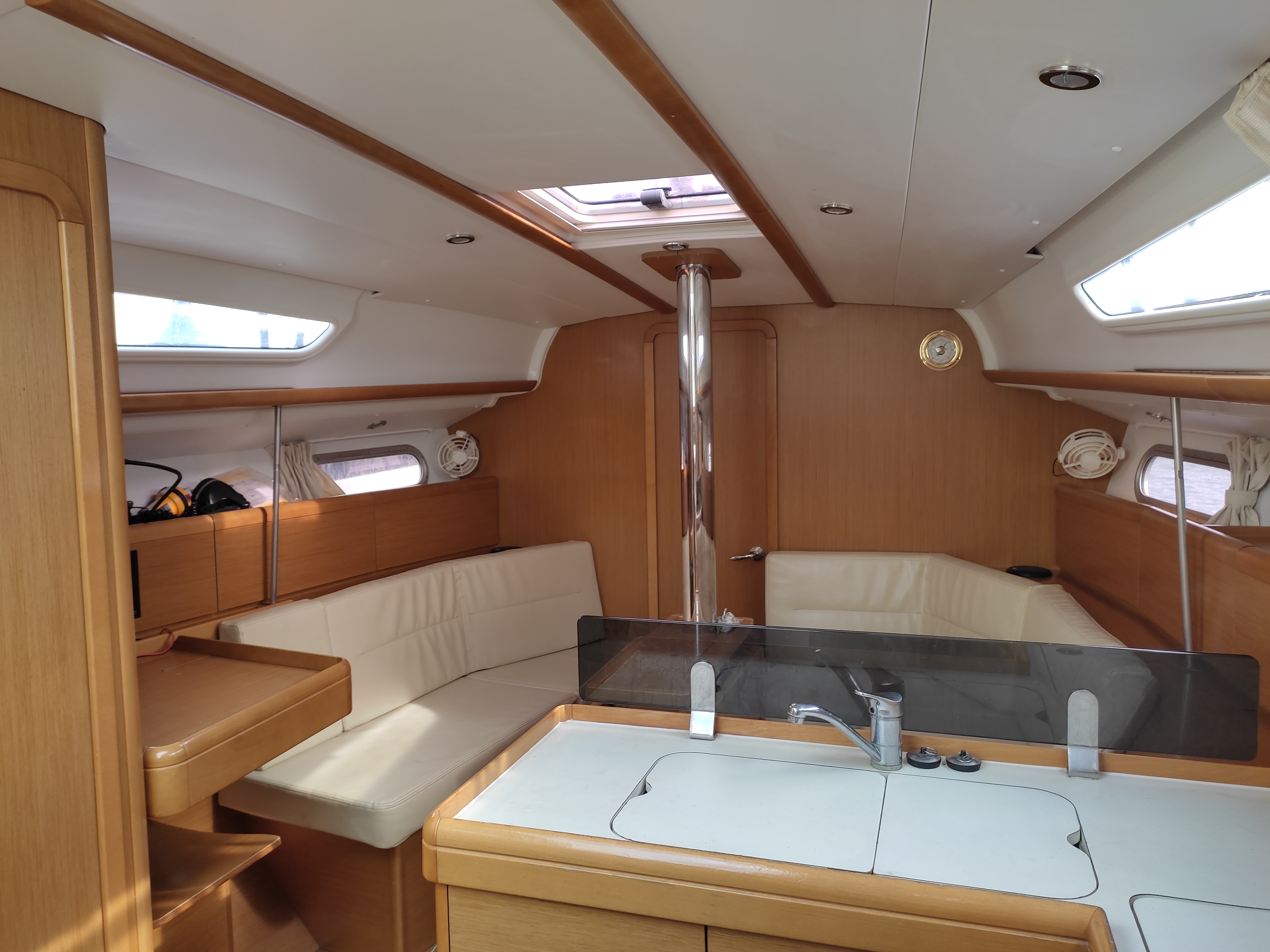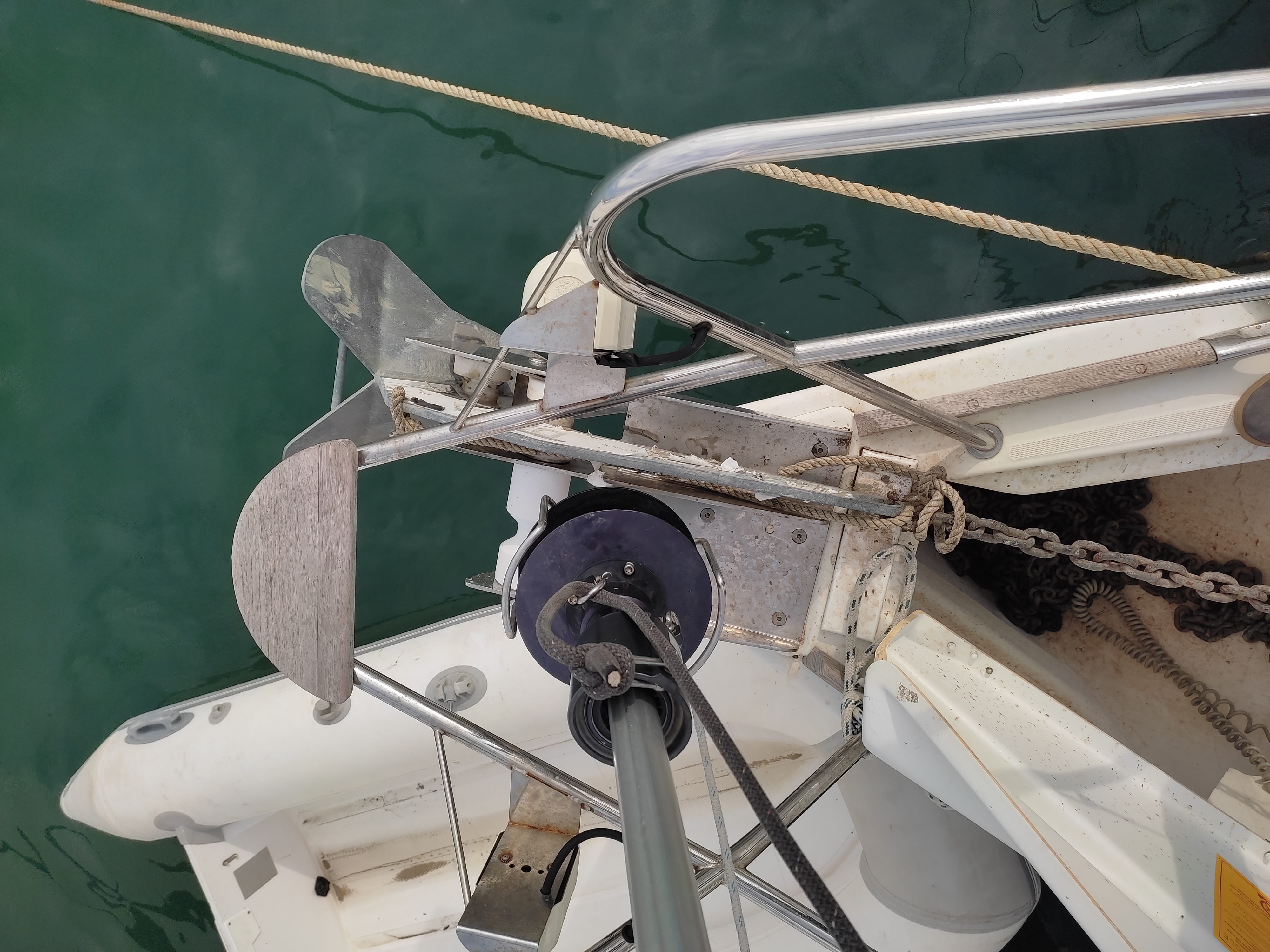 | Outside | 12 V-Anschluss, Anker mit Kette, Badeleiter, Badeplattform, Biminitop, Cockpitdusche, Cockpitlautsprecher, Cockpittisch, elektr. Ankerwinsch, Fender, Festmacherleinen, Gangway, Sprayhood, Teak im Cockpit, Wasserschlauch, Windex |