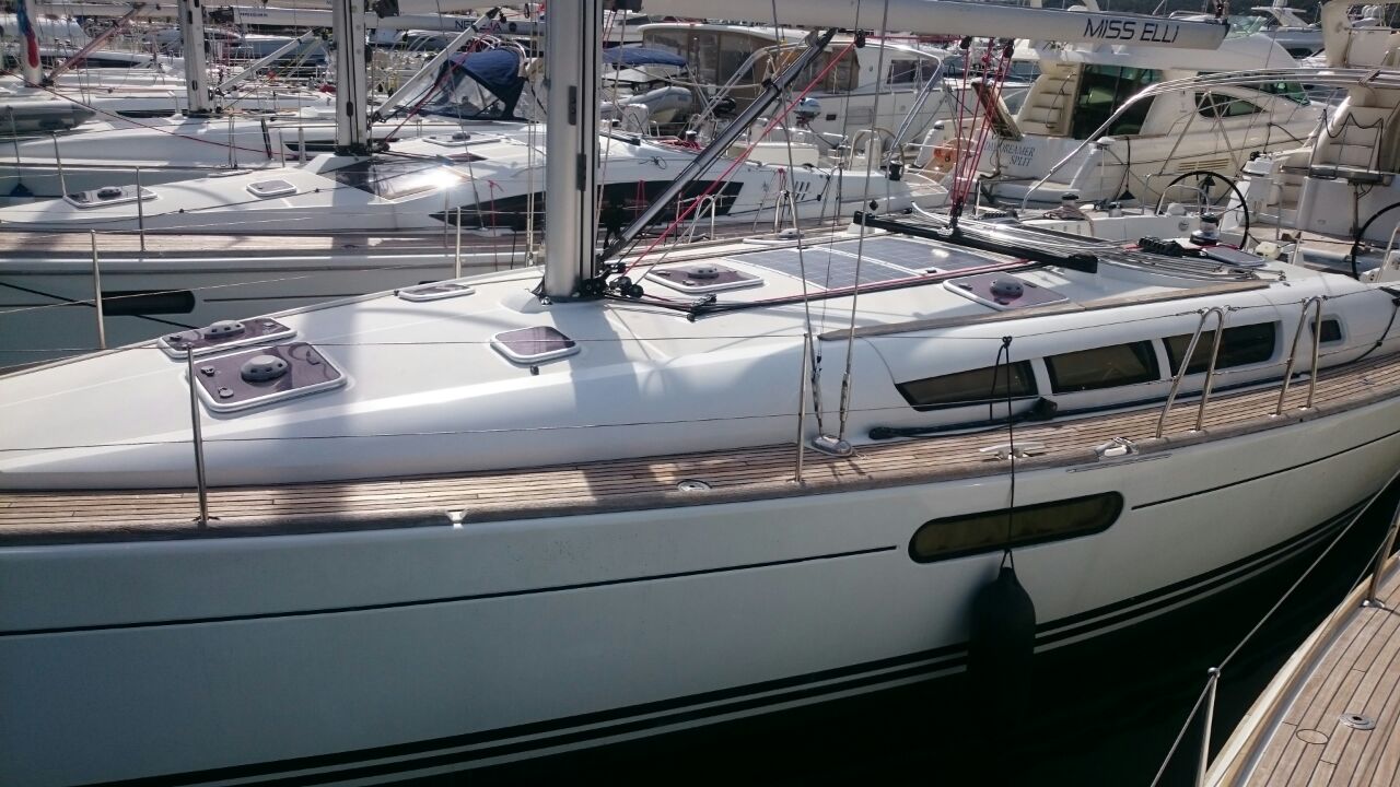 | Outside | 12 V-Anschluss, Anker mit Kette, Badeleiter, Badeplattform, Biminitop, Cockpitdusche, Cockpitlautsprecher, Cockpittisch, elektr. Ankerwinsch, elektr. Winsch, Fender, Festmacherleinen, Gangway, Segel-Flickwerkzeug, Solaranlage, Sprayhood, Teak im Cockpit, Teakdeck, Treibanker, Wasserschlauch, Windex |